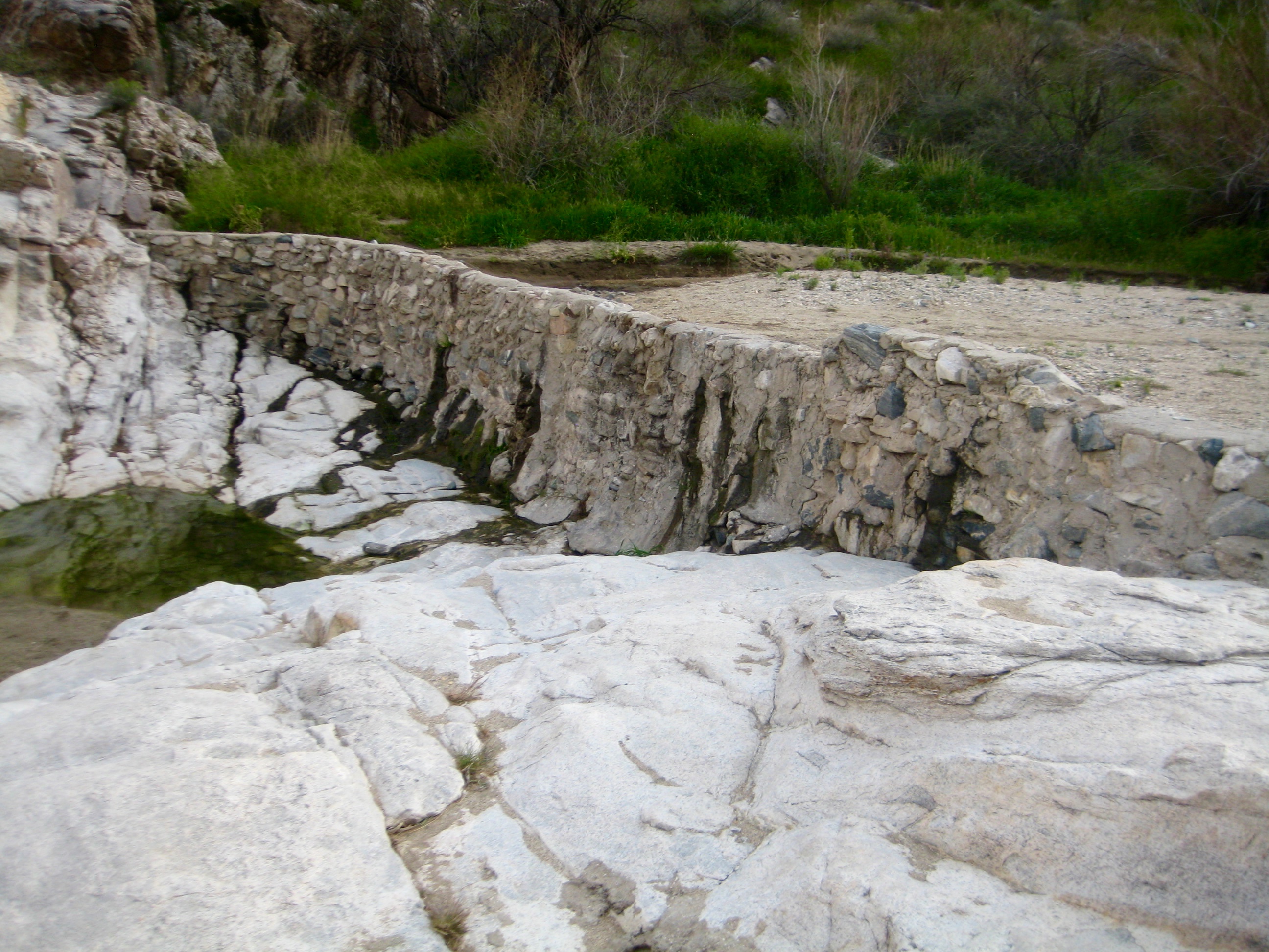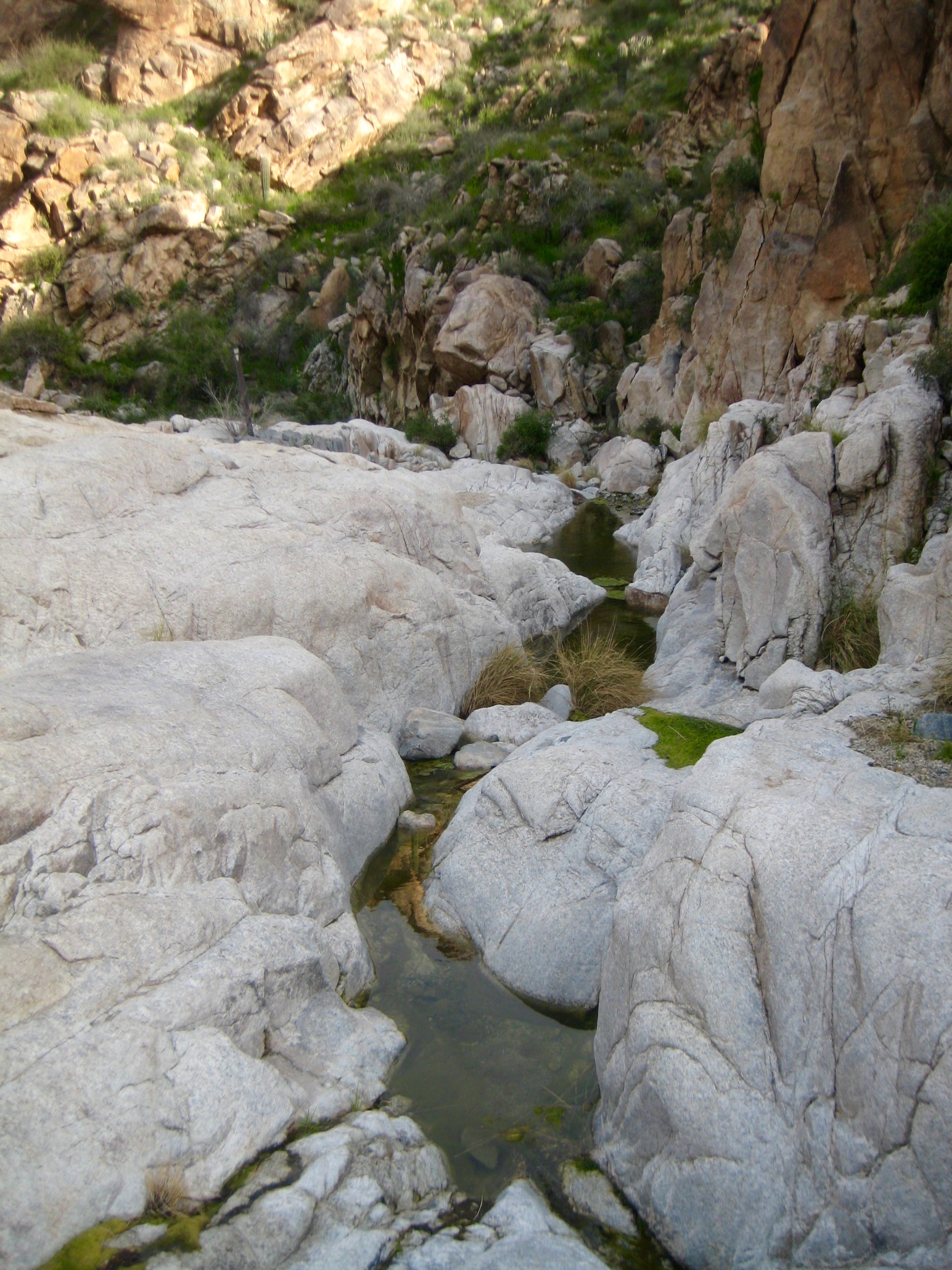 The canyon gradually became a narrow channel with polished rock slabs and small pools of water. I passed an old rubble-and-mortar dam along the way (2.5 hours + 1650 feet from TH).
