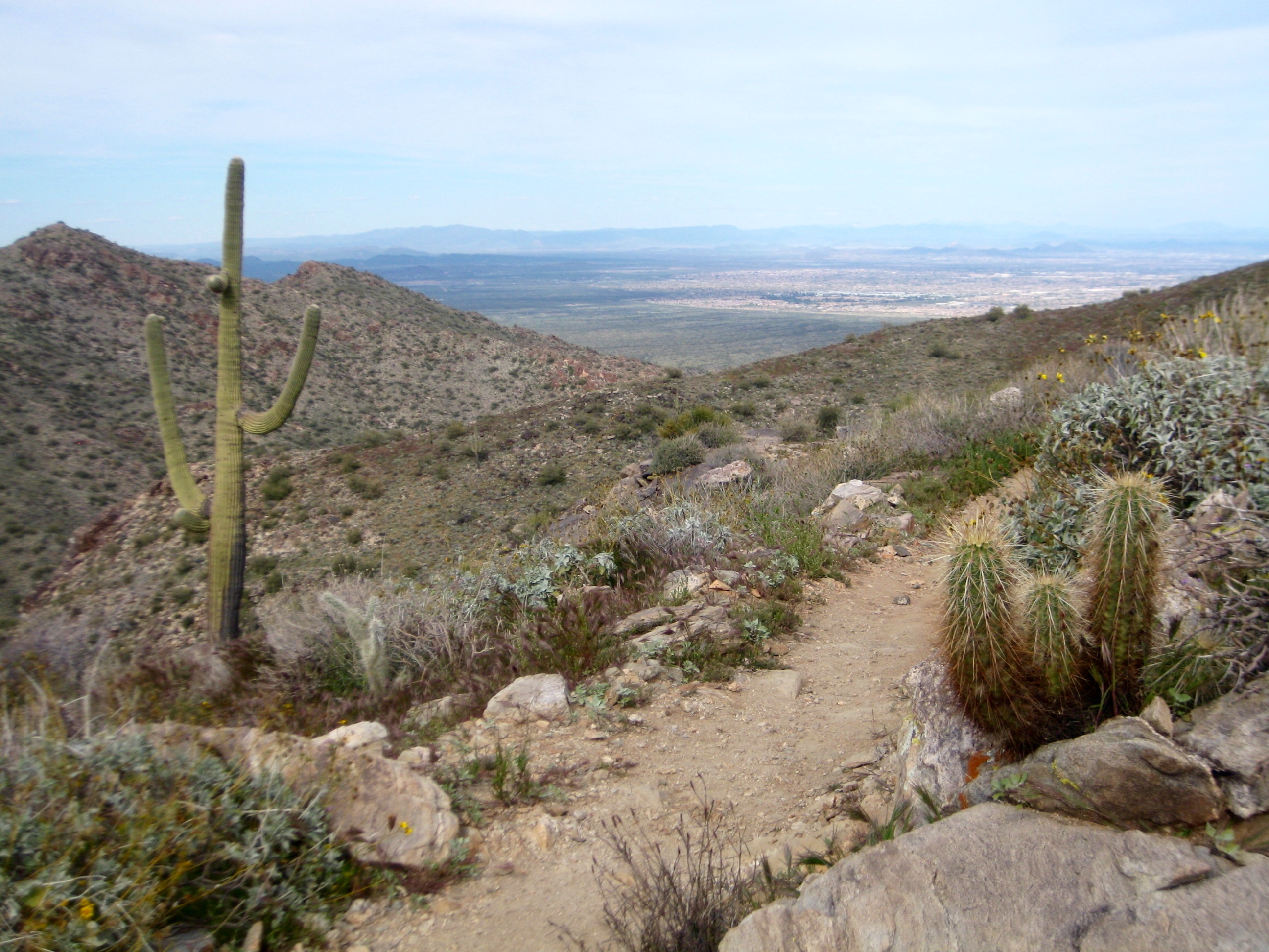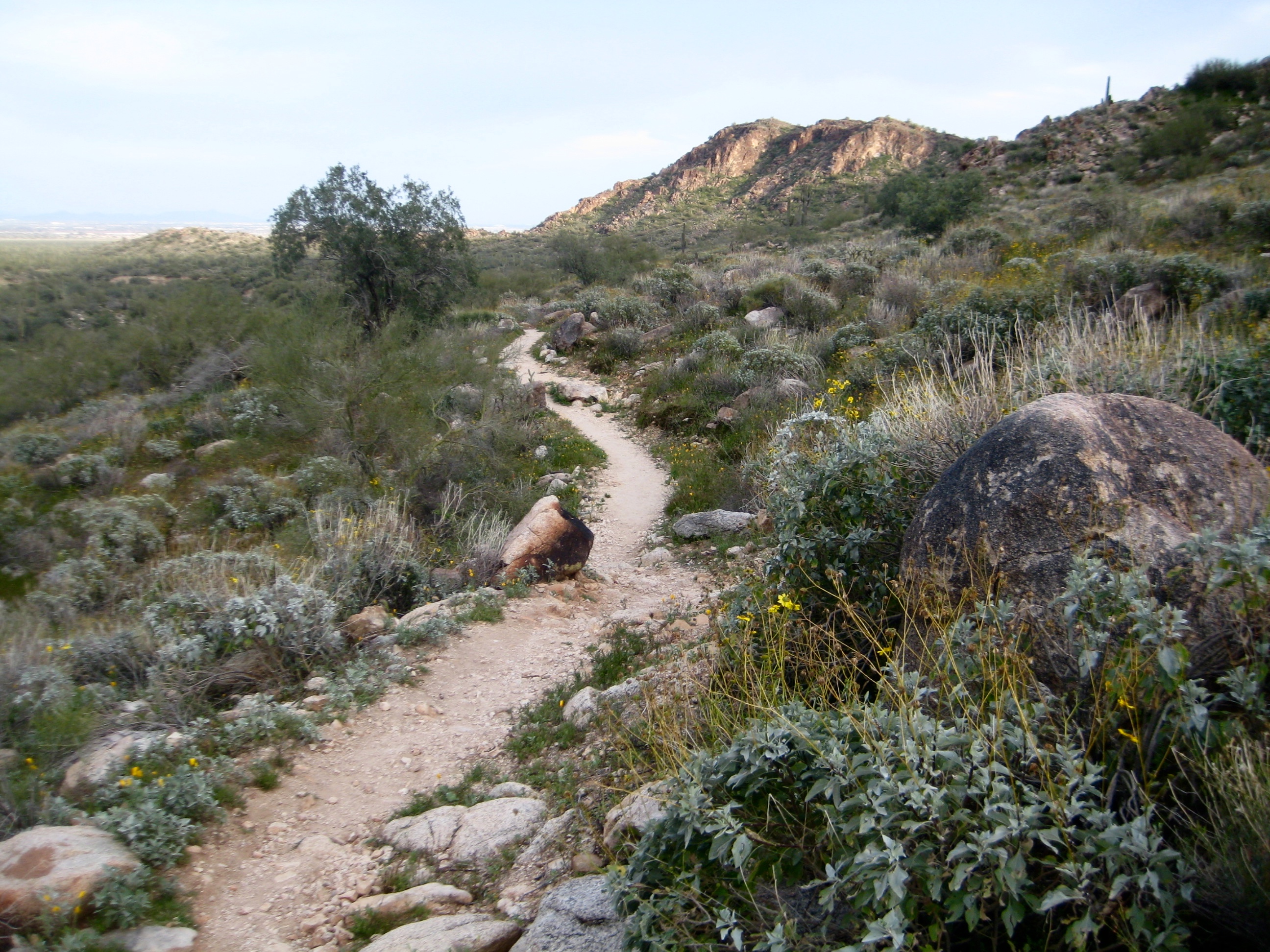 From the Mesquite Canyon / Waddell Trailhead, I started up the Mesquite Canyon Trail. The terrain along this trail epitomizes Arizona desert hiking: rocks, lizards, cacti, scrub bushes, and wildflowers galore—all within sight of the Phoenix metropolis.
