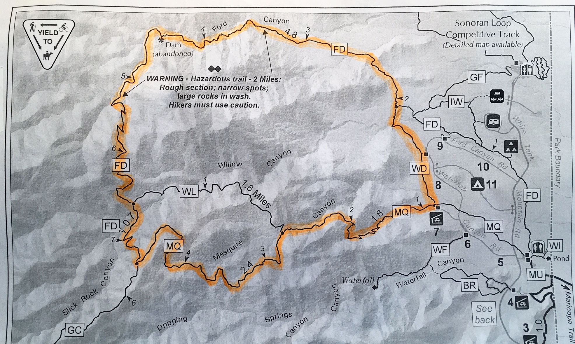 Way Points: Mesquite Canyon Trail / Willow Canyon Trail junction & Mesquite Canyon Trail / Ford Canyon Trail junction & Upper Willow Creek crossing & Ford Canyon Trail / Willow Canyon Trail junction & Upper Ford Creek crossing & Ford Canyon Dam & Willow Canyon Flats & Ford Canyon Trail / Waddell Trail junction & Mesquite Canyon Flats & Mesquite Canyon / Waddell Trailhead (trail hike via Mesquite Canyon Trail–Ford Canyon Trail–Waddell Trail)