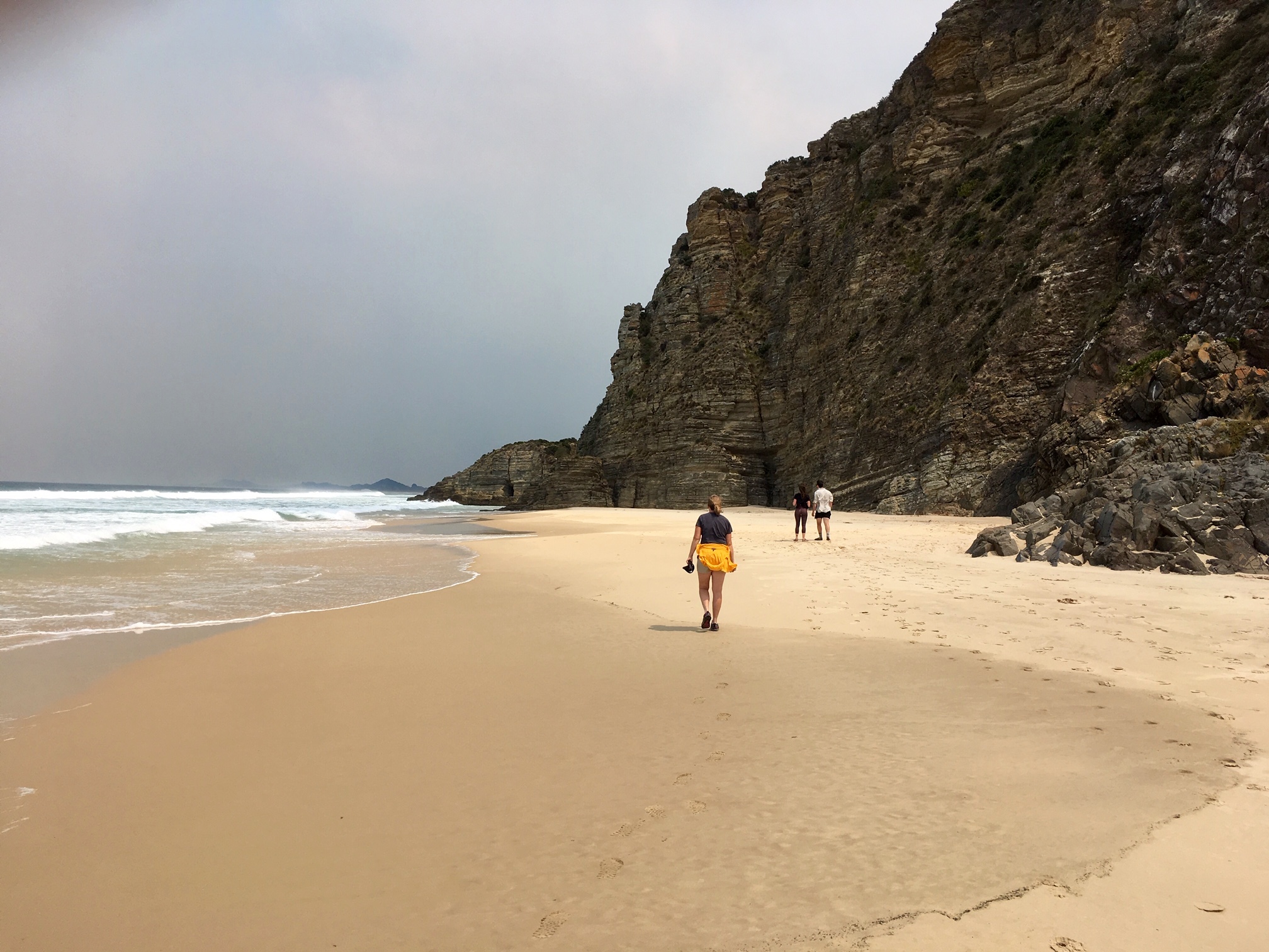Moorina Beach is a ribbon of tan-colored sand interspersed with tall cliffs of horizontally layered conglomerate.