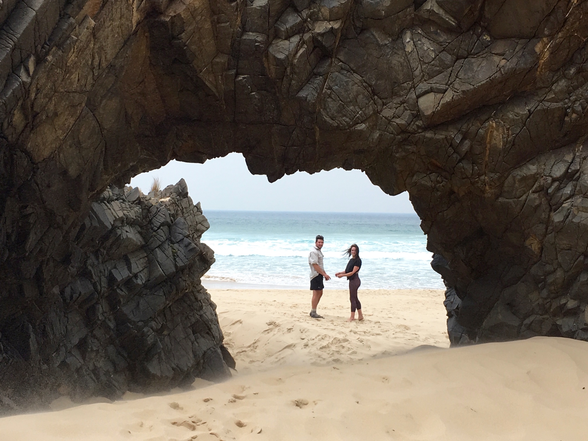 Cal & Brooke stand under natural rock arch at Moorina Beach