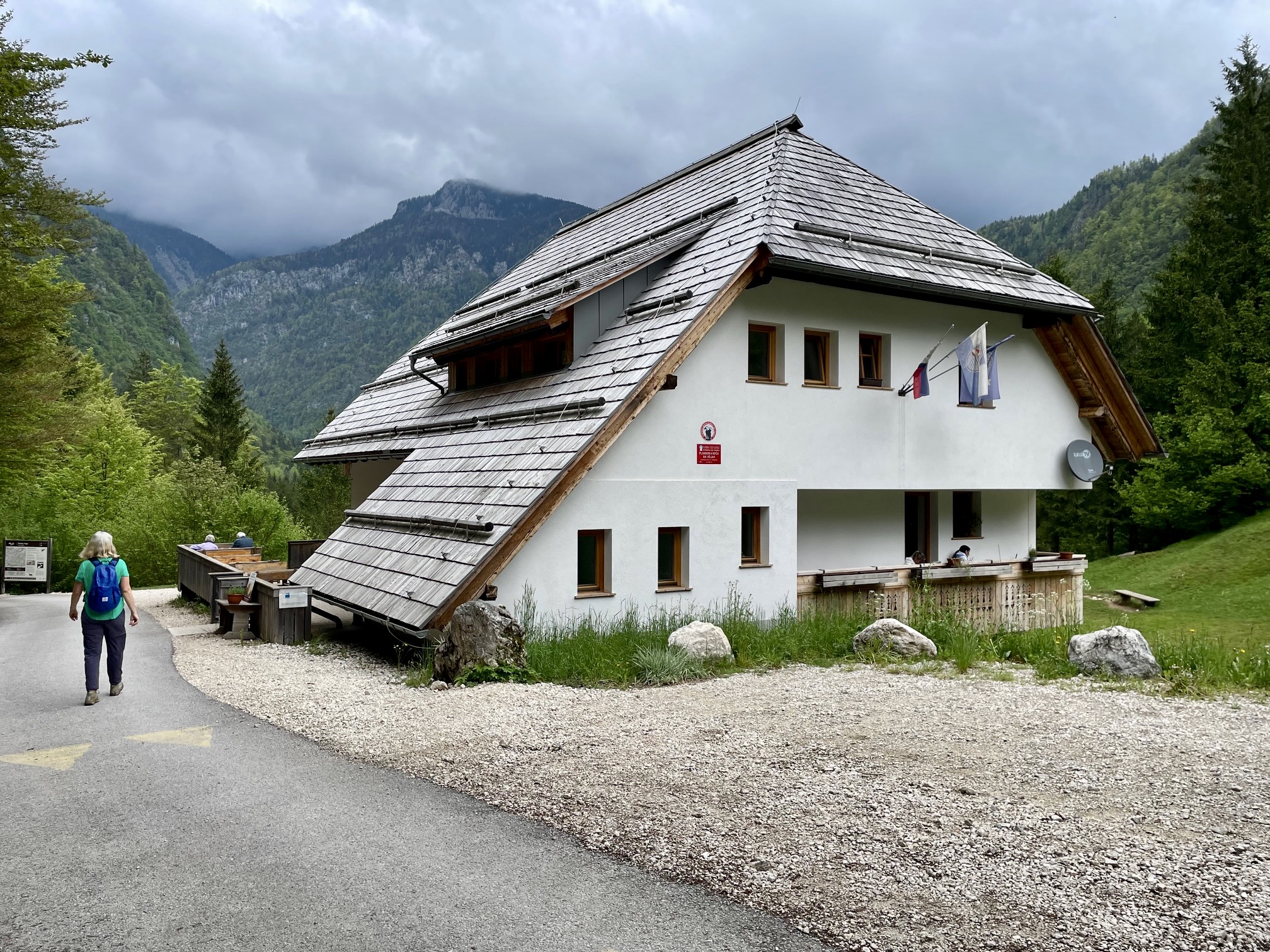 Beyond the gorge’s upper extent, the trail merges with a road that leads to Vojah Hut. All of Slovenia’s alpine huts were still closed for the winter season at the time of our visit, but this forest hut was open for business. It was nearly noon when we arrived (1.5 hours + 550 feet from starting point), so we stopped here to eat our lunch.