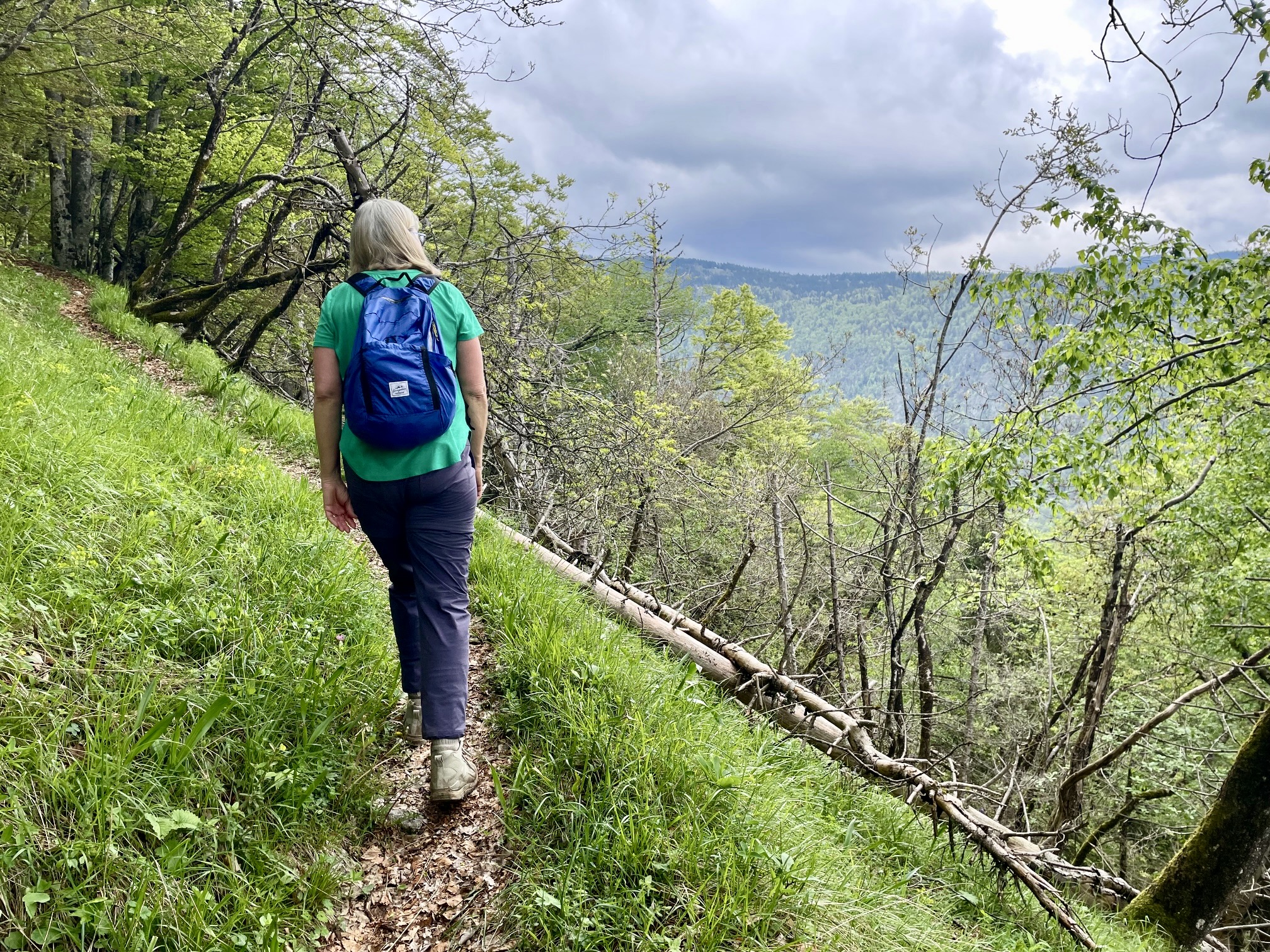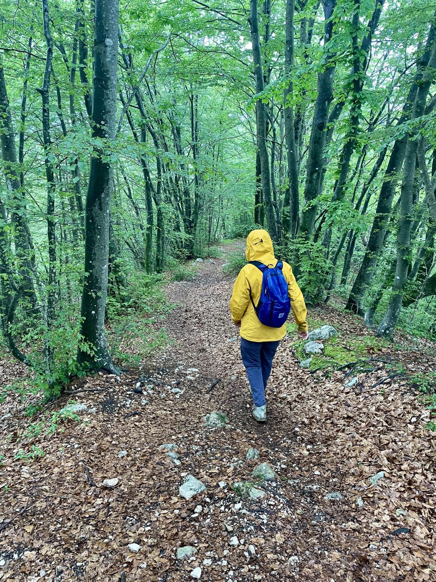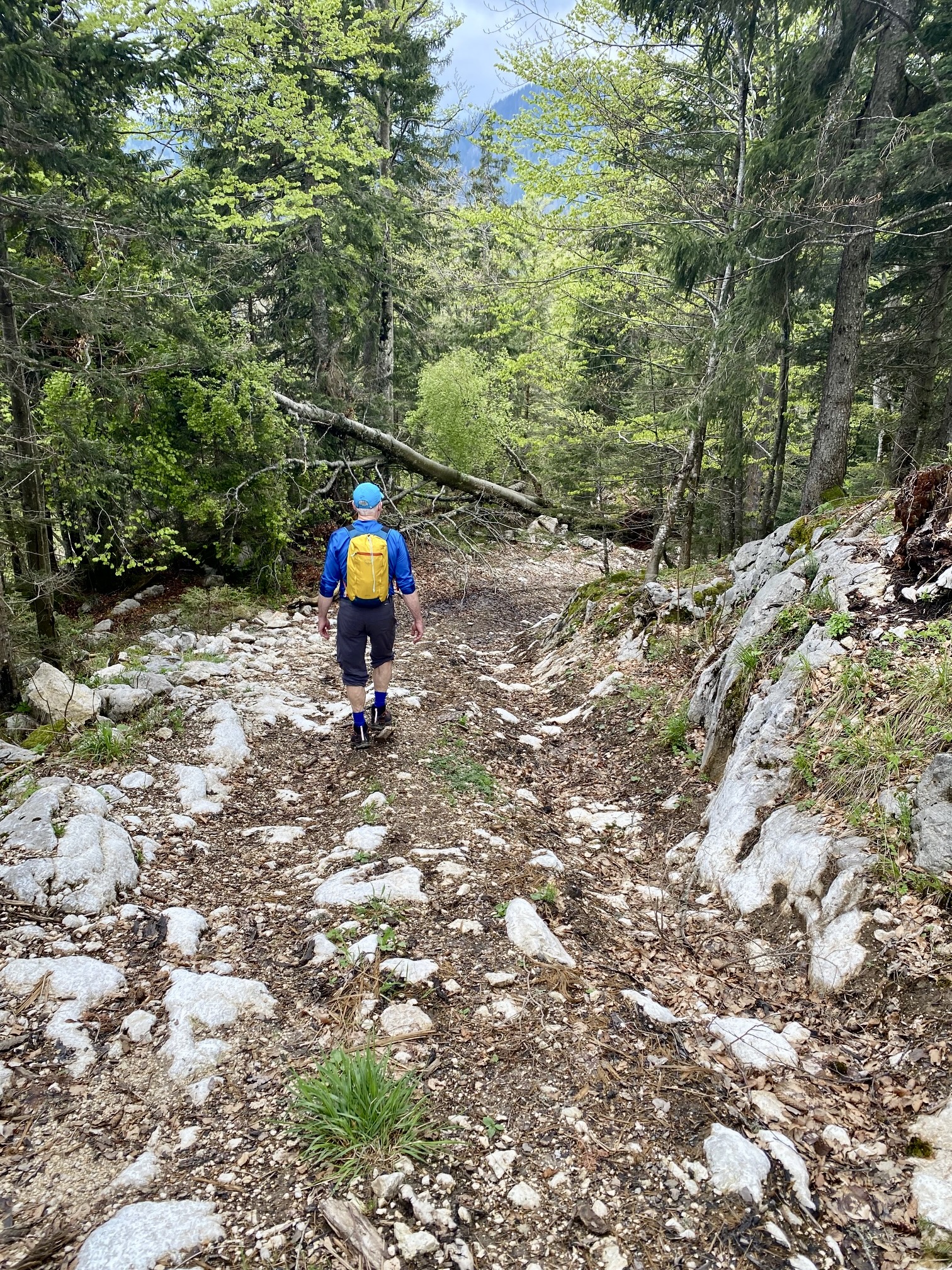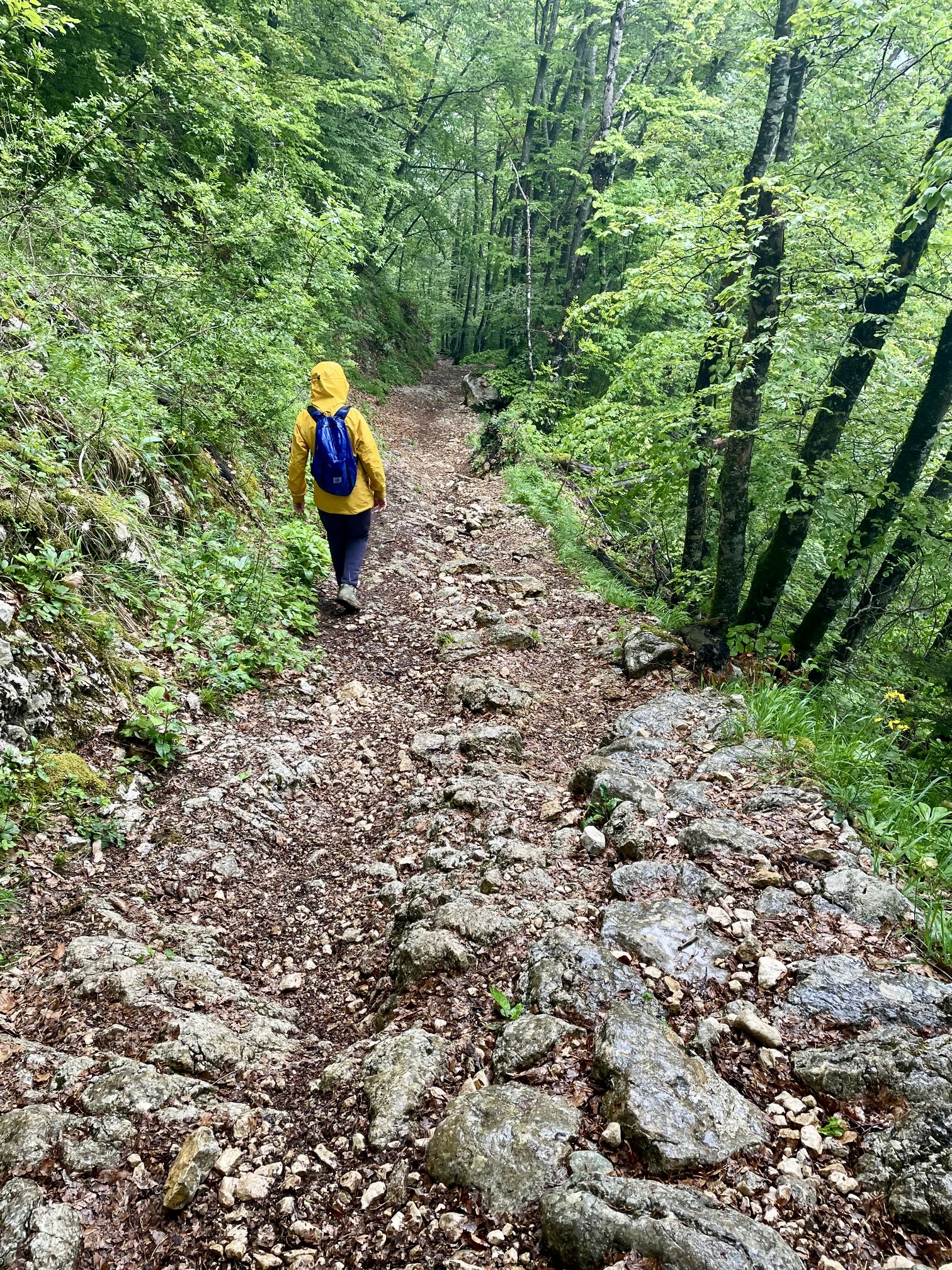 We continued hiking down the well-traveled launch-site trail until able to branch off to the right on an unmarked trail that descended directly toward the Mostica Gorge Trailhead. Both trails consisted of boot-polished limestone bedrock, which was now even more slippery due to the rain. We carefully picked our way down, barely managing to stay upright at times. Thankfully, the polished limestone transitioned to dirt and gravel as we lost elevation.