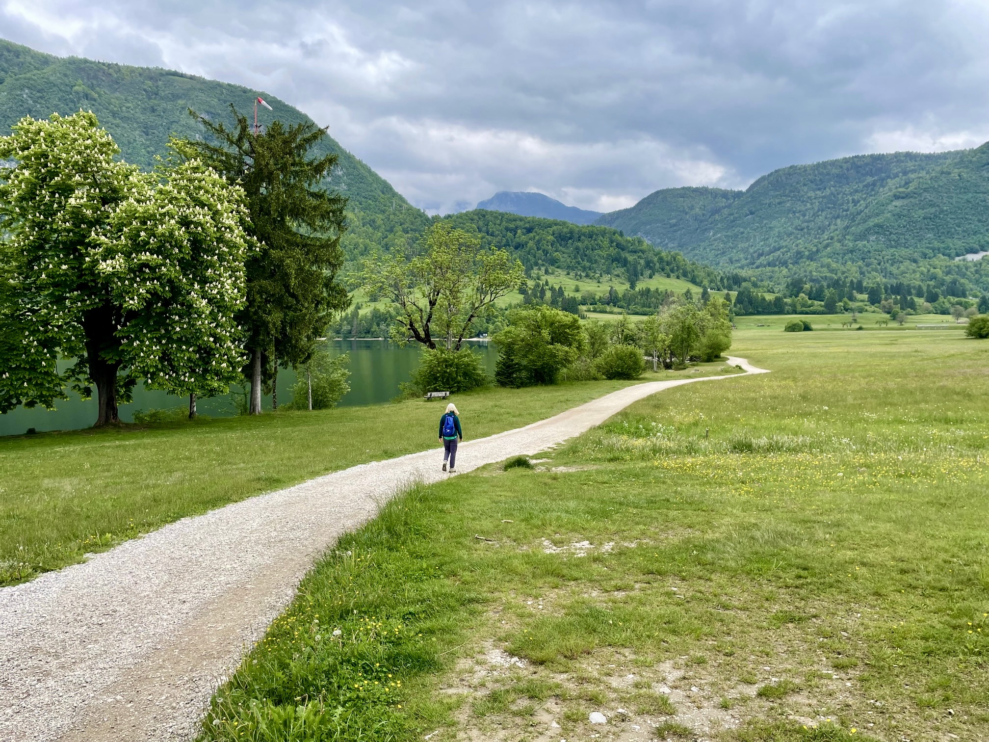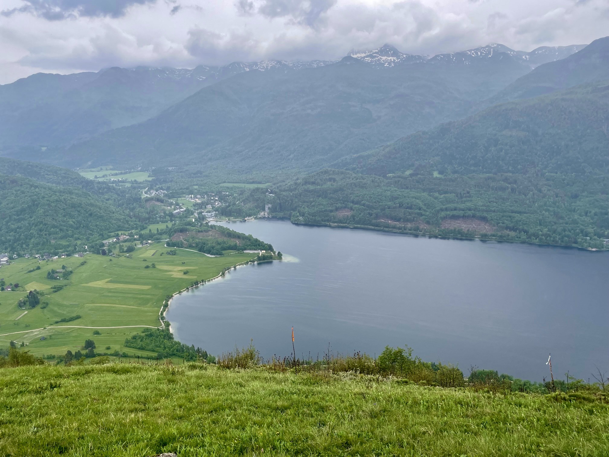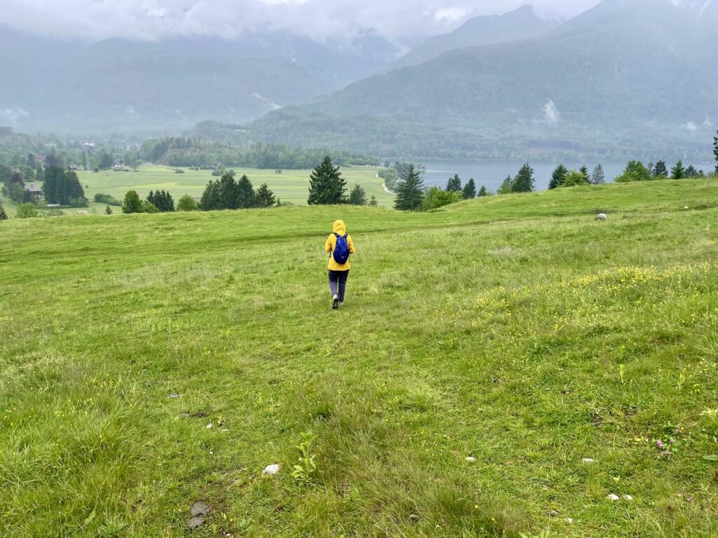 Eventually, we broke out of the dense forest and intersected our up-route in the grassy pastureland above Lake Bohinj. It was then a relatively quick—but wet—jaunt back to our starting point in late afternoon (6.8 hours total loop). It had been an interesting trek with some dramatically varied scenery and terrain. We would not likely ever repeat this loop, but it did give us a thorough perspective on the Mostnica Valley.