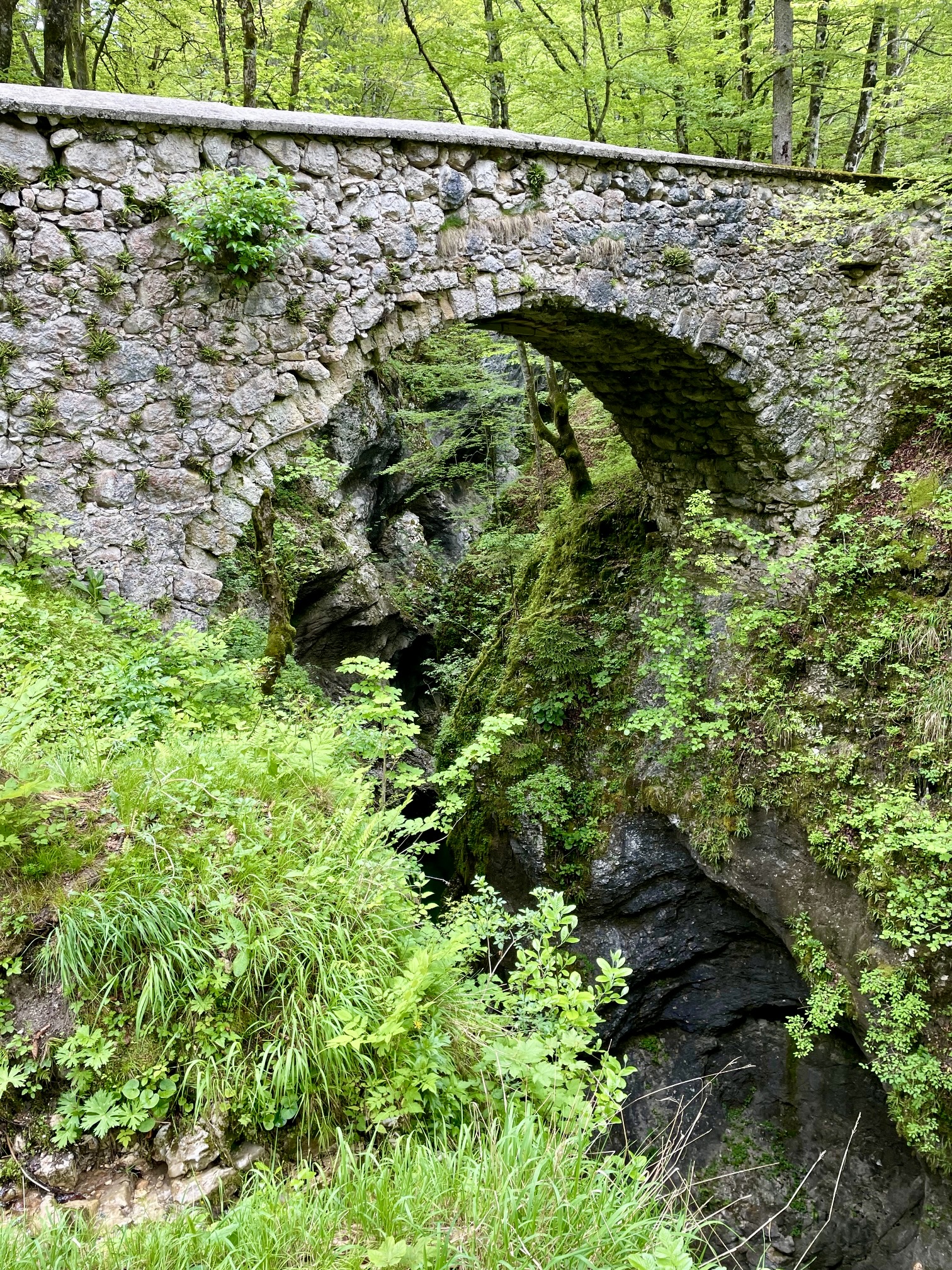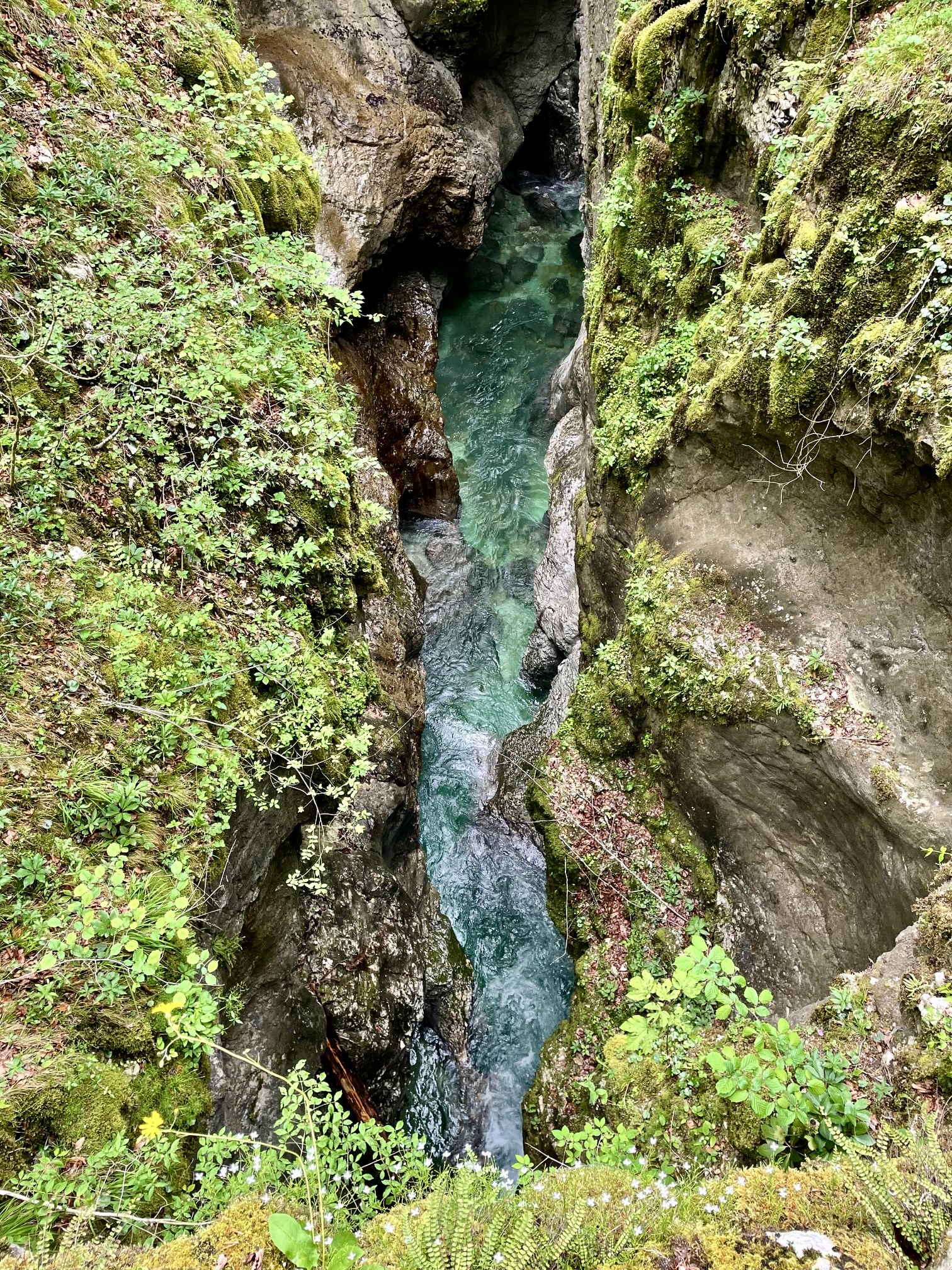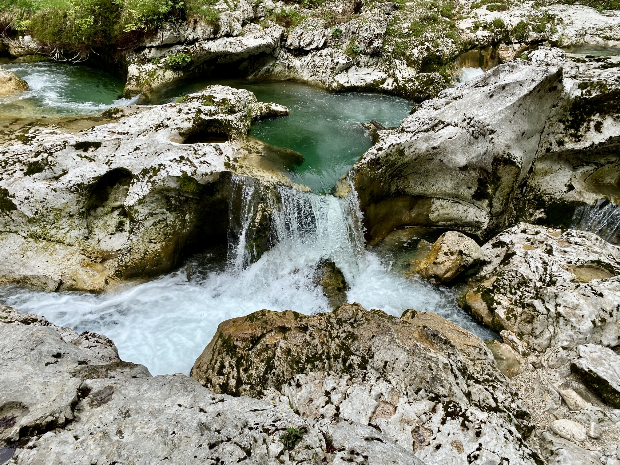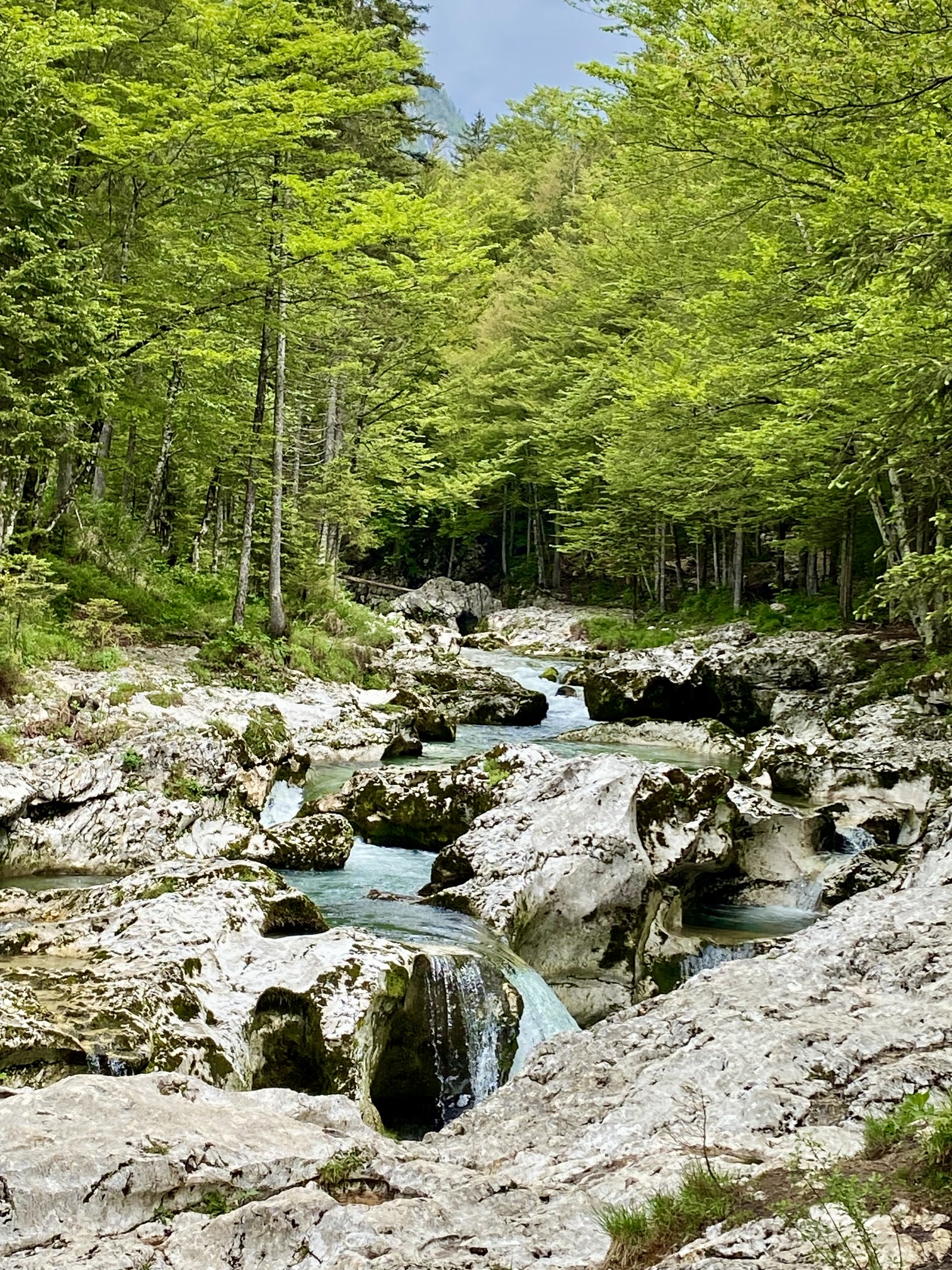 We soon entered the heart of Mostnica Gorge. In many places, the gorge consists of a strikingly narrow channel—barely an arm span wide—that cuts tortuously through the limestone bedrock. In other places, it broadens out and comprises a convoluted swath of slabs, drops, and potholes. Throughout, the Mostnica River flows swiftly and loudly between steep walls and over polished boulders.