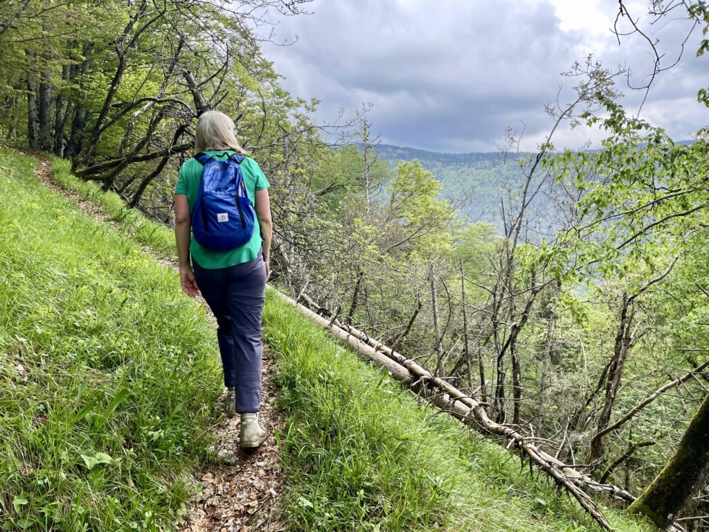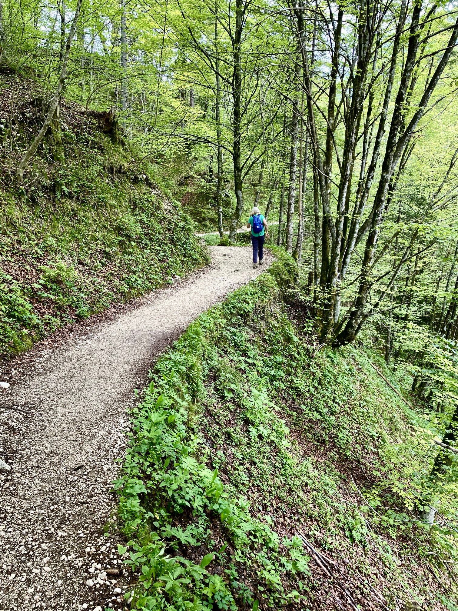 We curved around the lakeshore on a wide gravel trail (part of the long-distance Juliana Trail) and then followed a series of faint paths up through grassy slopes to the upper trailhead. From there, we headed up the official Mostnica Gorge Trail, past a staffed ticketing kiosk (tickets were 3 euros per person).