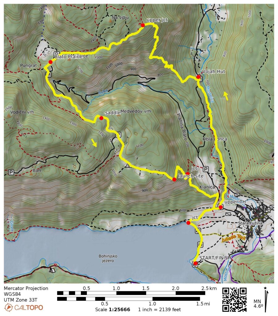 Way Points: Mostnica Gorge Trailhead & Mostnica Gorge ticket kiosk & Vojah Hut & upper trail junction & Blato Prairie & Medvedov Saddle & Zgornji Vogar Prairie & paraglider launching site & Mostnica Gorge Trailhead & Lake Bohinj Trail junction & Lake Bohinj Trailhead (trail hike)