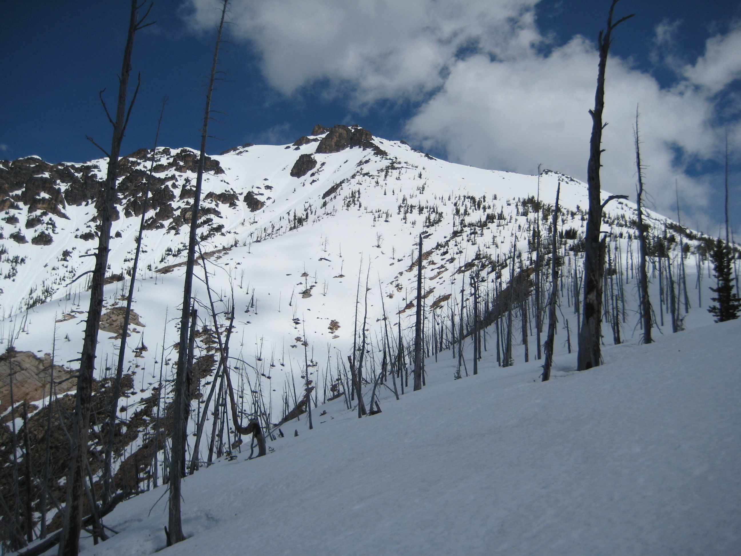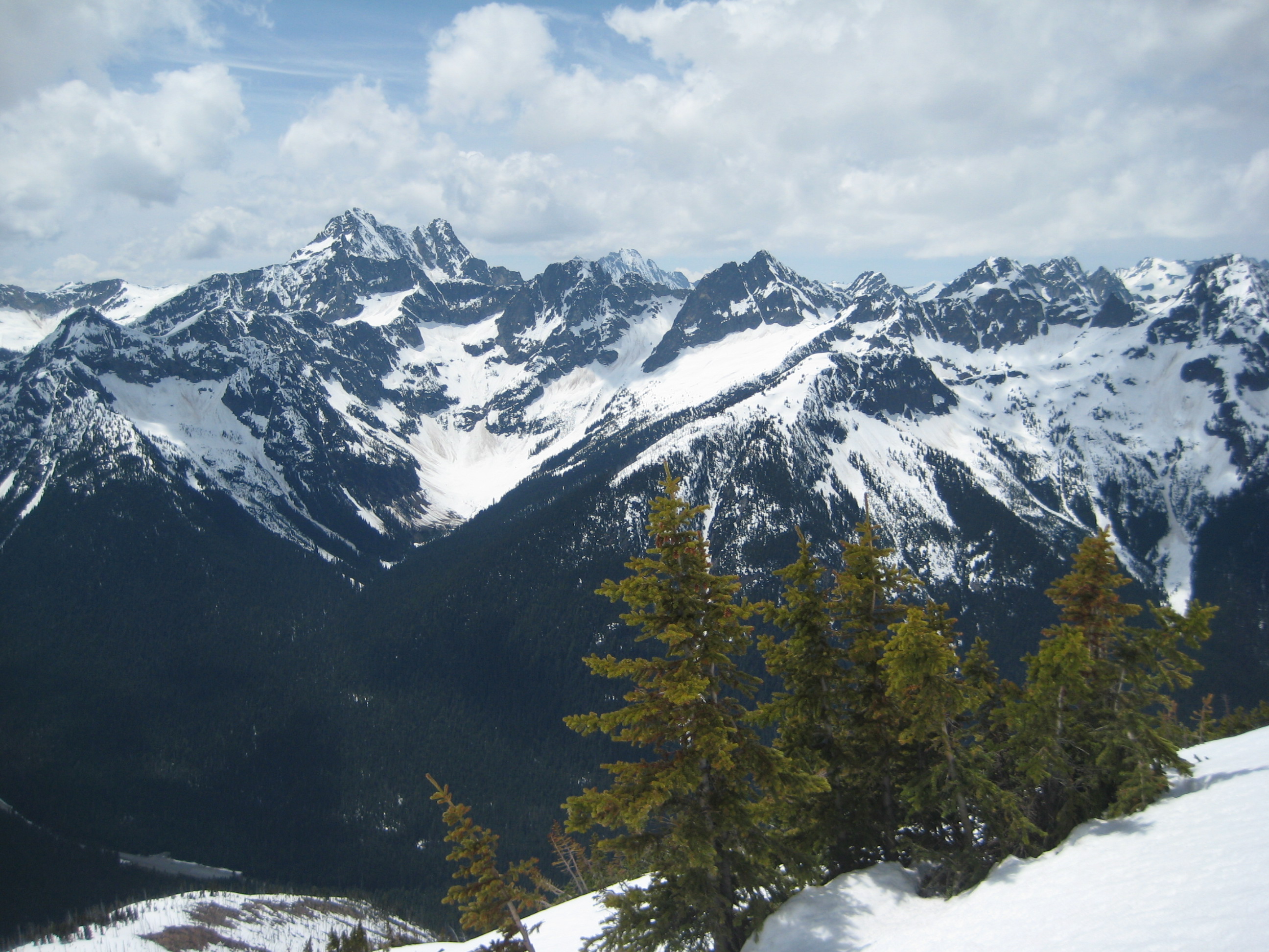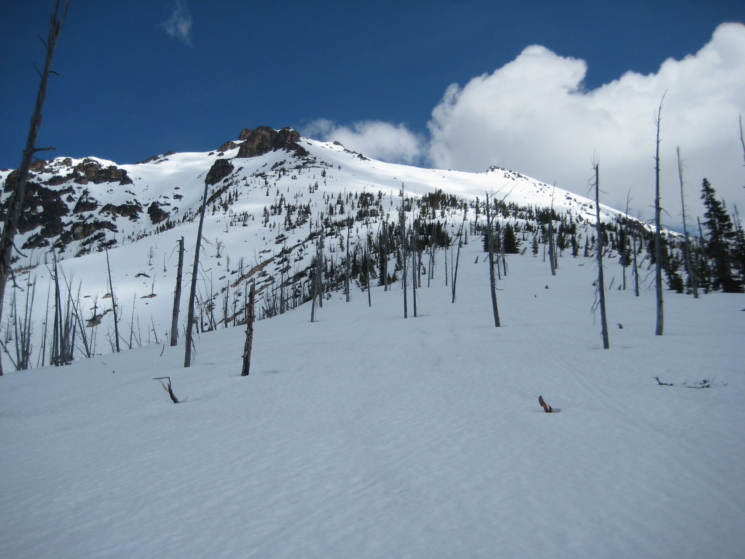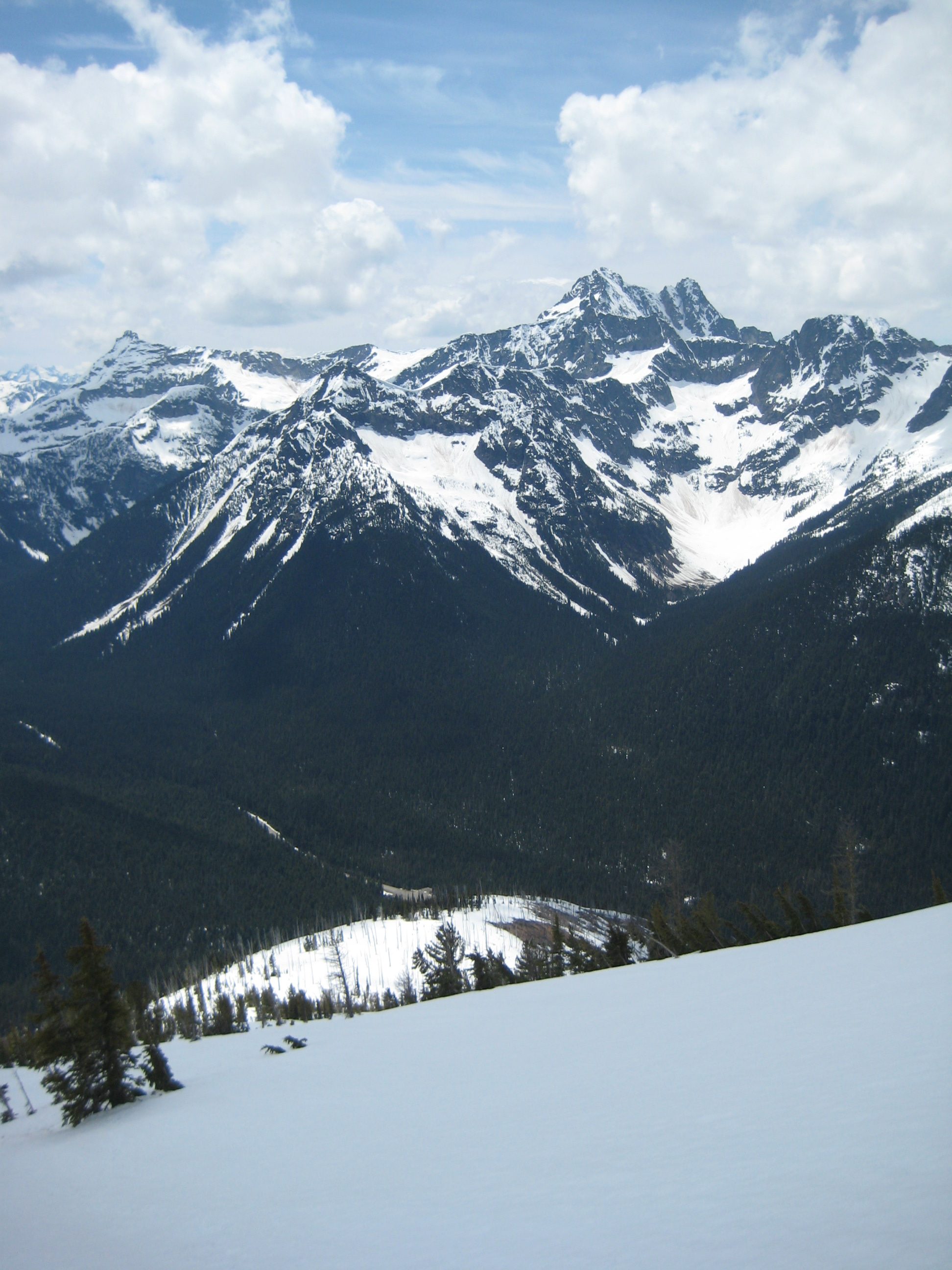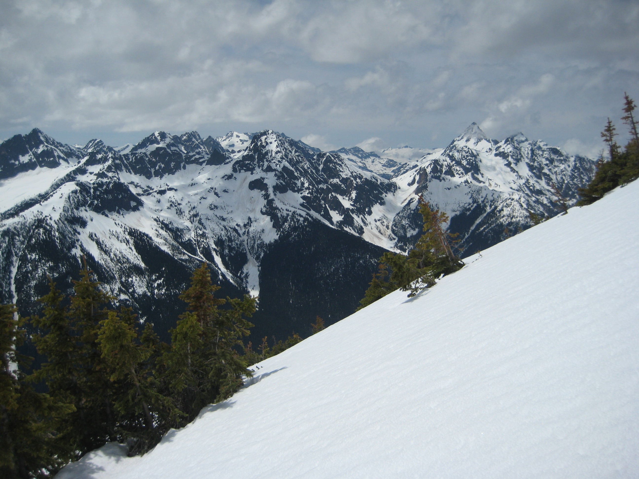 For the second part of our double-header weekend in the Rainy Pass / Washington Pass area last weekend, Eileen and I parked at the Swamp Creek pullout on Hwy 20, walked across the bridge, and headed into the forest. After an initial stretch of thick trees, we soon found ourselves in open forest on a northeast-trending rib between two creeks. This extended upward for 1000 feet, then transitioned into an unpleasant burn area for another 500 feet. At 5700 feet, we encountered continuous snow cover and very enjoyable terrain on a sweeping ridge.