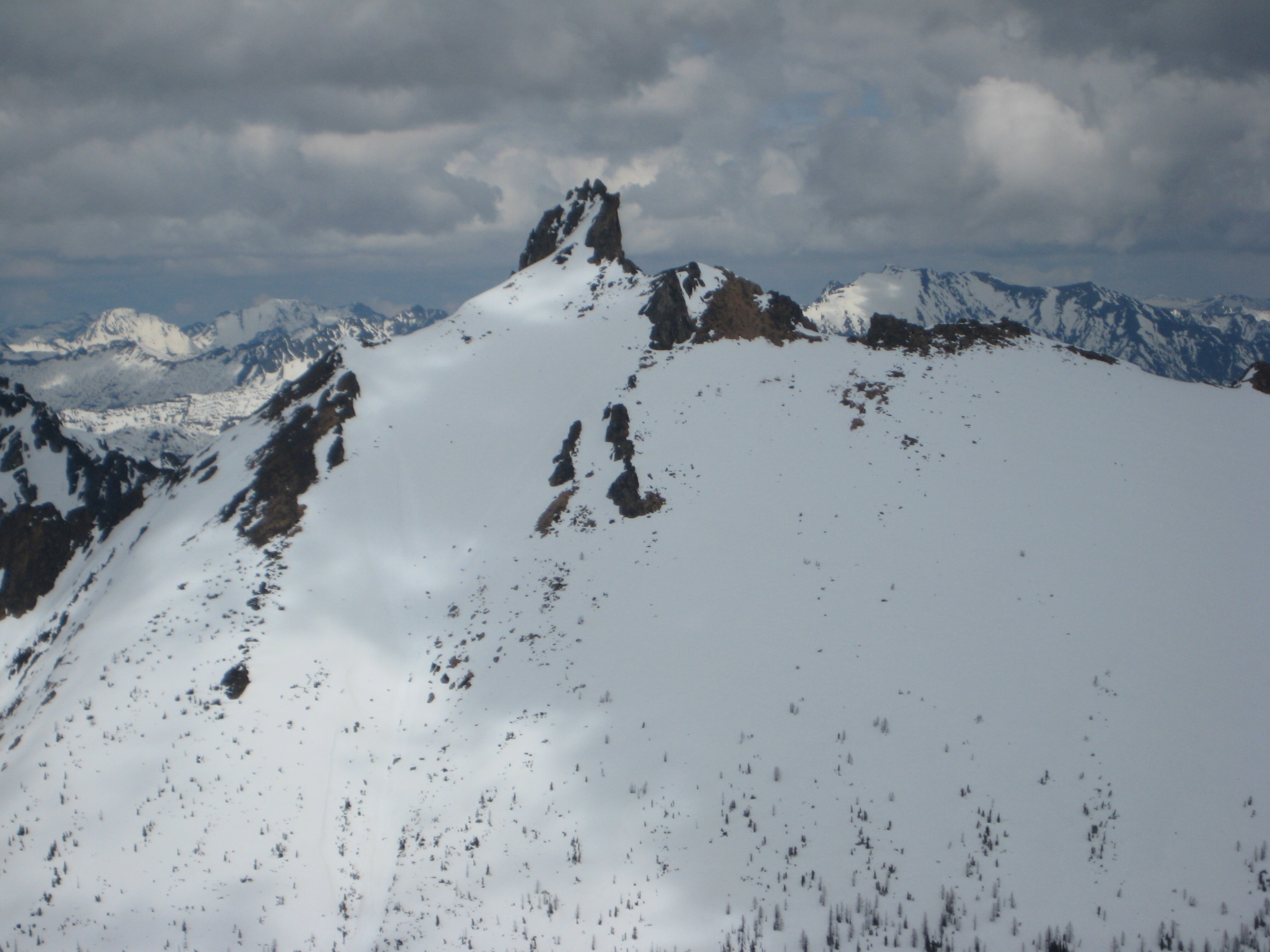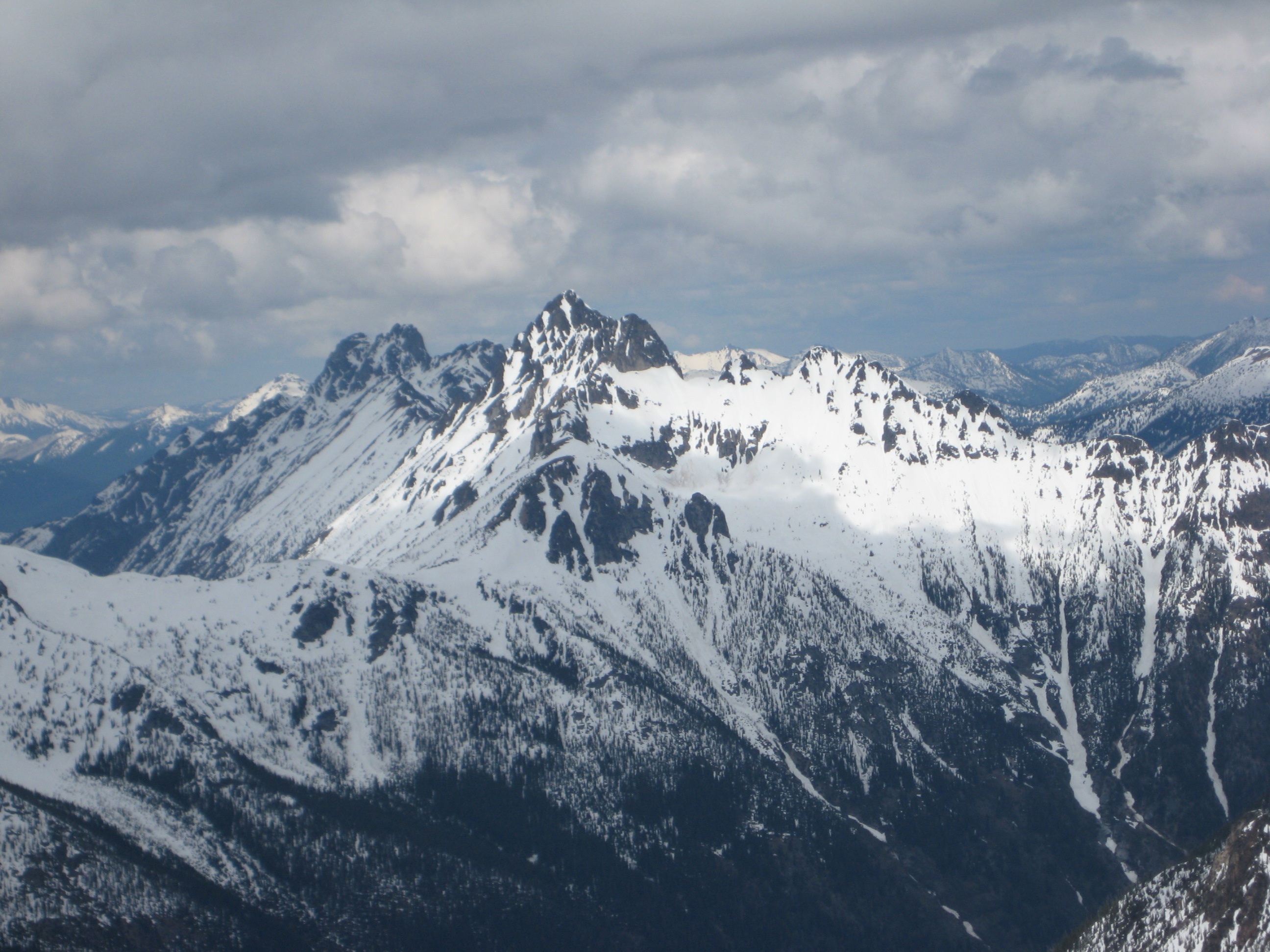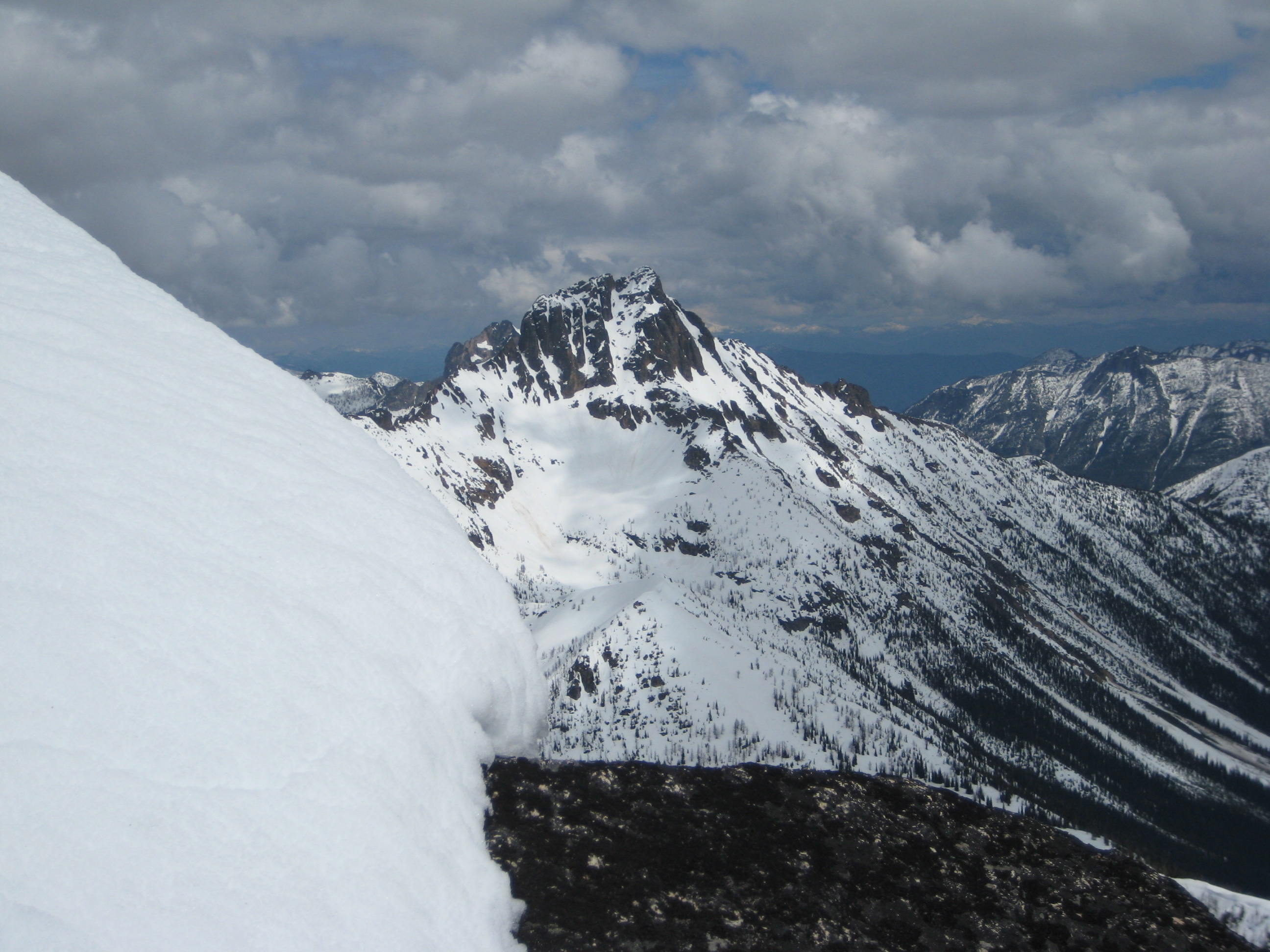 I proceeded up steepening snow slopes to the sharp ridge crest, then jogged left before climbing the final 40-degree snow finger to the summit rocks. The views of Ragged Ridge and the Methow peaks were outstanding, despite clouds moving in. Mt. Hardy is really a “sleeper” peak within the Upper Methow Mountains; it is not very well known but yet has great projection, healthy prominence, a jagged summit crest, and a breathtakingly steep northeast face.