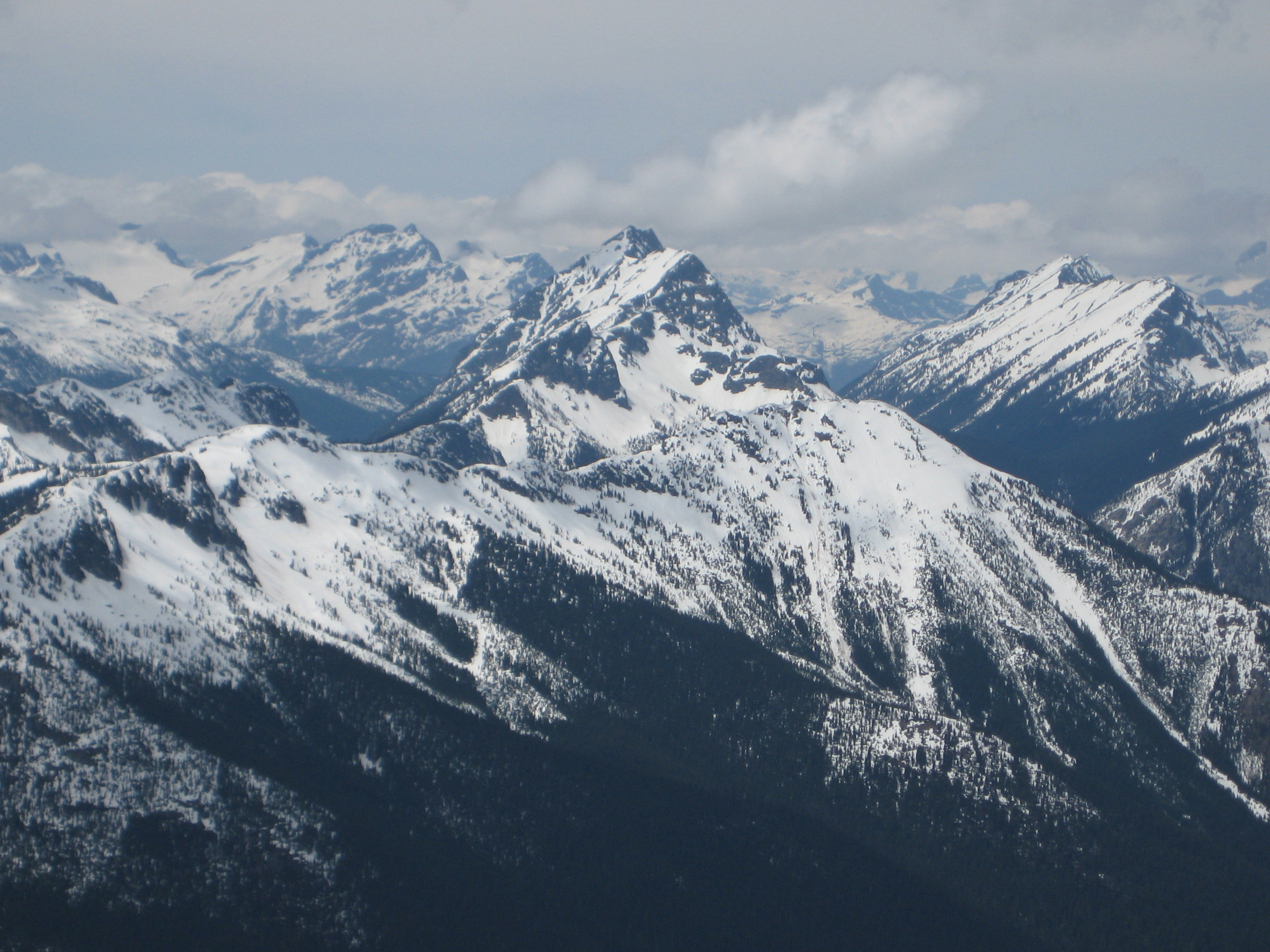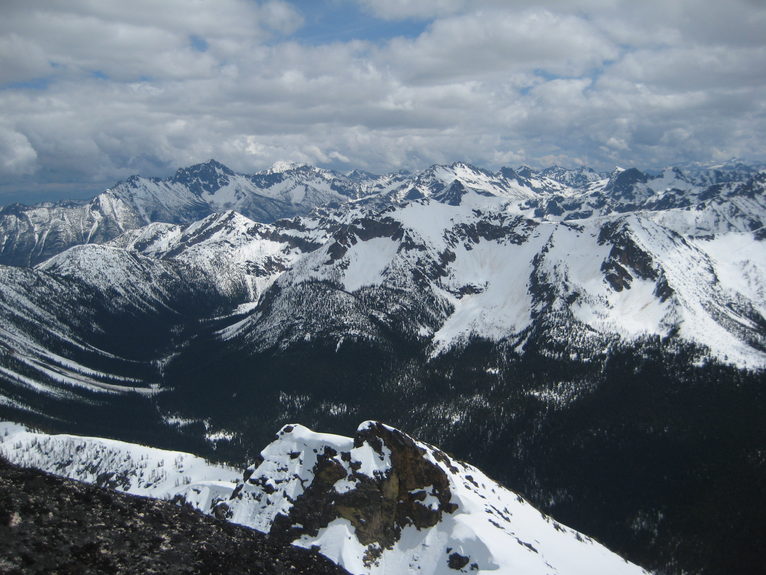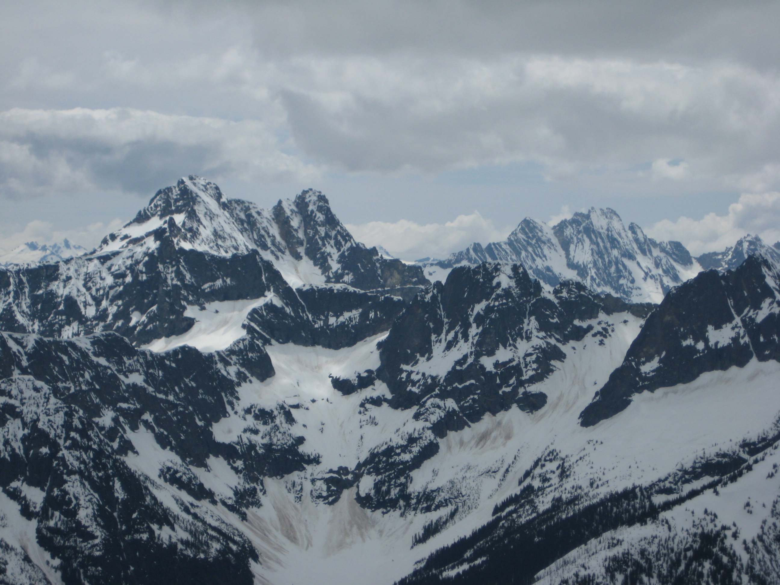 I proceeded up steepening snow slopes to the sharp ridge crest, then jogged left before climbing the final 40-degree snow finger to the summit rocks. The views of Ragged Ridge and the Methow peaks were outstanding, despite clouds moving in. Mt. Hardy is really a “sleeper” peak within the Upper Methow Mountains; it is not very well known but yet has great projection, healthy prominence, a jagged summit crest, and a breathtakingly steep northeast face.