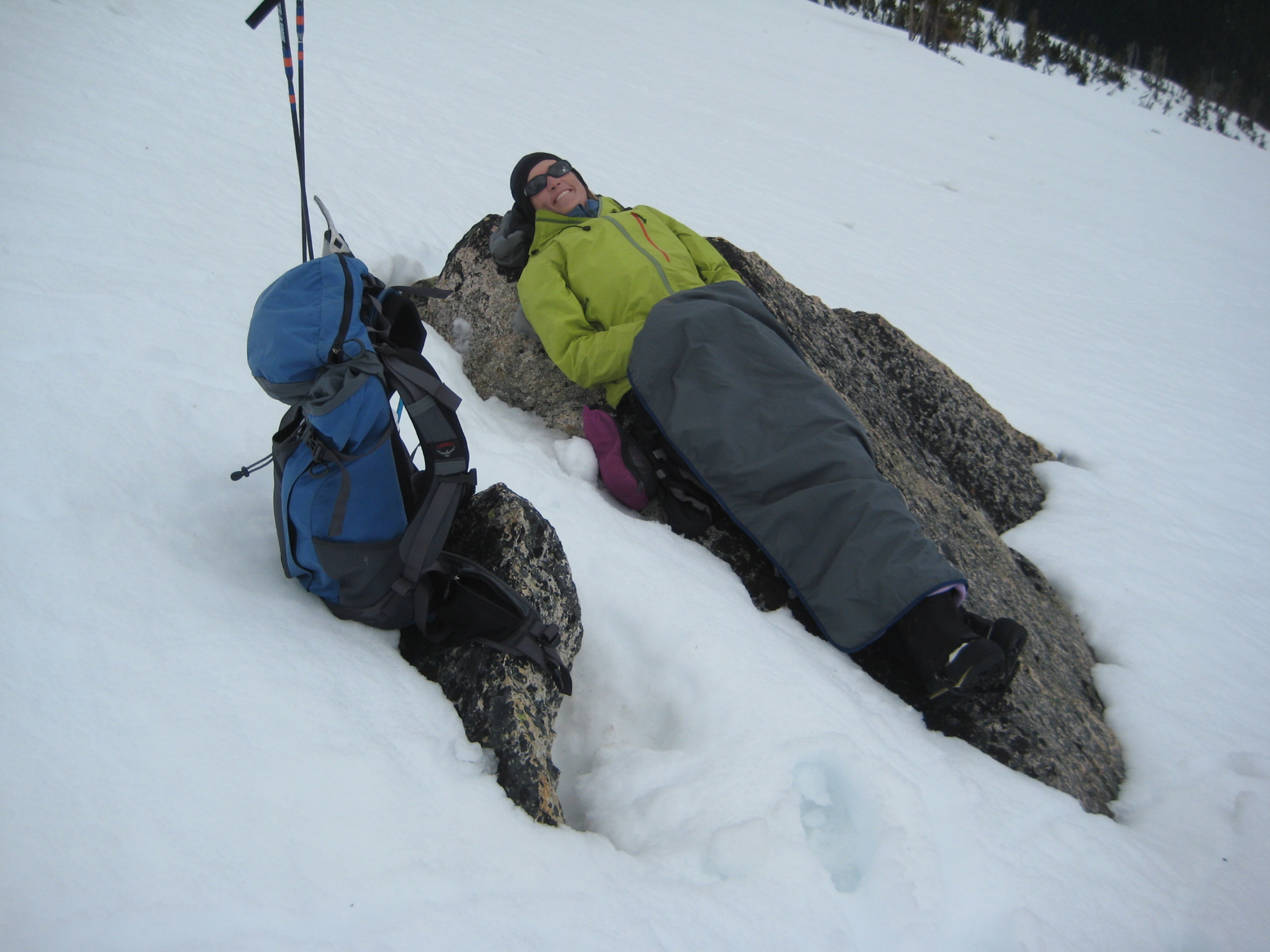 The unstable snow prompted me to hug ridge crests and rock margins, but I still managed a quick descent back to where Eileen was relaxing on a high boulder. We continued glissading and booting back to snowline, then made an uneventful plunge to the car.