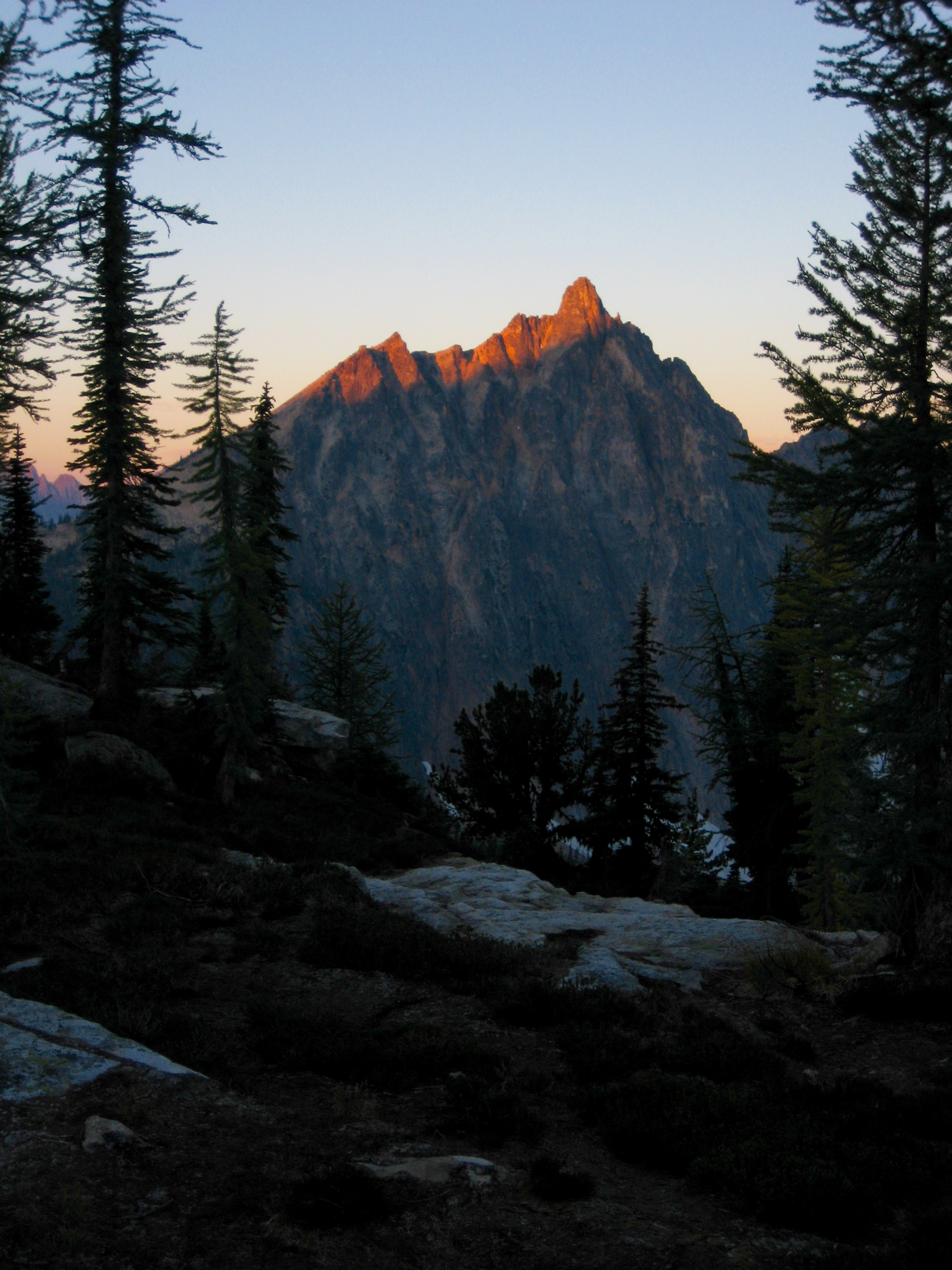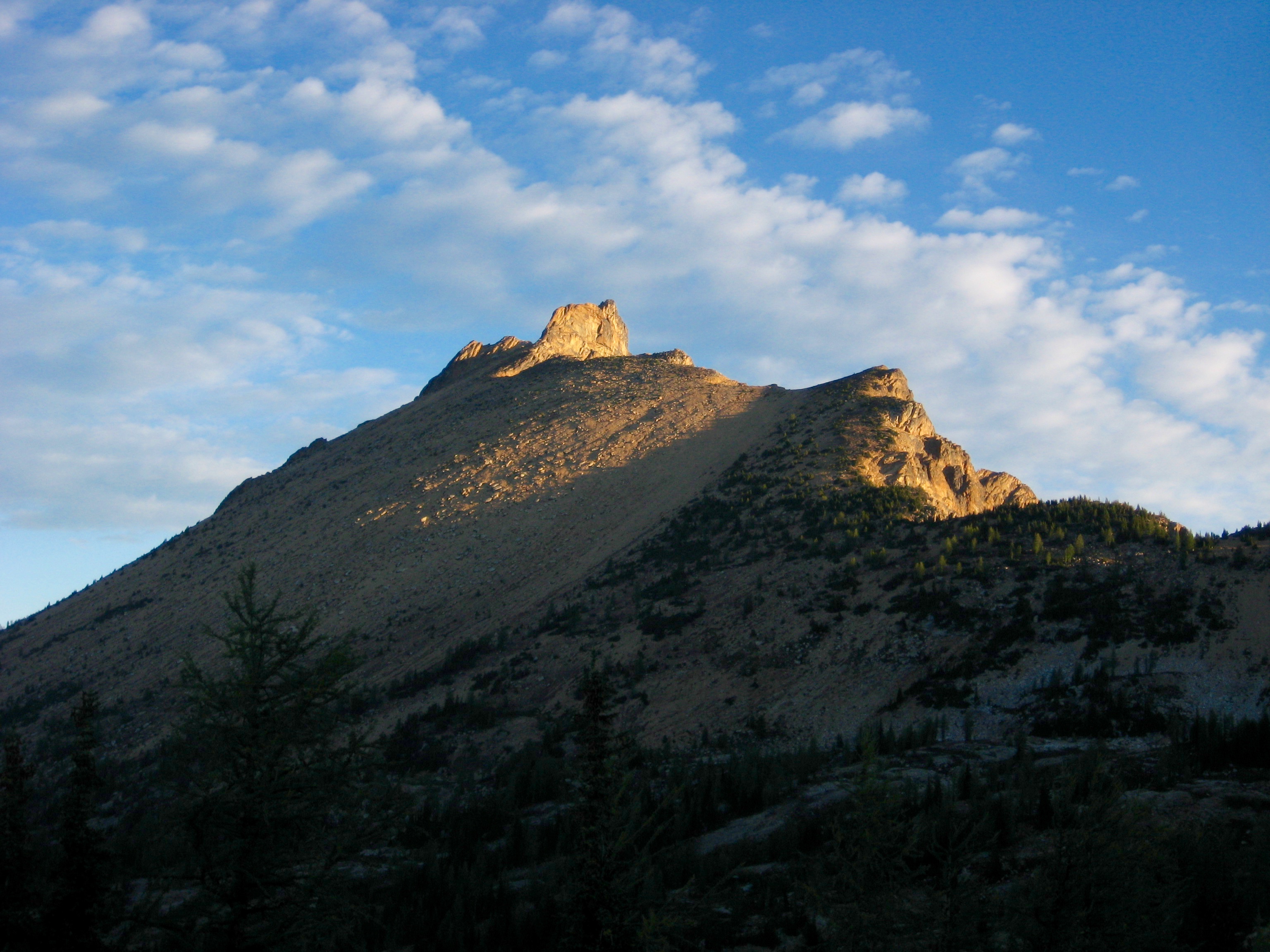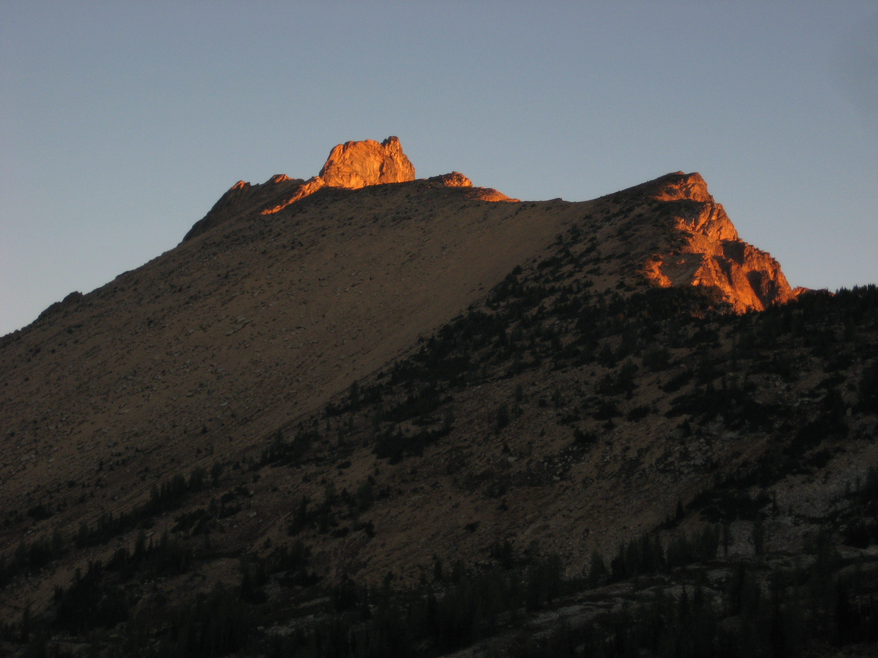 Knowing that rain was due to arrive in the afternoon, we were up at 6:00am and out of camp by 7:30am. The sky was clear, and morning sun lit up the surrounding summits.