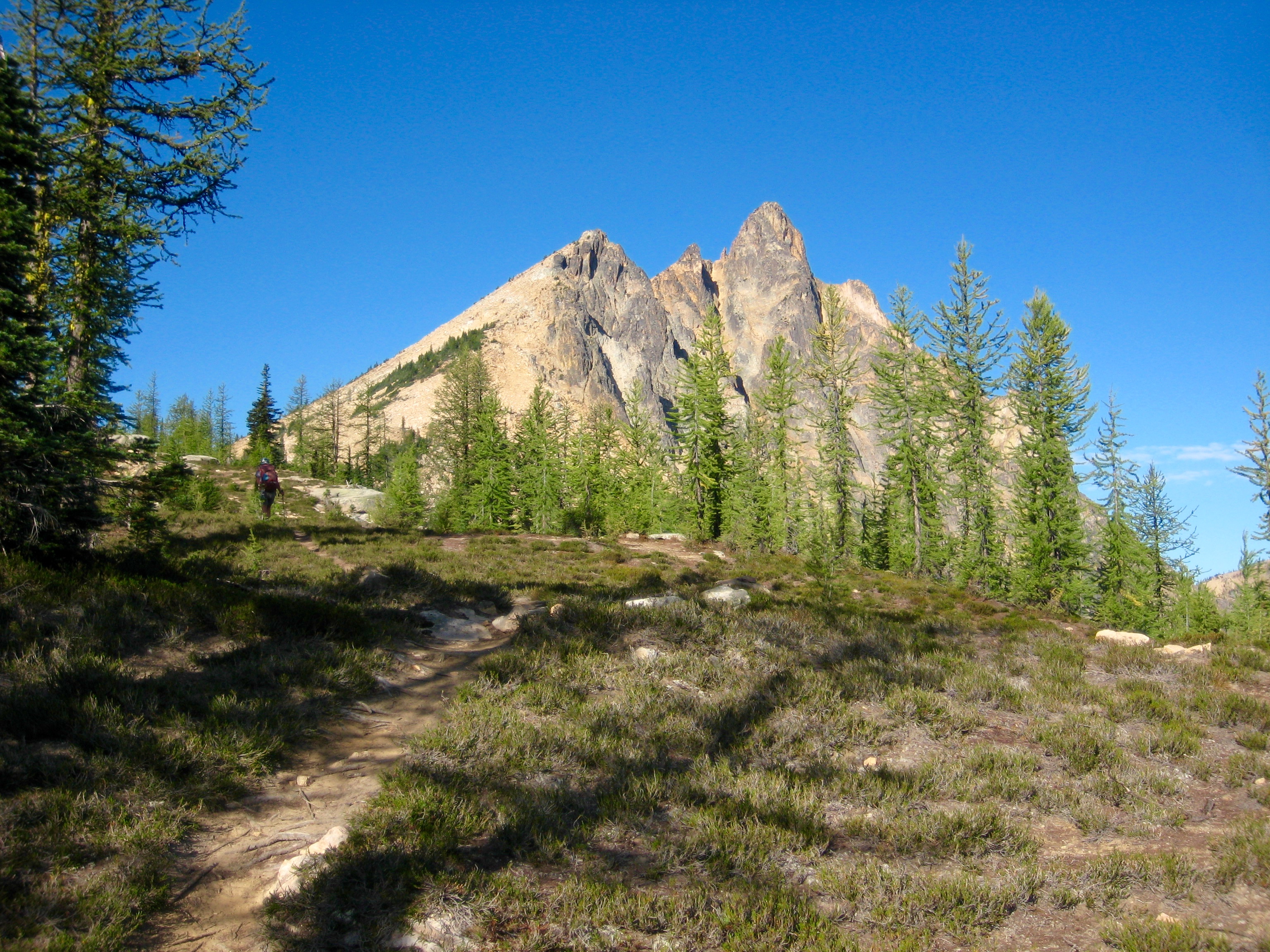 We followed the side-trail back down past the lakes to Snowy Creek Meadow, then hiked the PCT up to Methow Pass (1.2 hours + 350 feet from camp). There, we left the trail and wandered westerly through open terrain to meet the eastern ridge of Mt. Hardy, which stands over the pass like a granitic bullet.