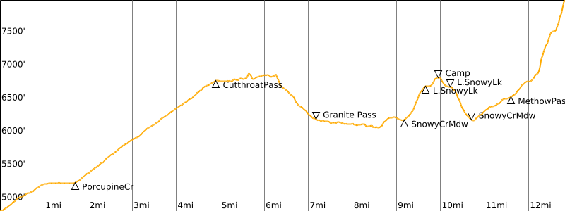 Way Points: Porcupine Creek & Cutthroat Pass & Granite Pass & Snowy Creek Meadow & Lower Snowy Lake & Upper Snowy Lake (trail hike)