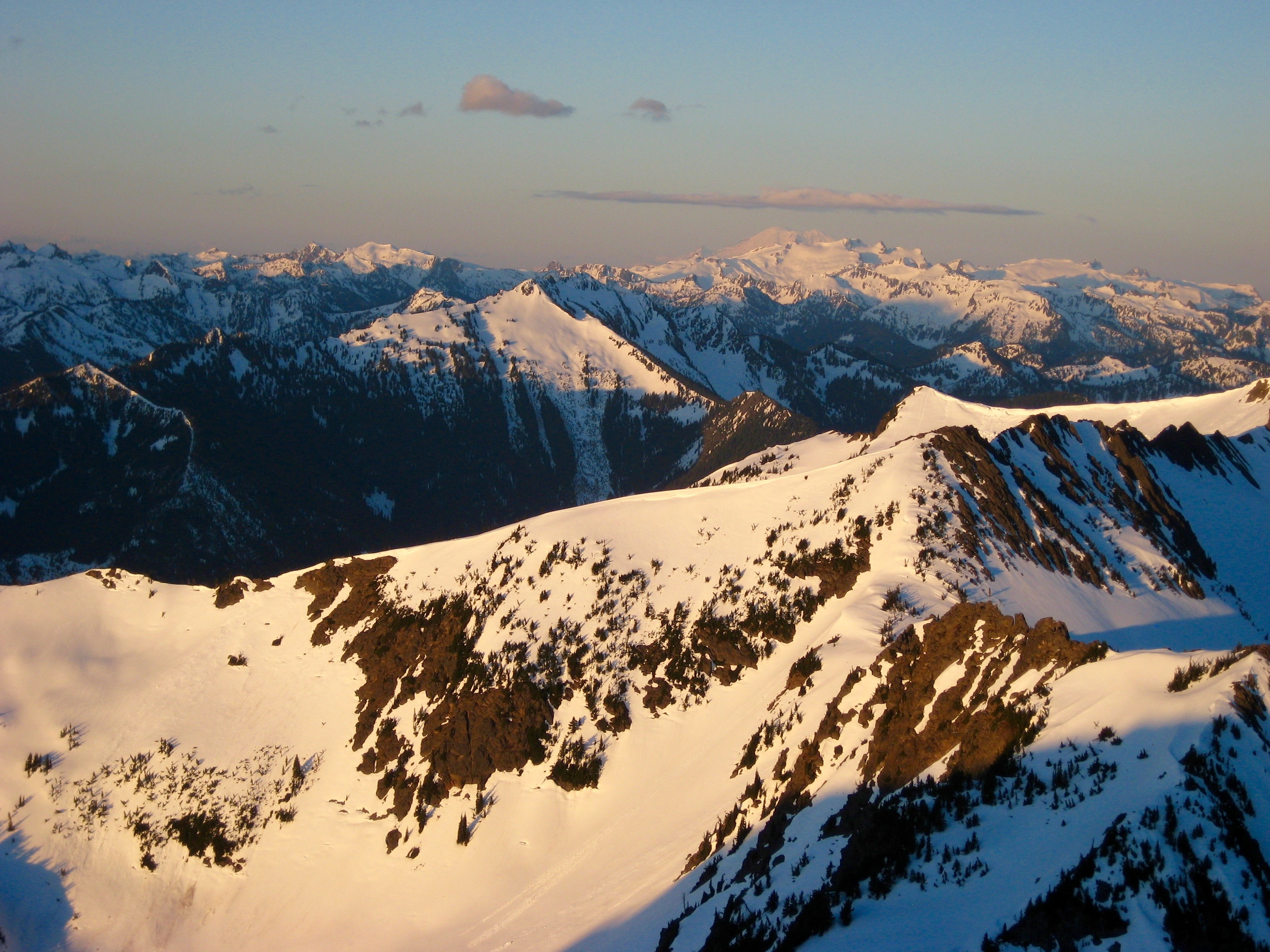 The morning was clear and sunny, with a frigid easterly wind blowing through. We enjoyed views of the Chiwaukum Mountains, Alpine Lakes peaks, and Glacier Peak while eating breakfast.