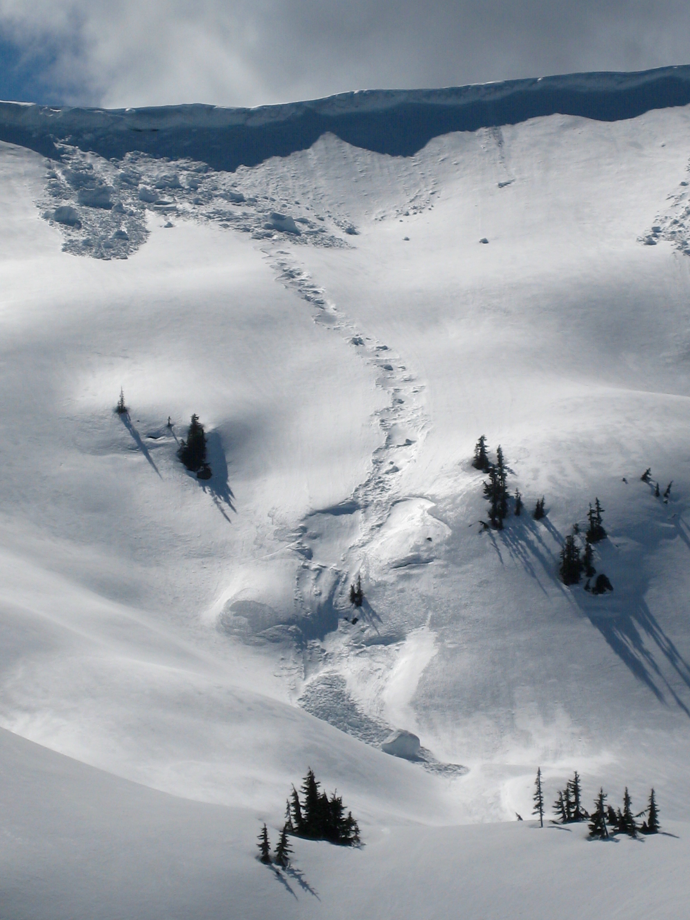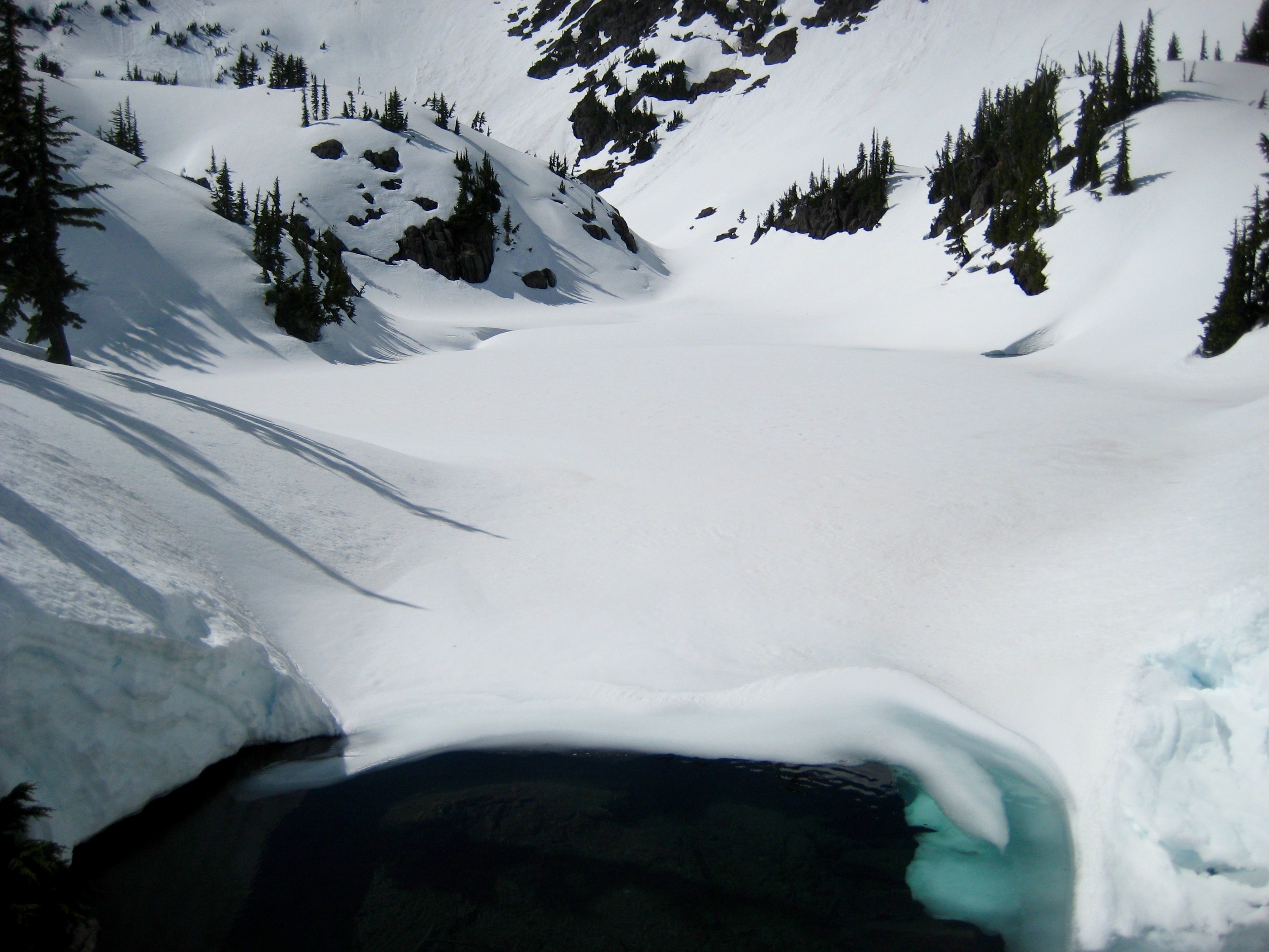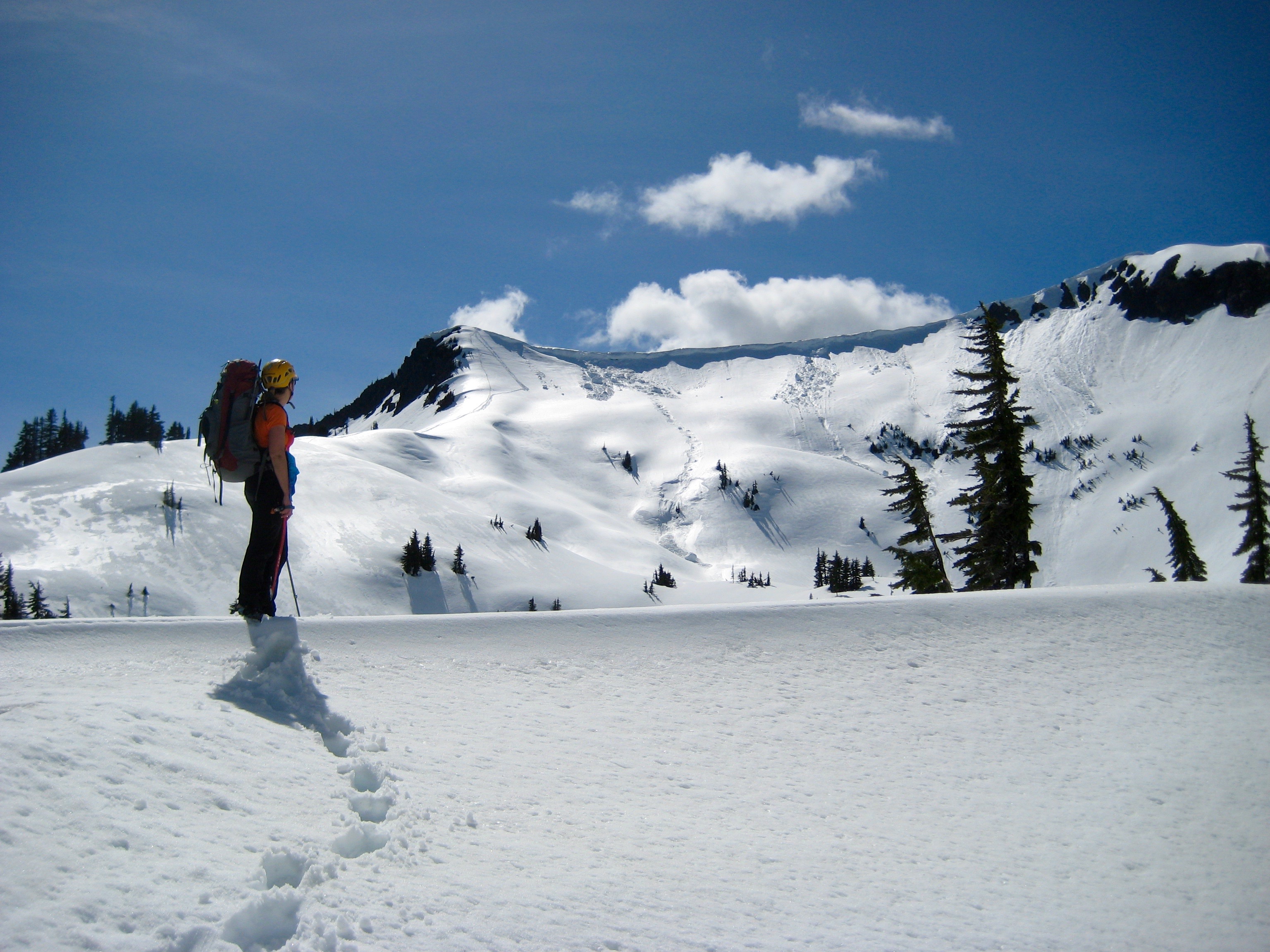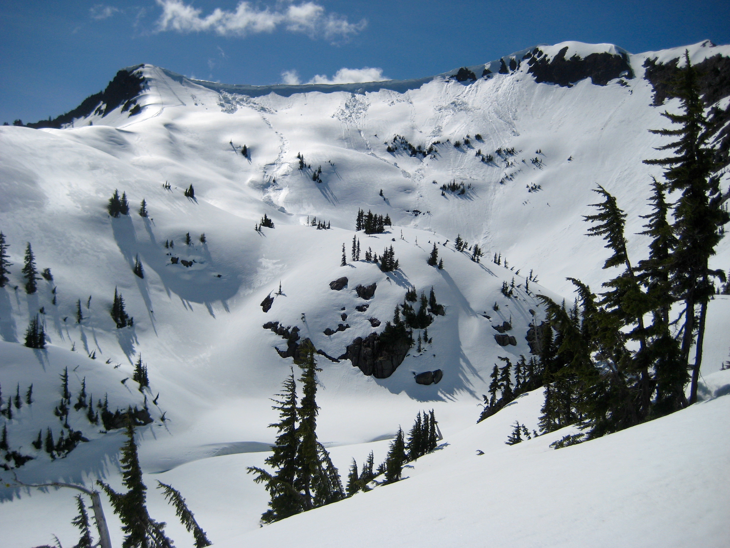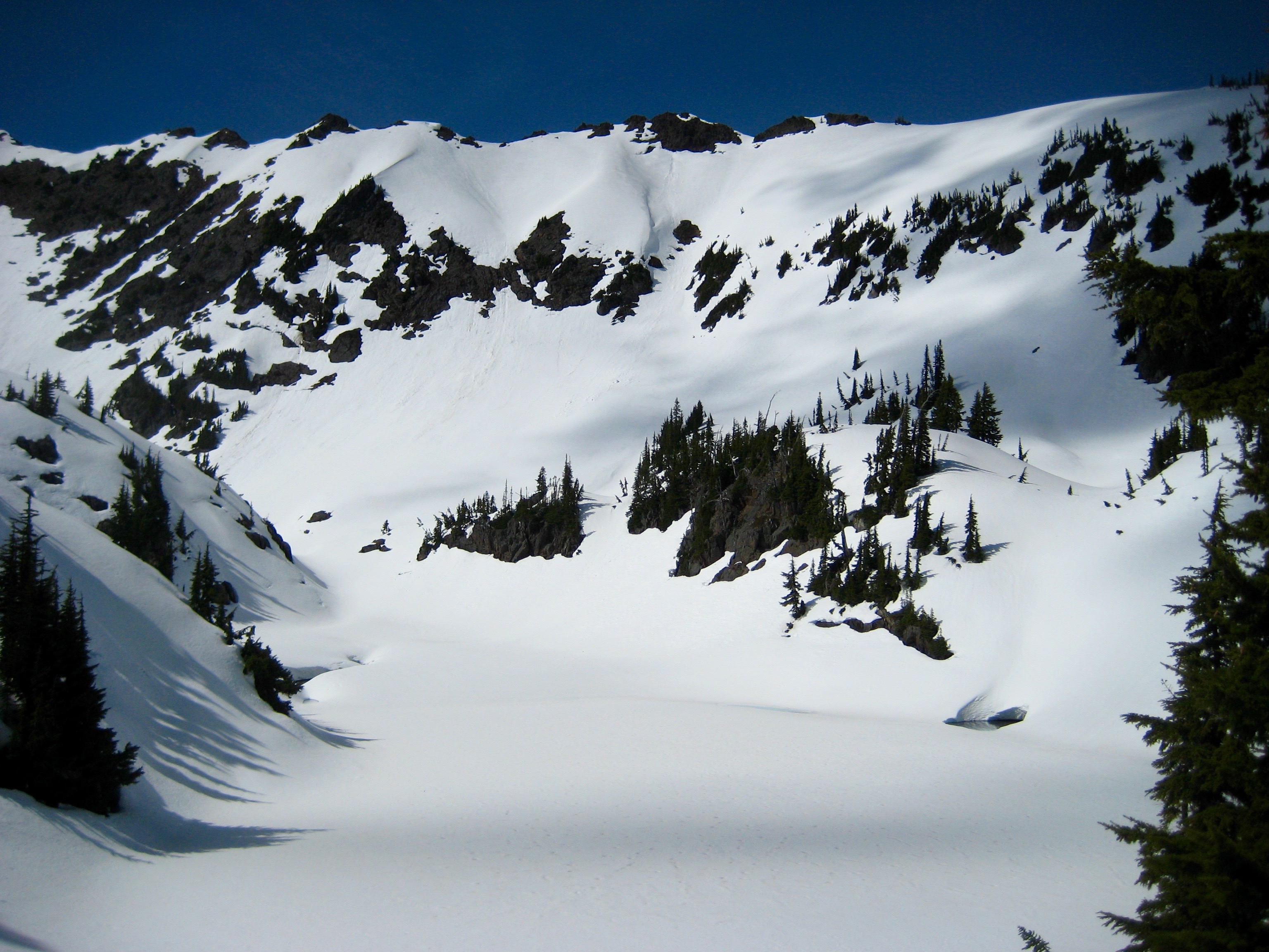 Across the lake bowl, Rock Mountain glistened in the afternoon sun. There were numerous snow sloughs and snow bombs below the corniced summit ridge.