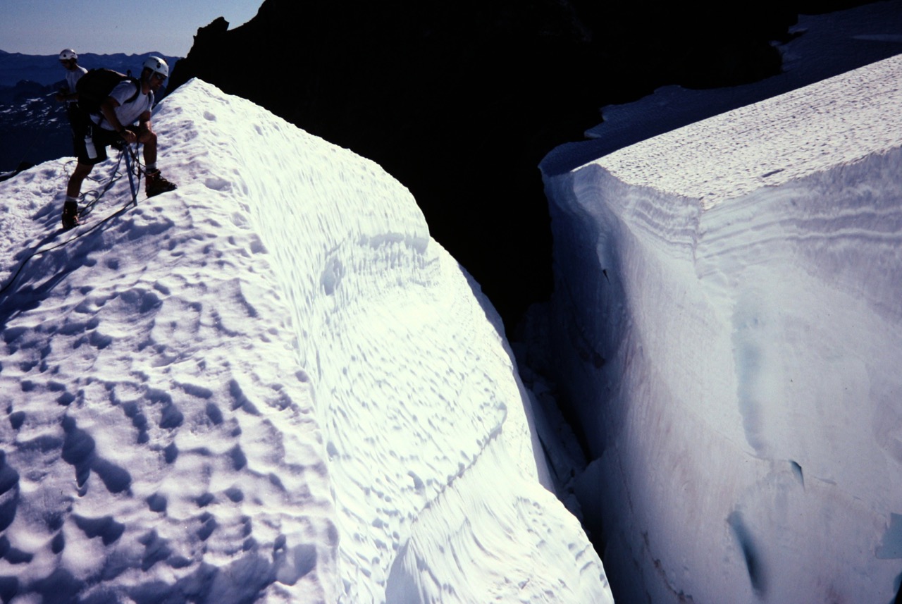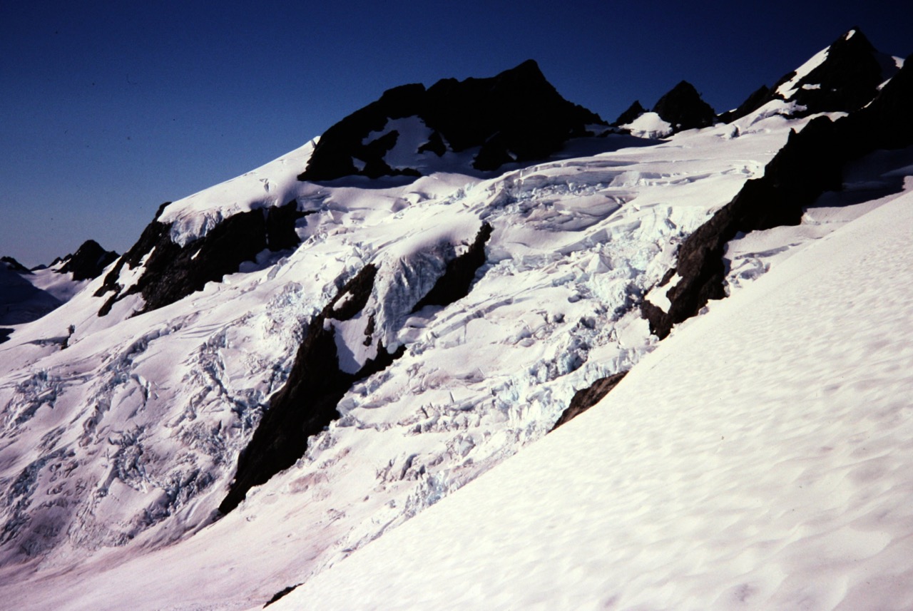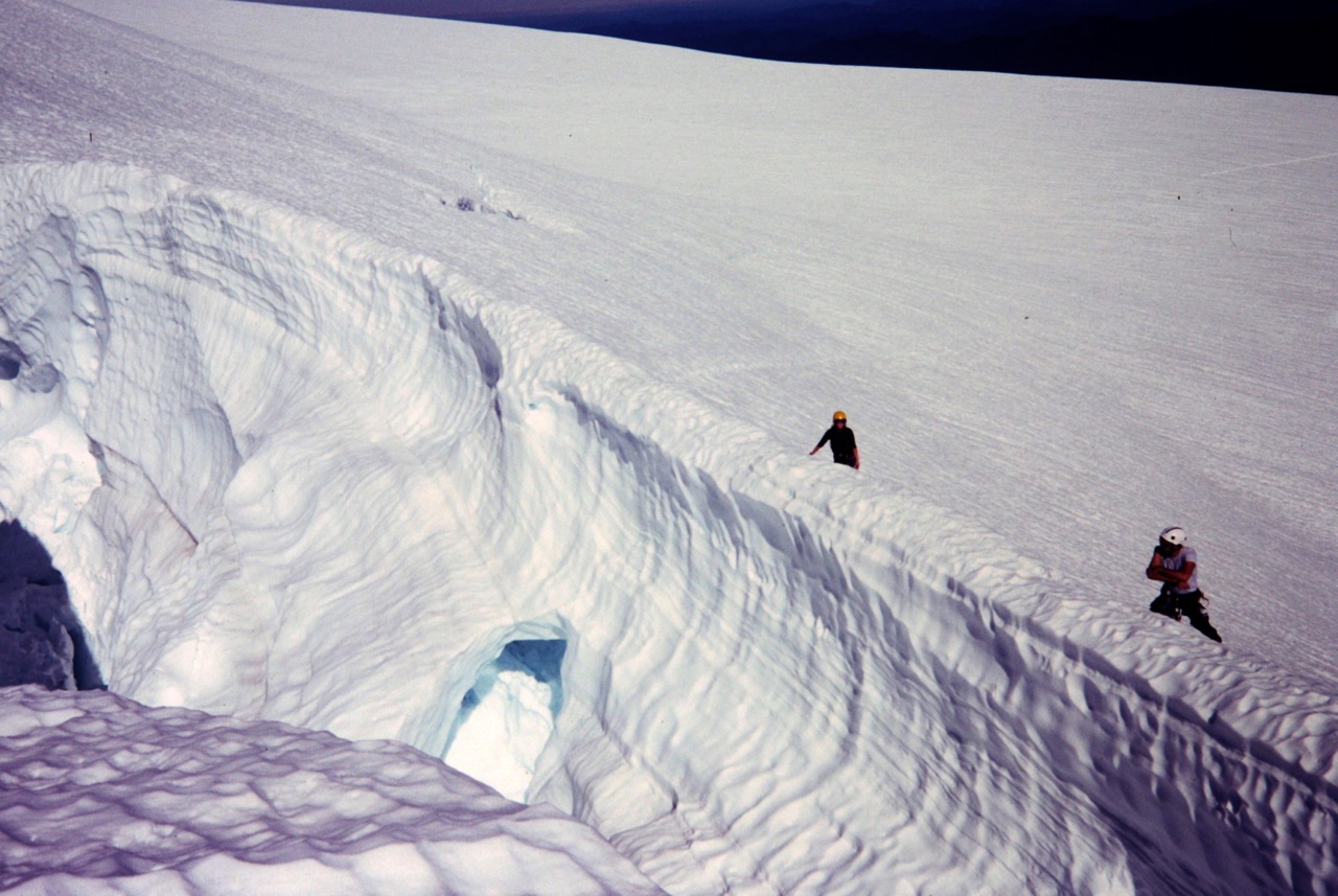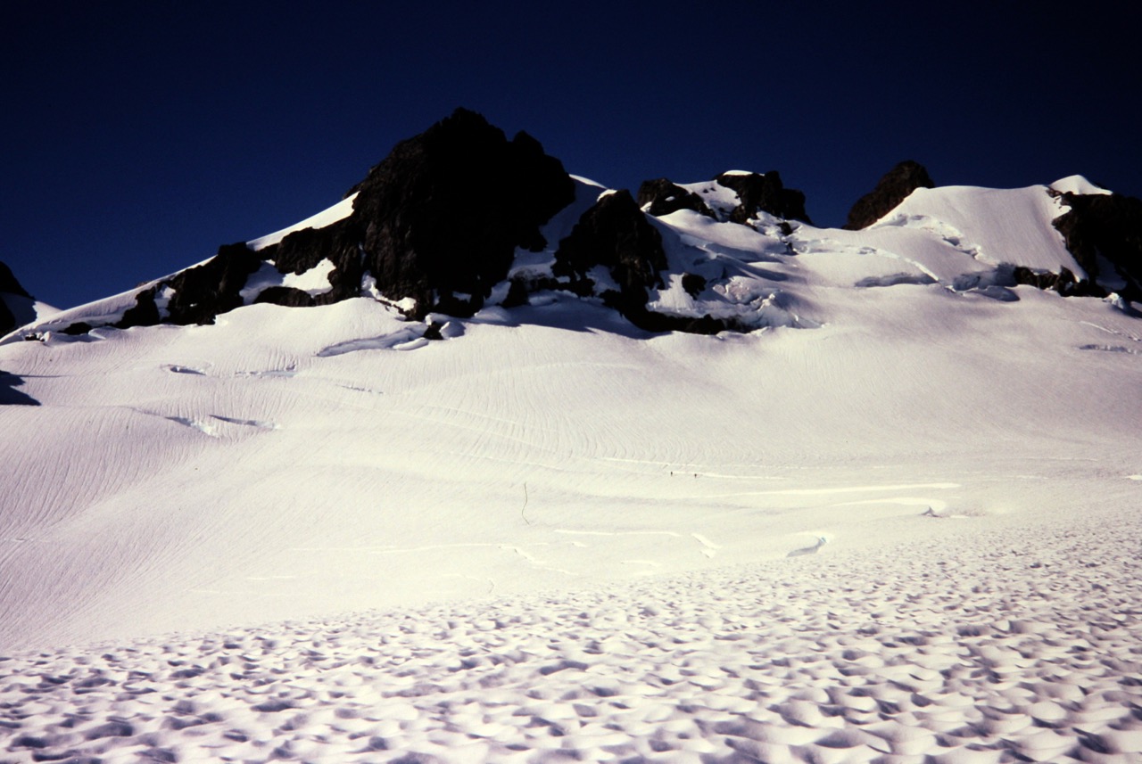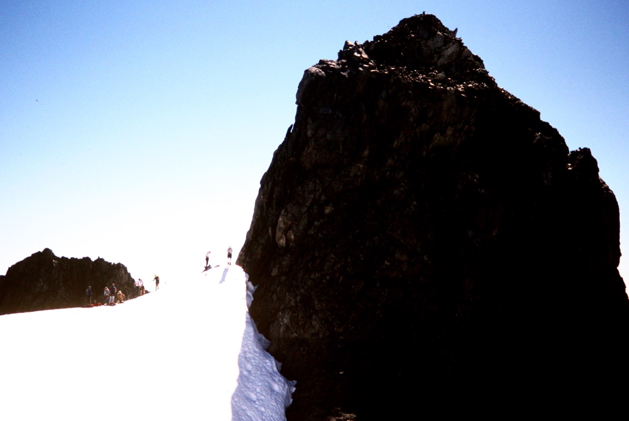 We couldn’t have asked for better weather! Bluebird, all day! Left camp at 5:00am, later than we wanted because the darned alarm didn’t go off. Worked our way up the Blue Glacier, made an end run around some rock buttresses, and topped out on the snow dome. It was all in good condition thus far, with just a few crevasses opening up; we had to leap over two.