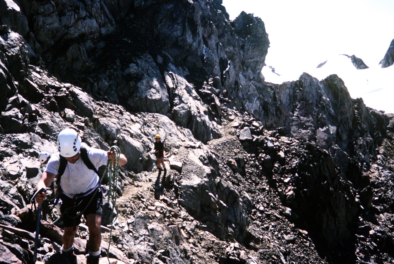 The other party’s leader started up on their rope, a second person trailed our rope and then they fixed them at the summit. The rest of us ascended the fixed rope using prusiks to self-belay. It was a scene reminiscent of the Hillary Step! I would recommend this if there are more than three in the party; take a second rope so you don’t have to belay halfway, unless you are comfortable simul-climbing fifth class rock.