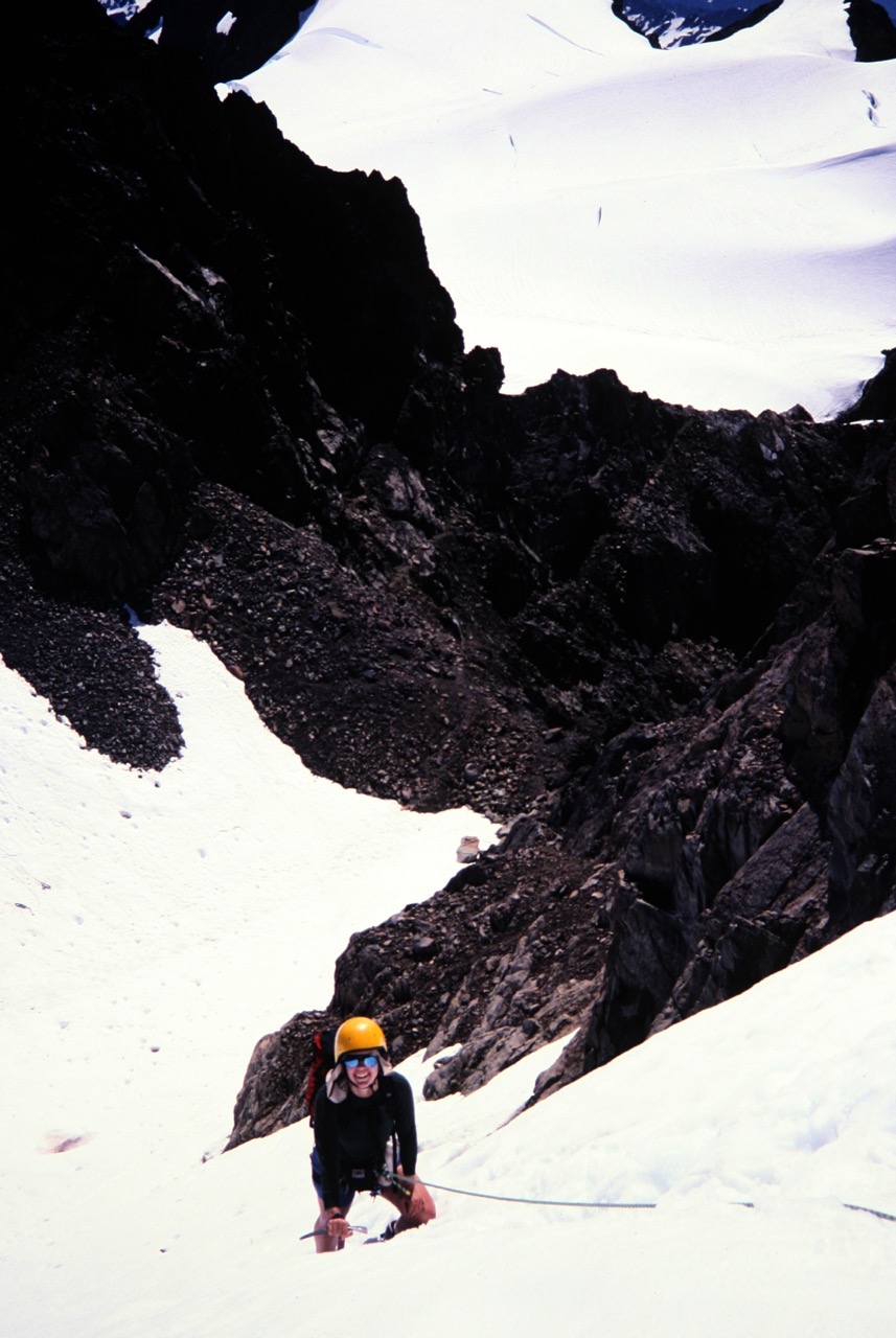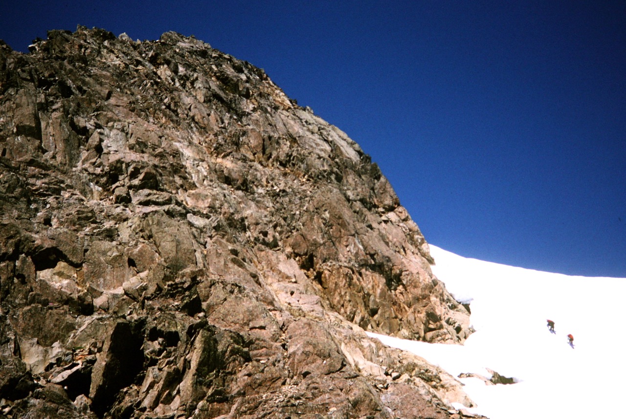 Started to see other people on the route—but with the weather forecast, we didn’t think we’d have the mountain to ourselves anyway. We chose to go the Crystal Pass approach to the summit block. The steepest snow was about 40 to 45 degrees, and there was an excellent run-out.