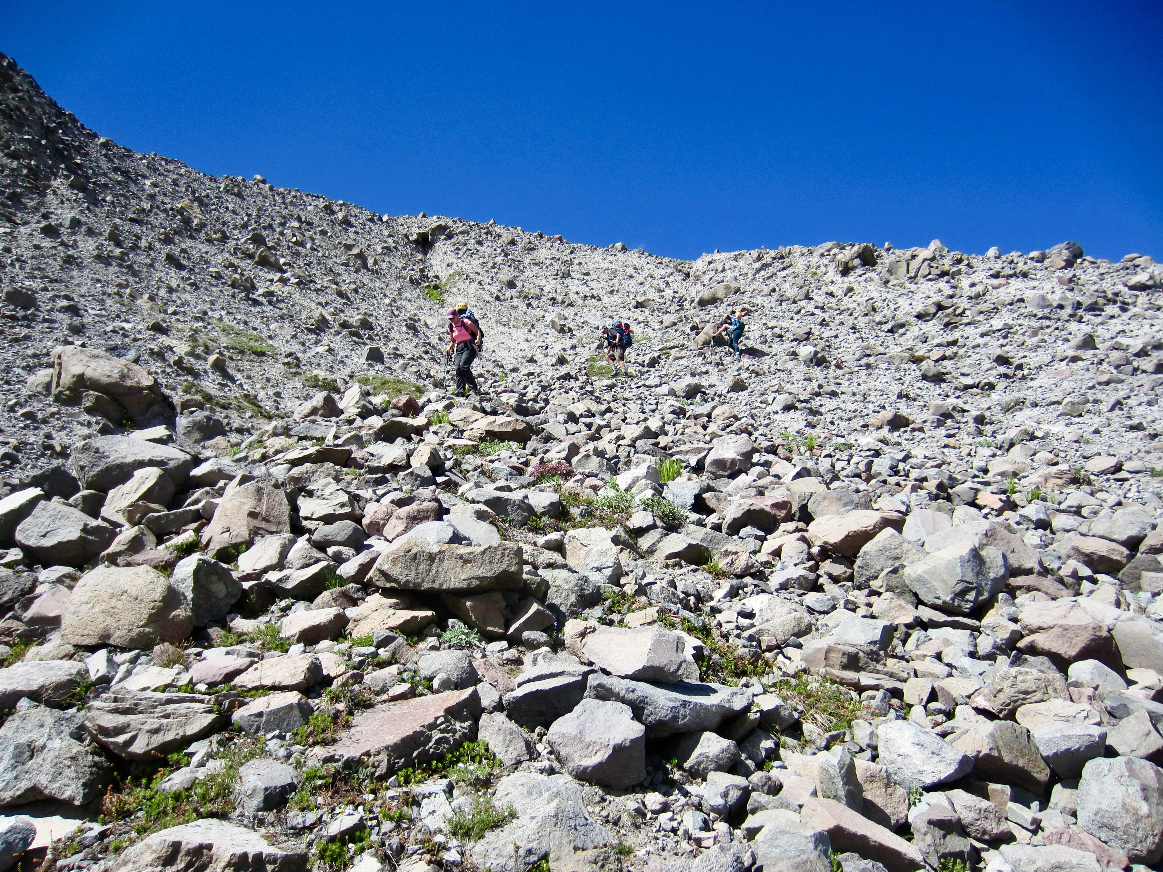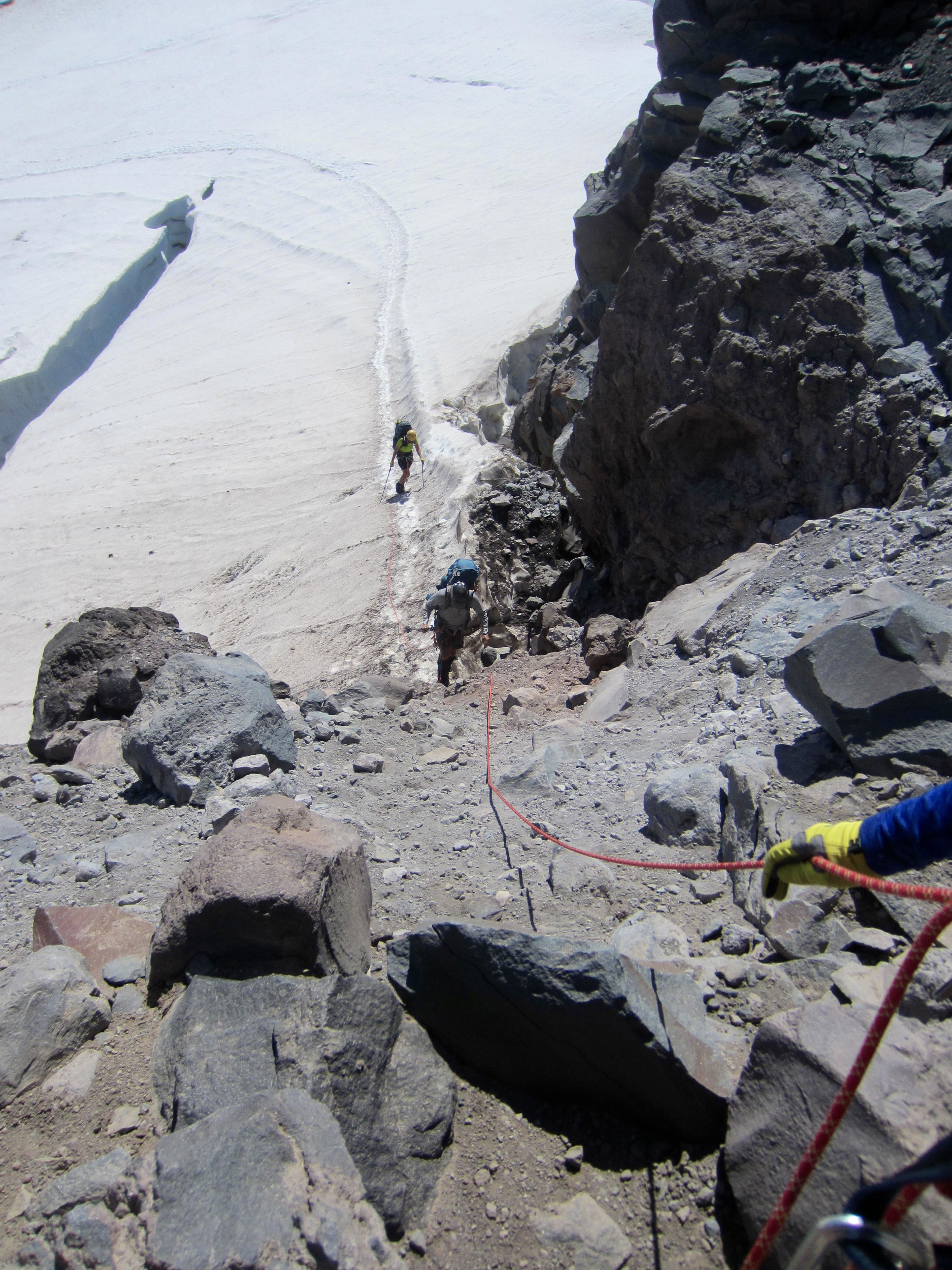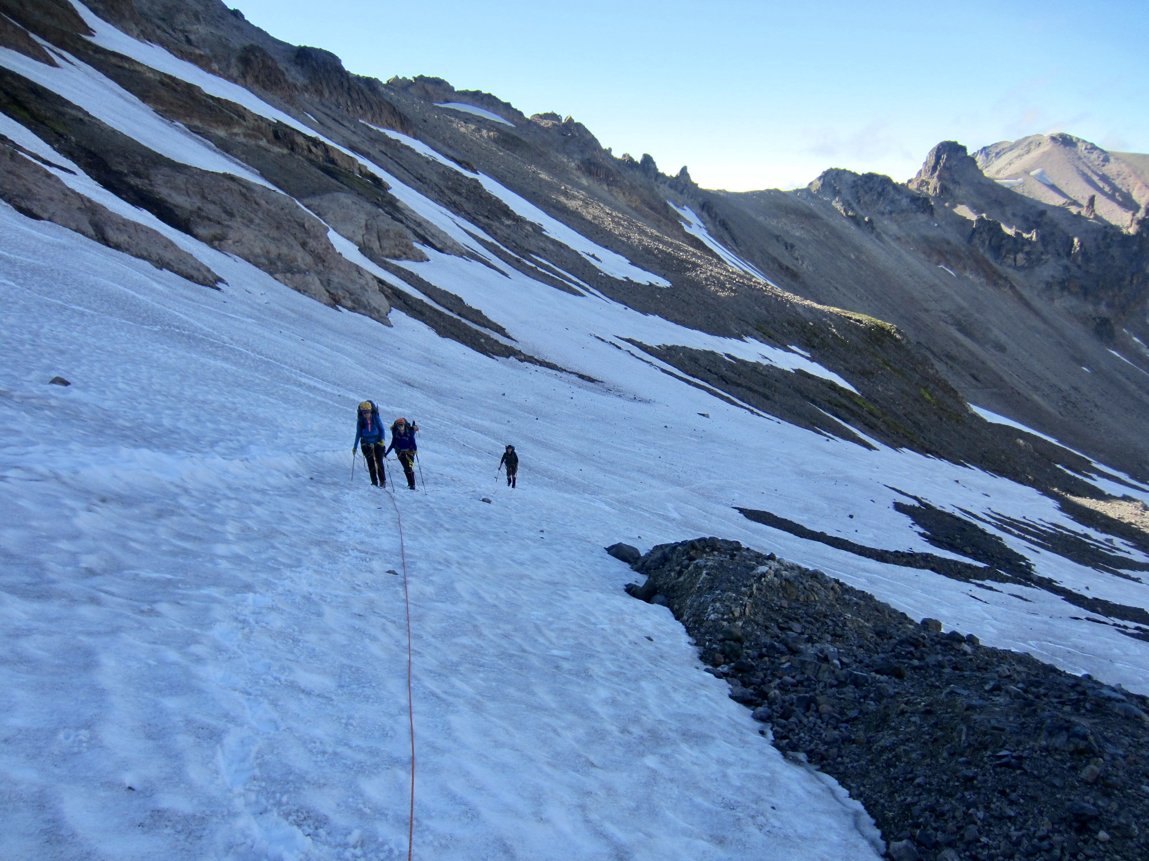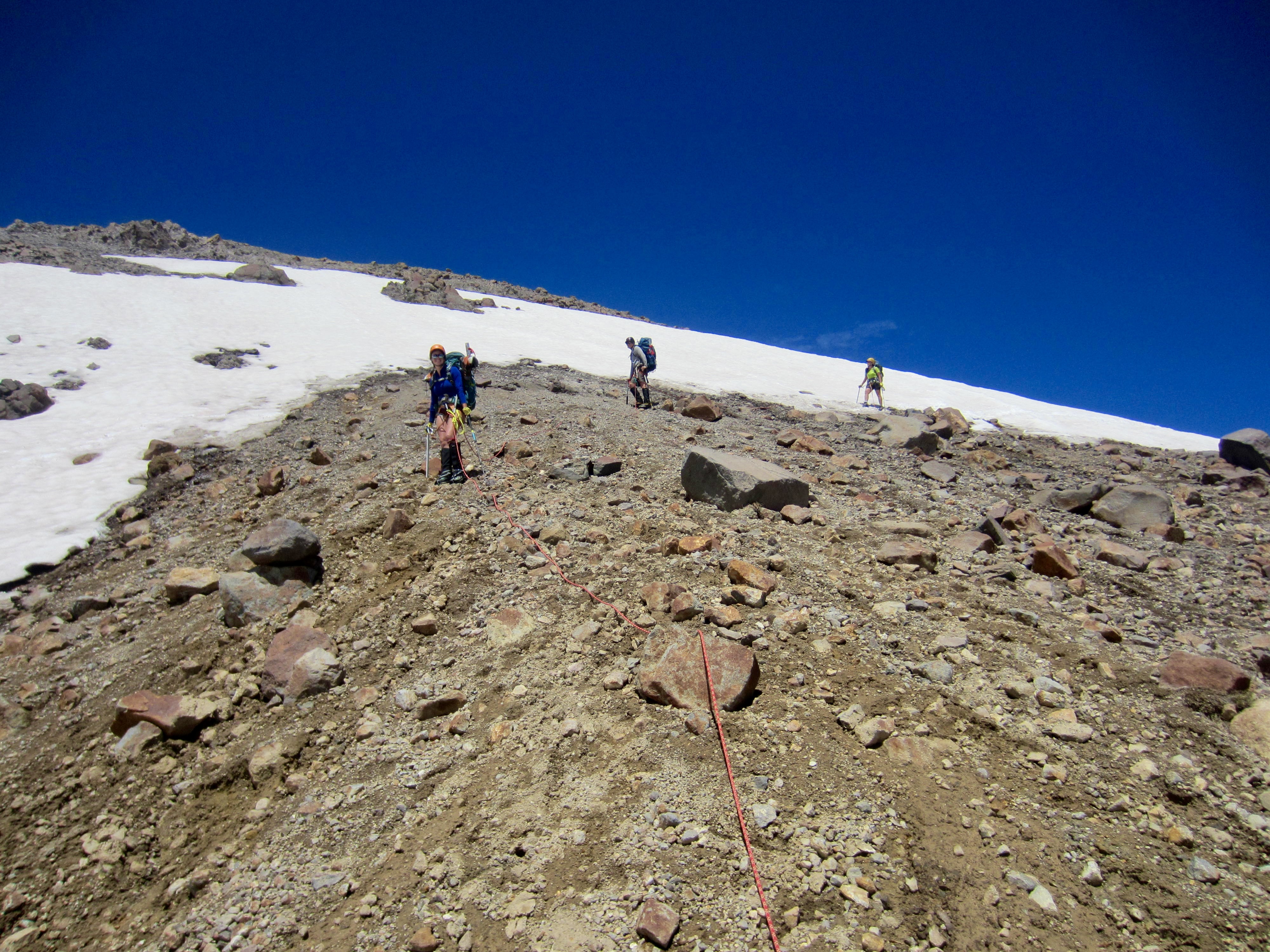 Taking this as an opportunity to continue our “glacier school,” we donned crampons, roped up, and used pickets for running belays through the snow chute leading up to the Inter Glacier. Once above the chute, we followed gentler snow slopes around patches of exposed glacial ice.