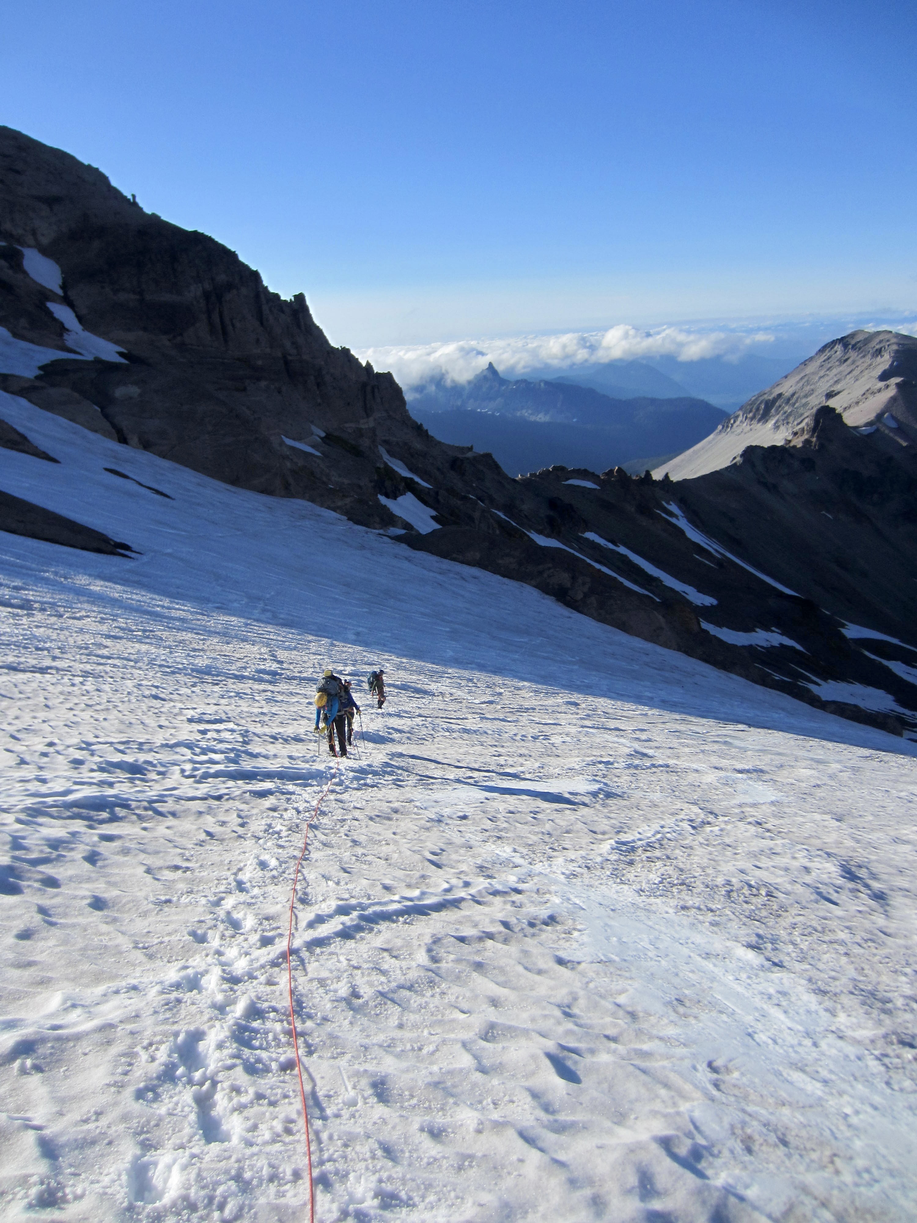 I find it astounding that the Emmons Glacier route is purported by many references to be the easiest on Mt. Rainier. Having completed hundreds of snow climbs over many years, I would describe this as one of the most stressful non-technical snow climbs I’ve ever done, owing to the relentlessly exposed slopes and icy conditions. My feelings were anecdotally confirmed by the climbing ranger stationed at Camp Schurman and by the other rope team leader. Whether it’s just a function of this year’s snow conditions or a sign of permanently changing conditions, I can’t say.