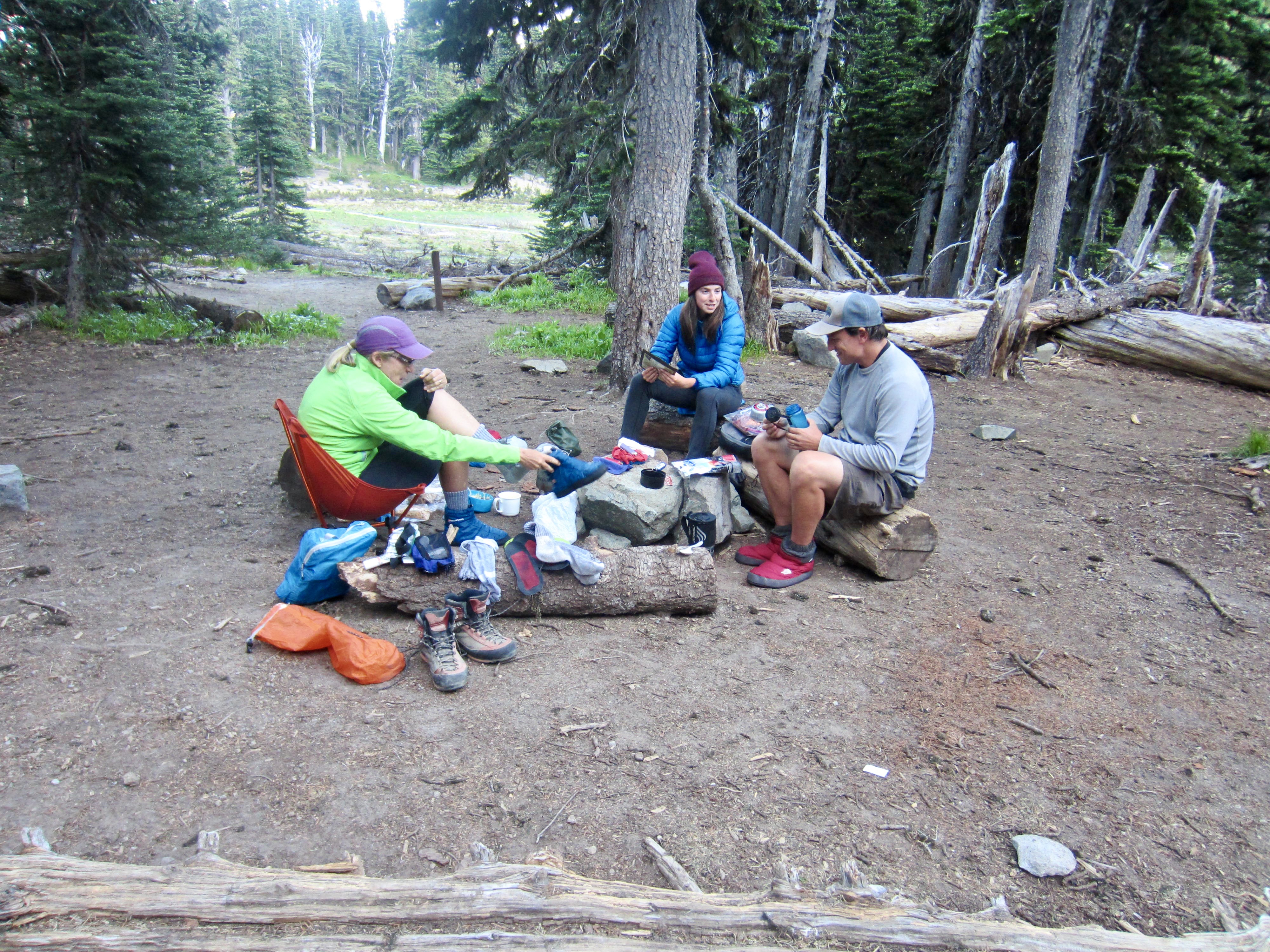 We all met at the White River Ranger Station on Tuesday morning to procure our backcountry camping permits, then dropped Brooke and Dan’s vehicle at White River Campground on our way to Sunrise. Gear was spread out in the parking lot, and backpacks were variously loaded—or even overloaded—with tents, rope, crampons, helmets, pickets, and mountain boots. Under a bright blue sky, we made the easy 1.5-mile hike over to Sunrise Camp near Shadow Lake (0.7 hours + 100 feet from TH).