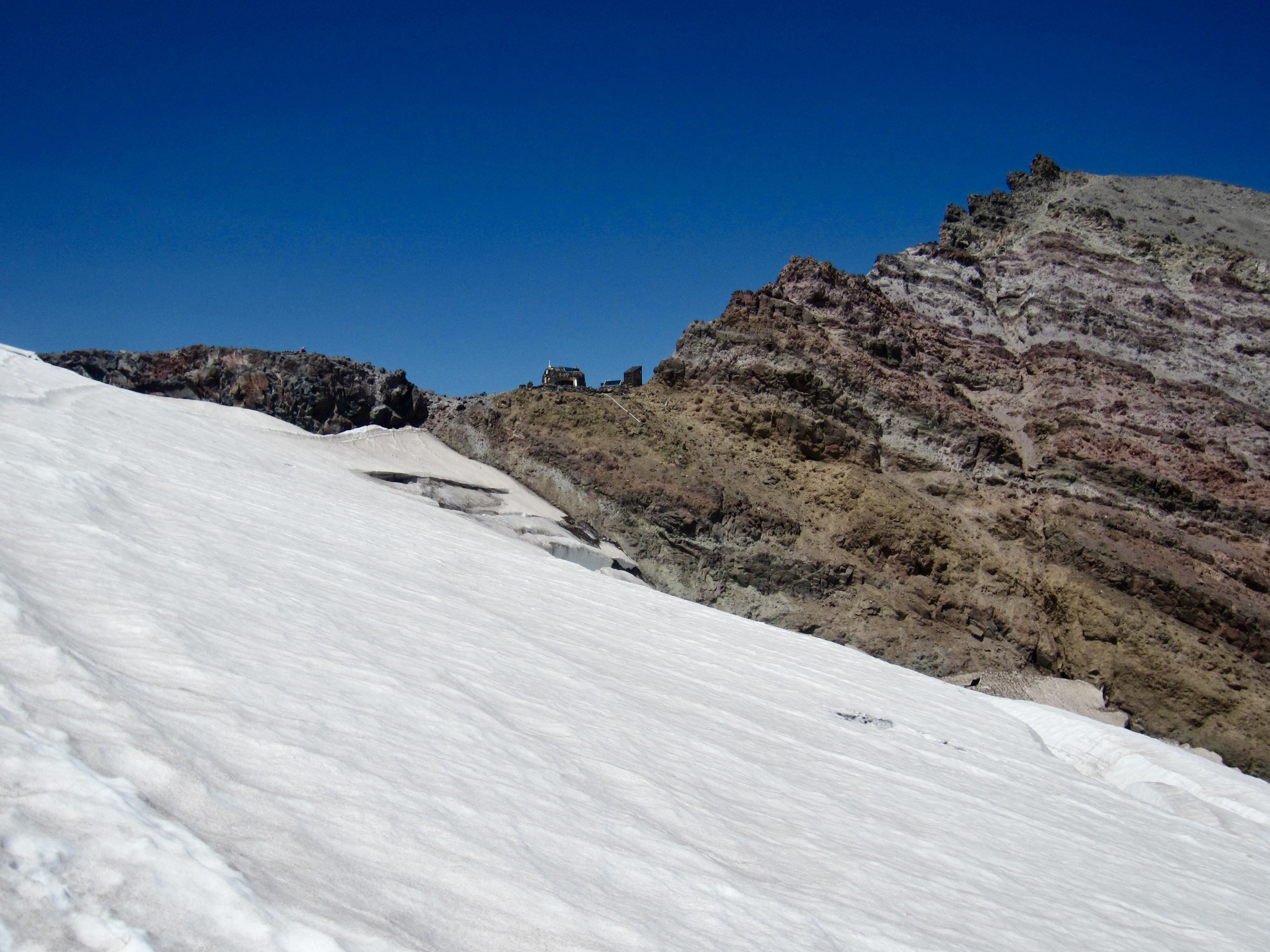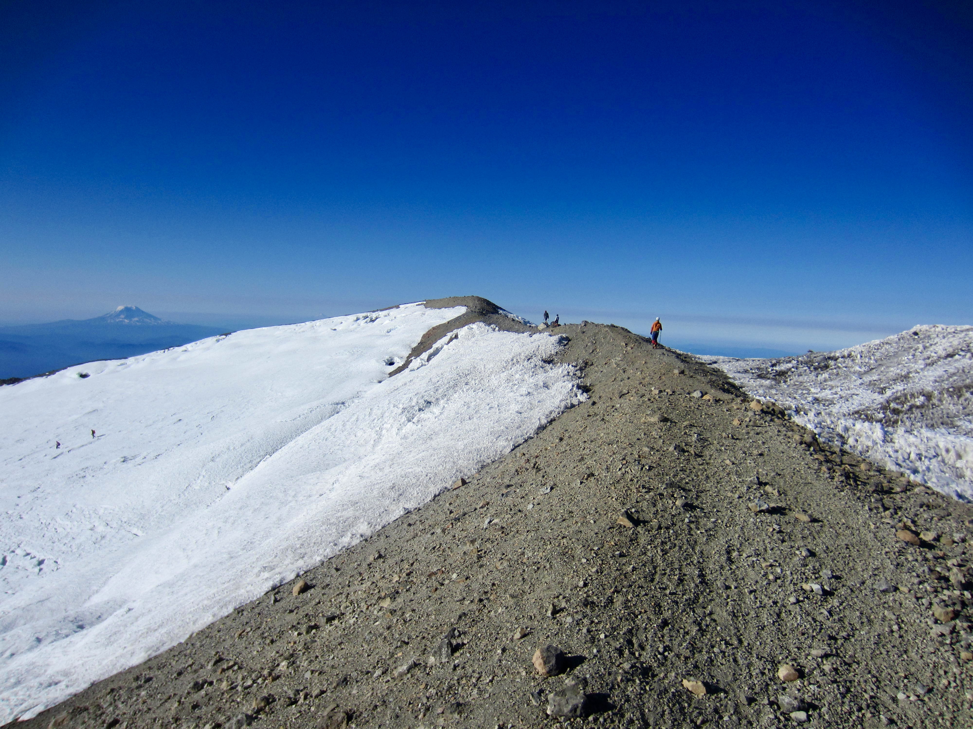 After taking summit photos, we ducked into a sheltered place below the crater rim and spent a full hour munching, drinking, soaking up the summit atmosphere, and—most important of all—allowing the glacier ice to soften a bit. There had been dozens of climbers milling about the crater when we first arrived, but they eventually disappeared and left us alone in eerie quiet.