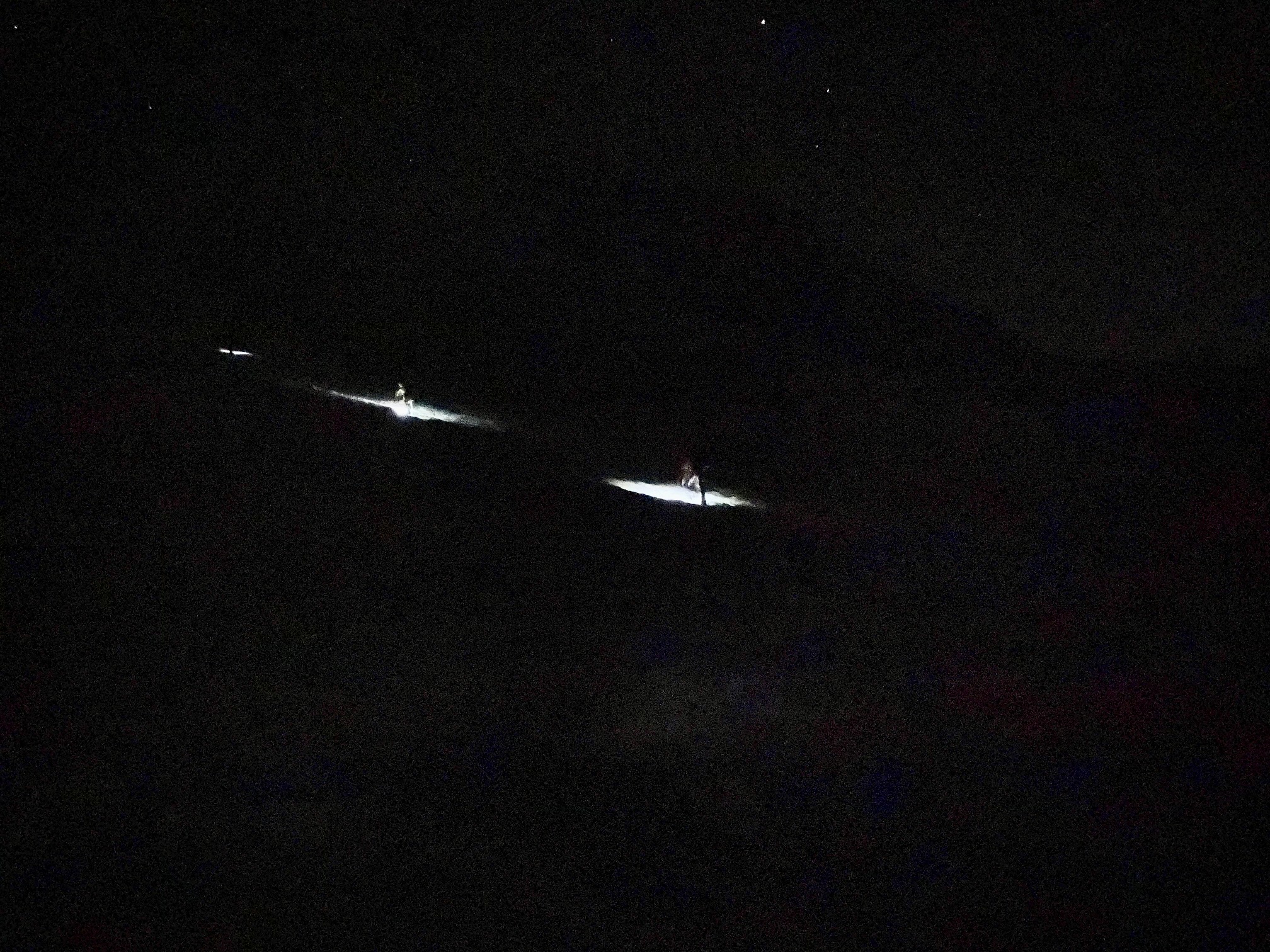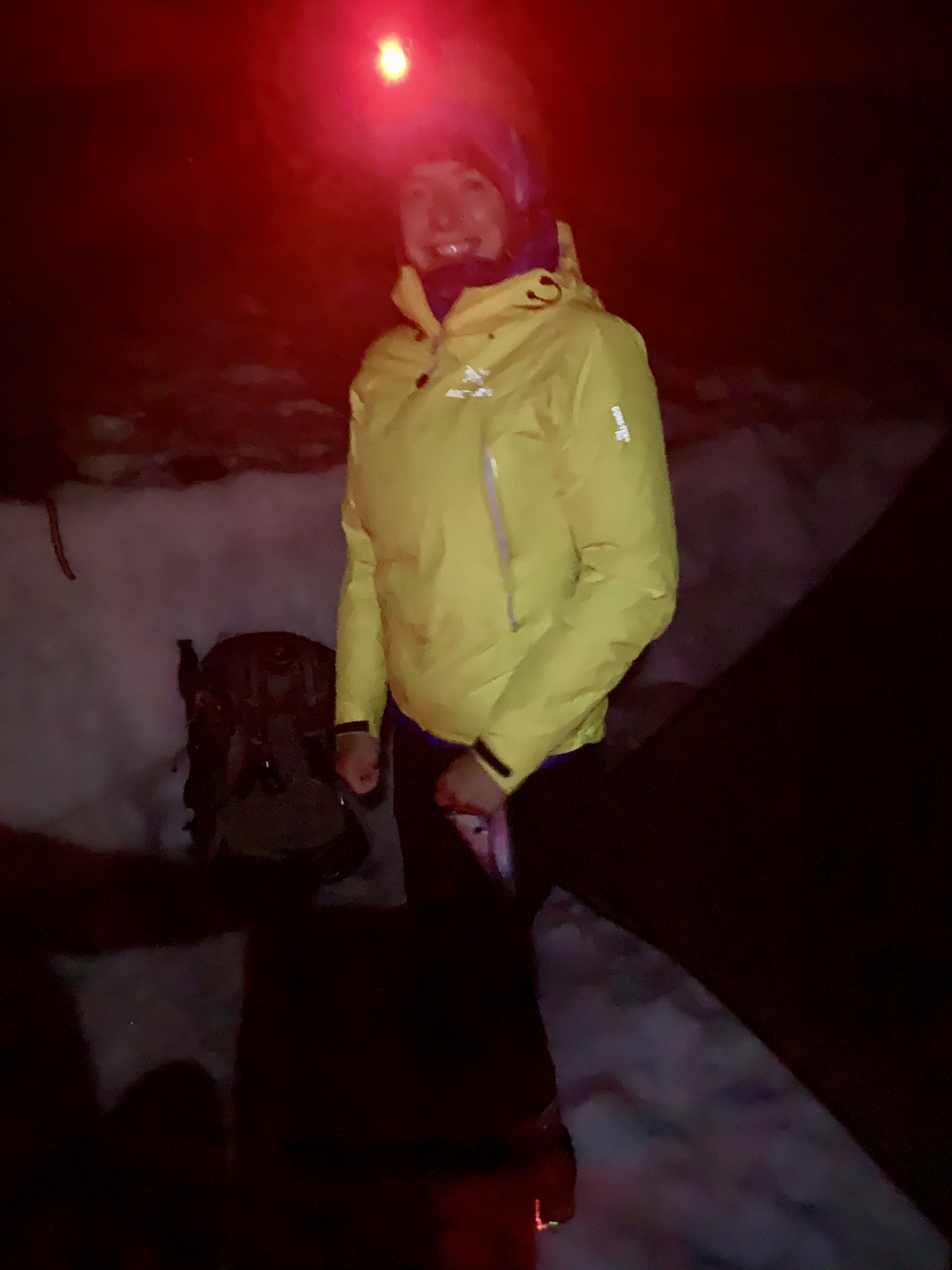 Eileen fired up the campstove at 10:30pm and started boiling water for a late dinner. Brooke, Dan, and I were up by 11:00pm, eating and getting dressed. We stepped out of our tents and were greeted by unexpectedly cold, windy weather and frozen snow. The party of four camped nearby was getting ready at the same time, and we learned that the party of three had left camp 2½ hours earlier.