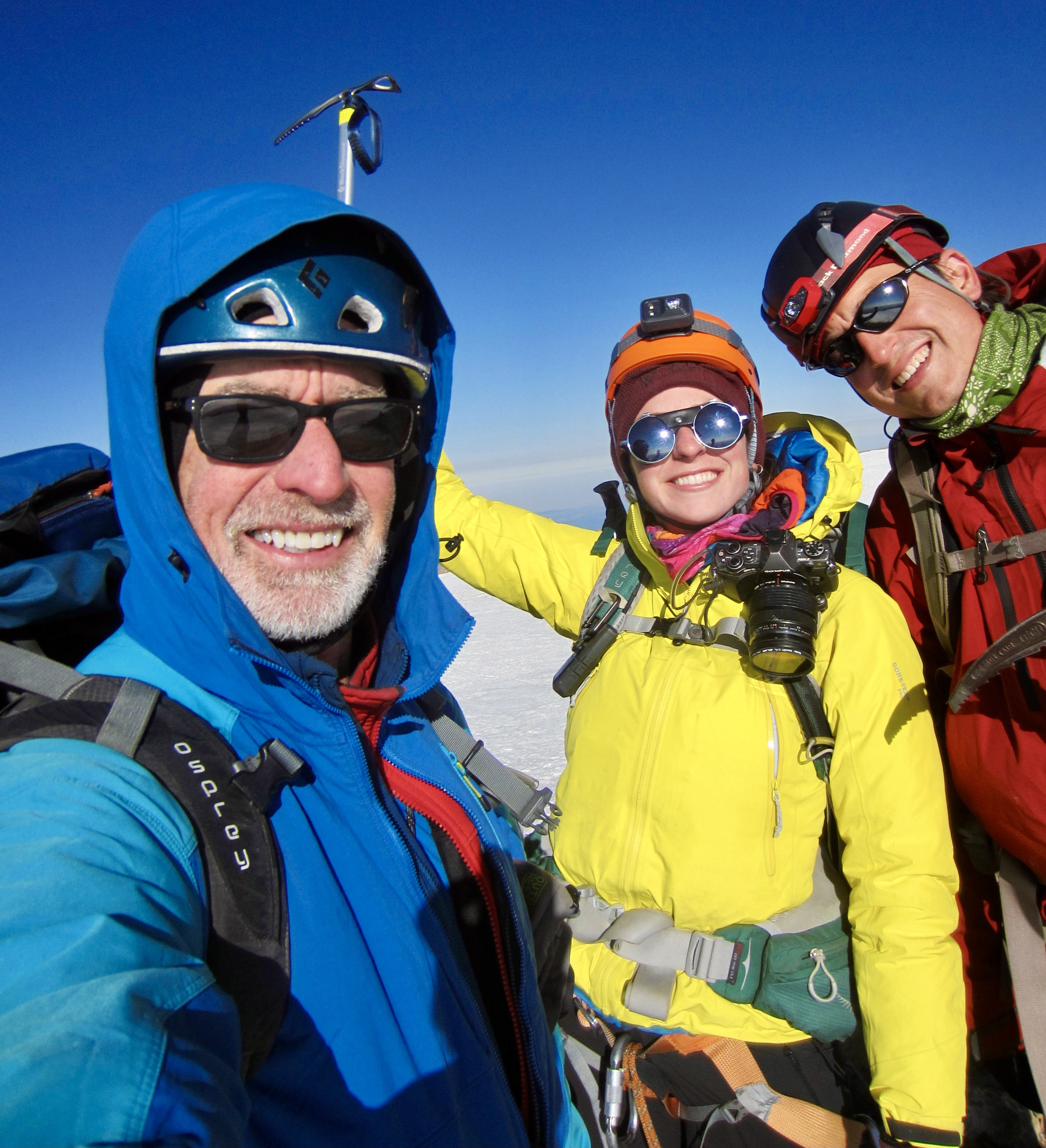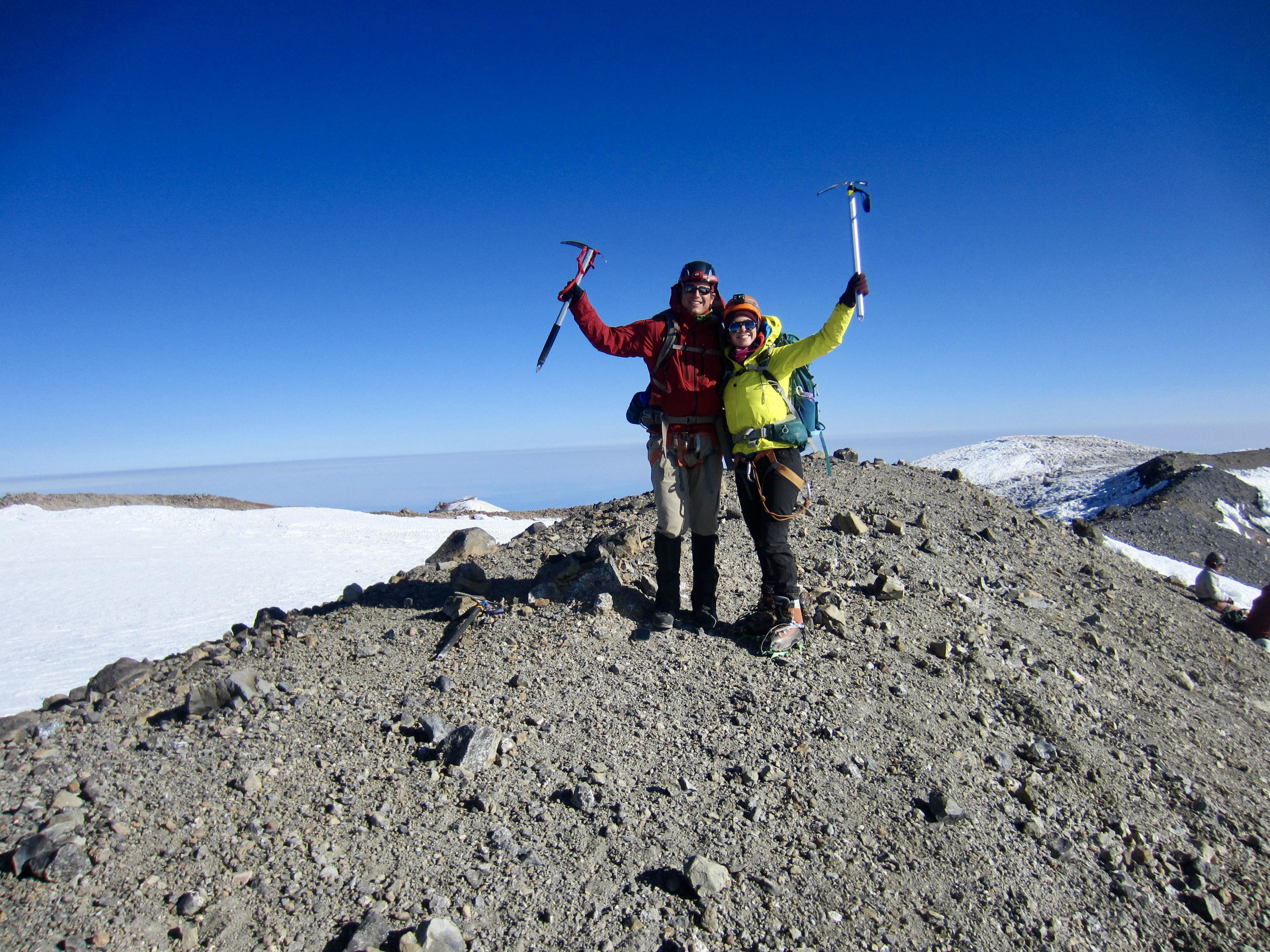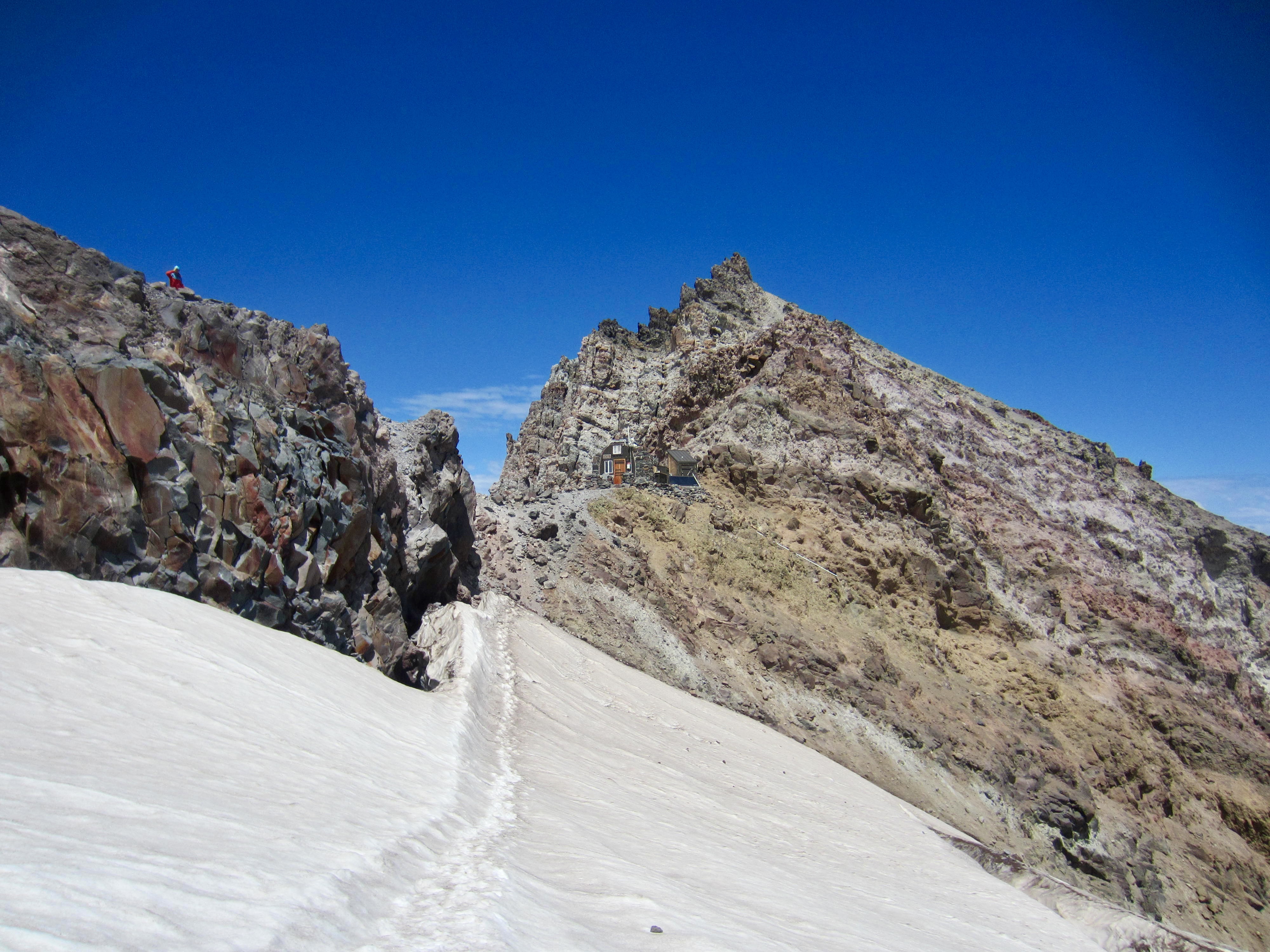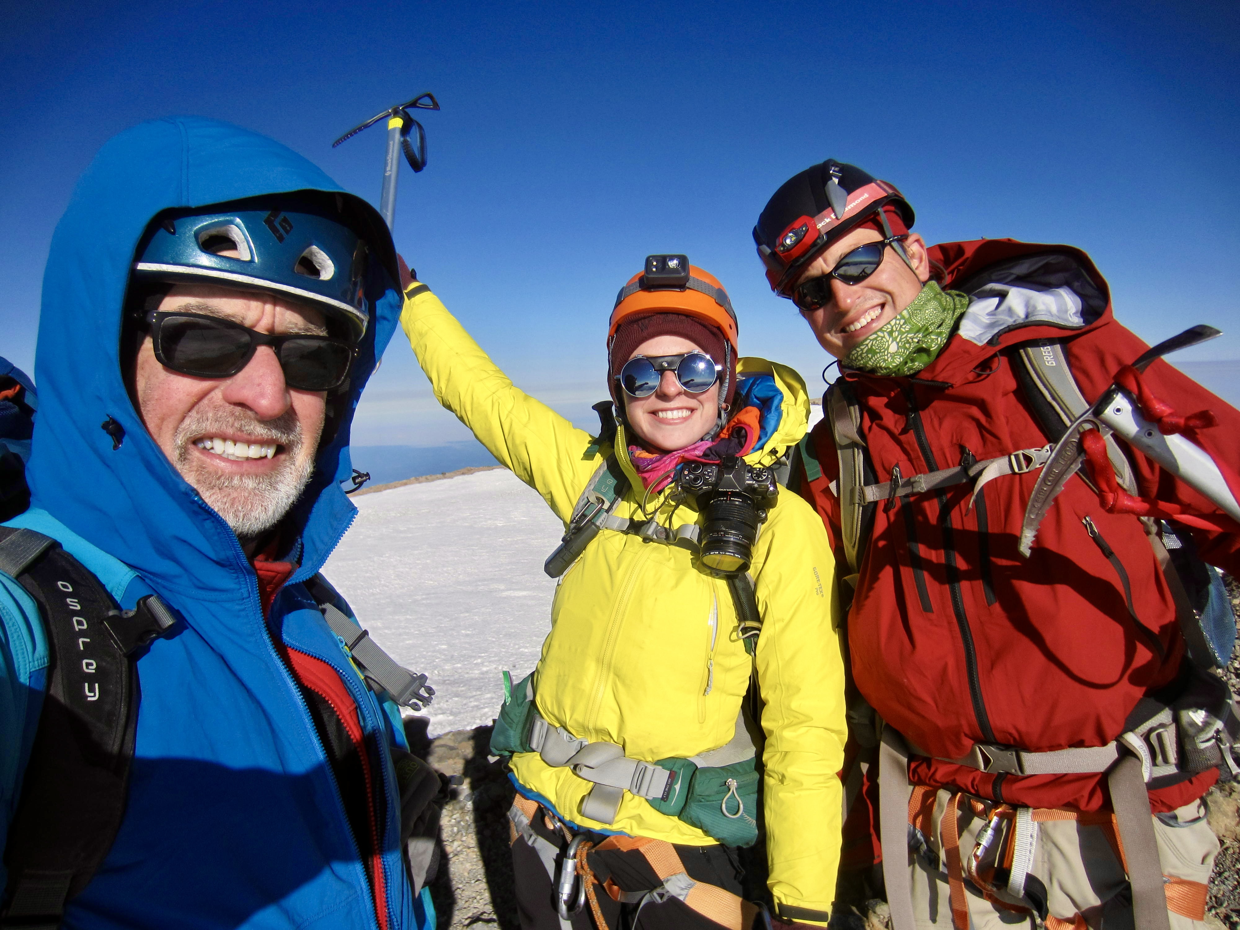 The barren crater rim soon came into view at the top of the dome. We hurried up the final ice slope—to the extent that we could hurry at 14,000 feet—and scratched our way up the sandy crater rim.