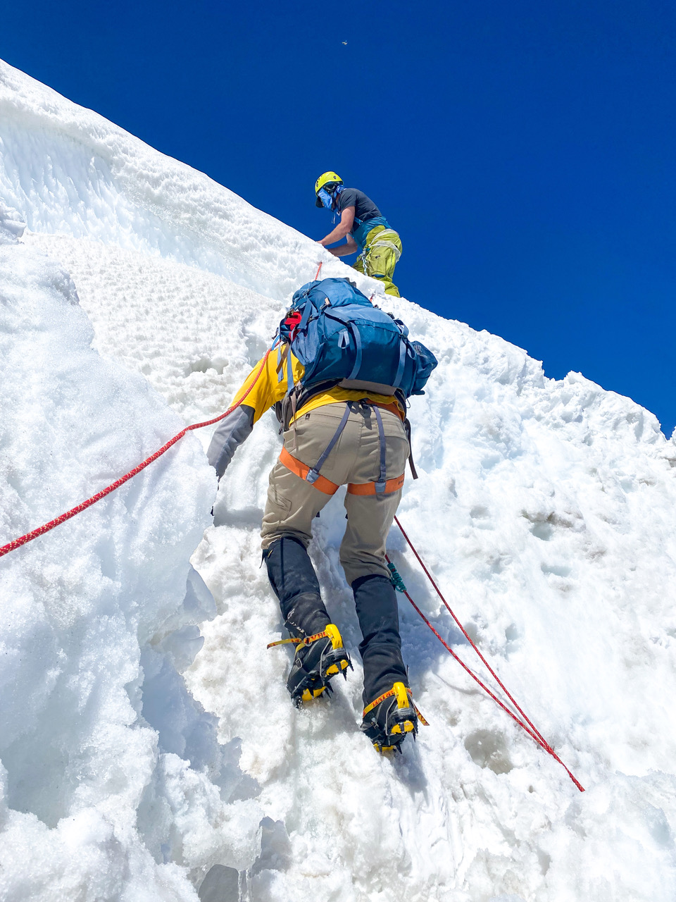 A big uncertainty in our climb was snow and glacier conditions along the route, because Washington State had just suffered through a record-breaking heat wave with sustained temperatures above 100 degrees F. There was no question that June’s extreme “heat dome” had accelerated melting of the snowpack, but we didn’t really know the extent and effects of that melting. It didn’t take long to discover that the extent was massive and the effects were drastic.