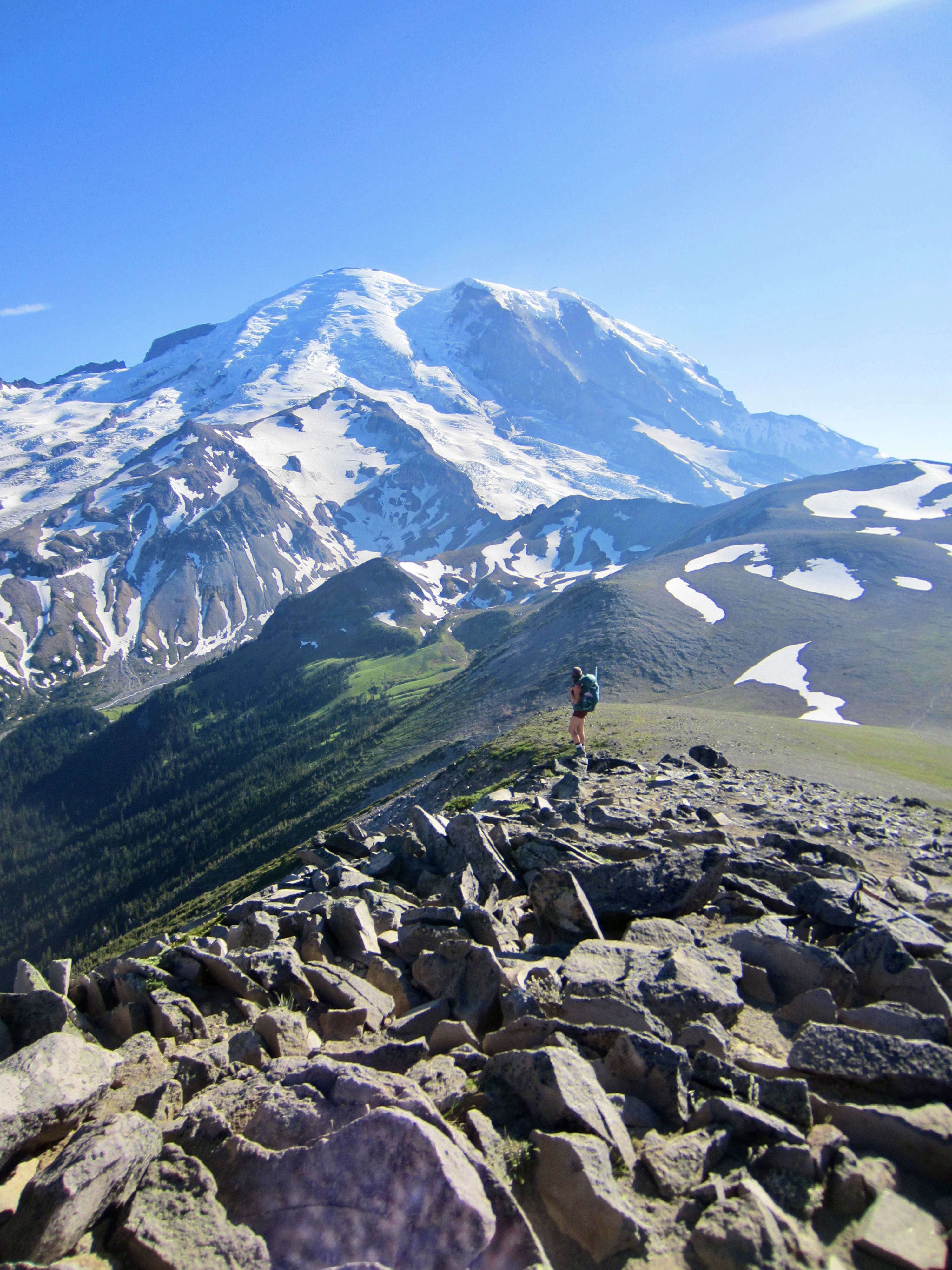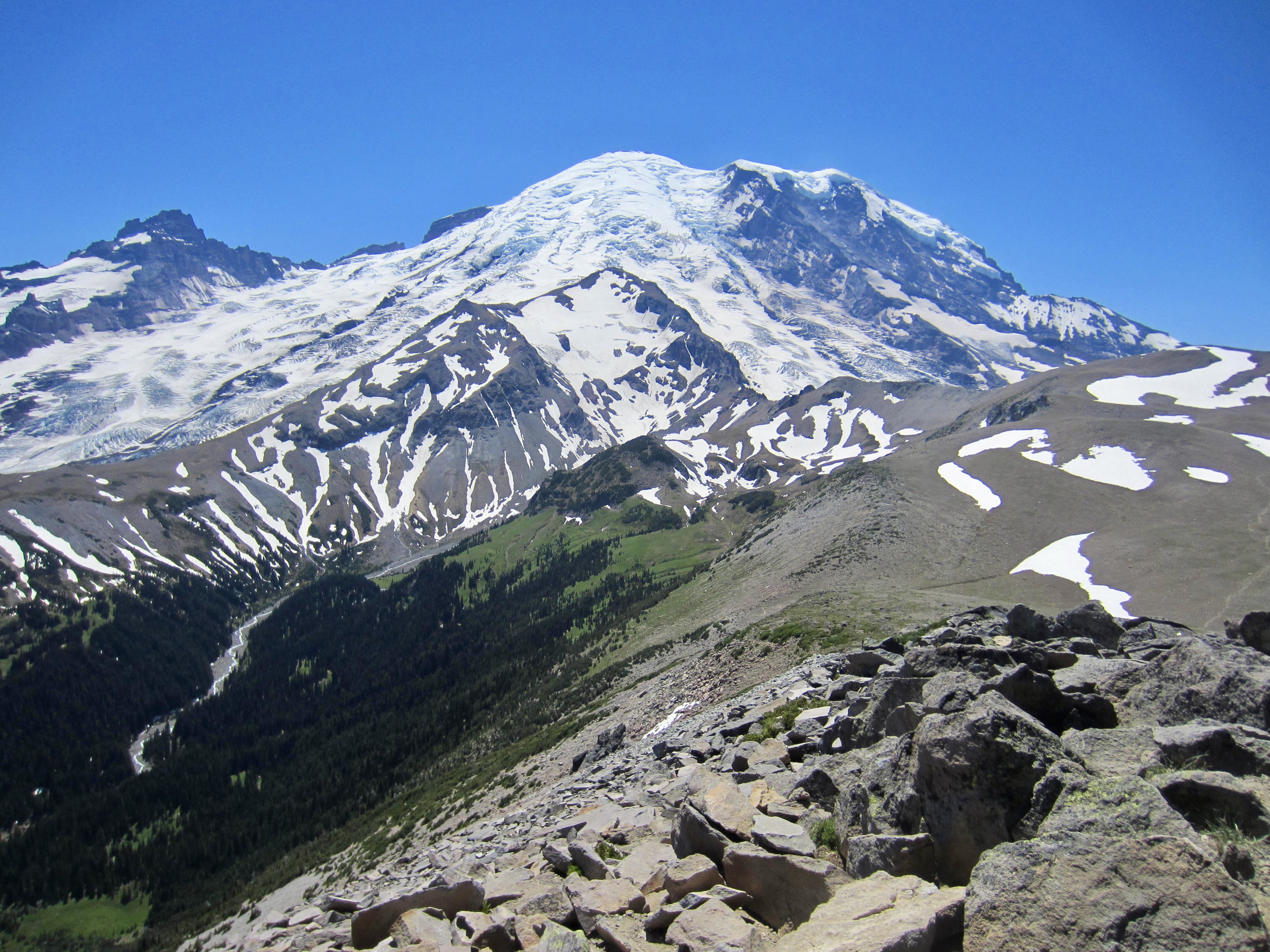 After pitching tents in the group site, we grabbed summit packs and headed up the Burroughs Mountain Trail. The summit of Second Burroughs Mountain offered a marvelous lunch stop with an unobstructed view of our planned climbing route up Mt. Rainier. Using binoculars to spot climbers on the Emmons Glacier—appearing as mere specks of dust against a vast white canvas—Brooke finally gained an appreciation for Rainier’s immensity. For me, it was a reminder of what a long climb lay in store.
