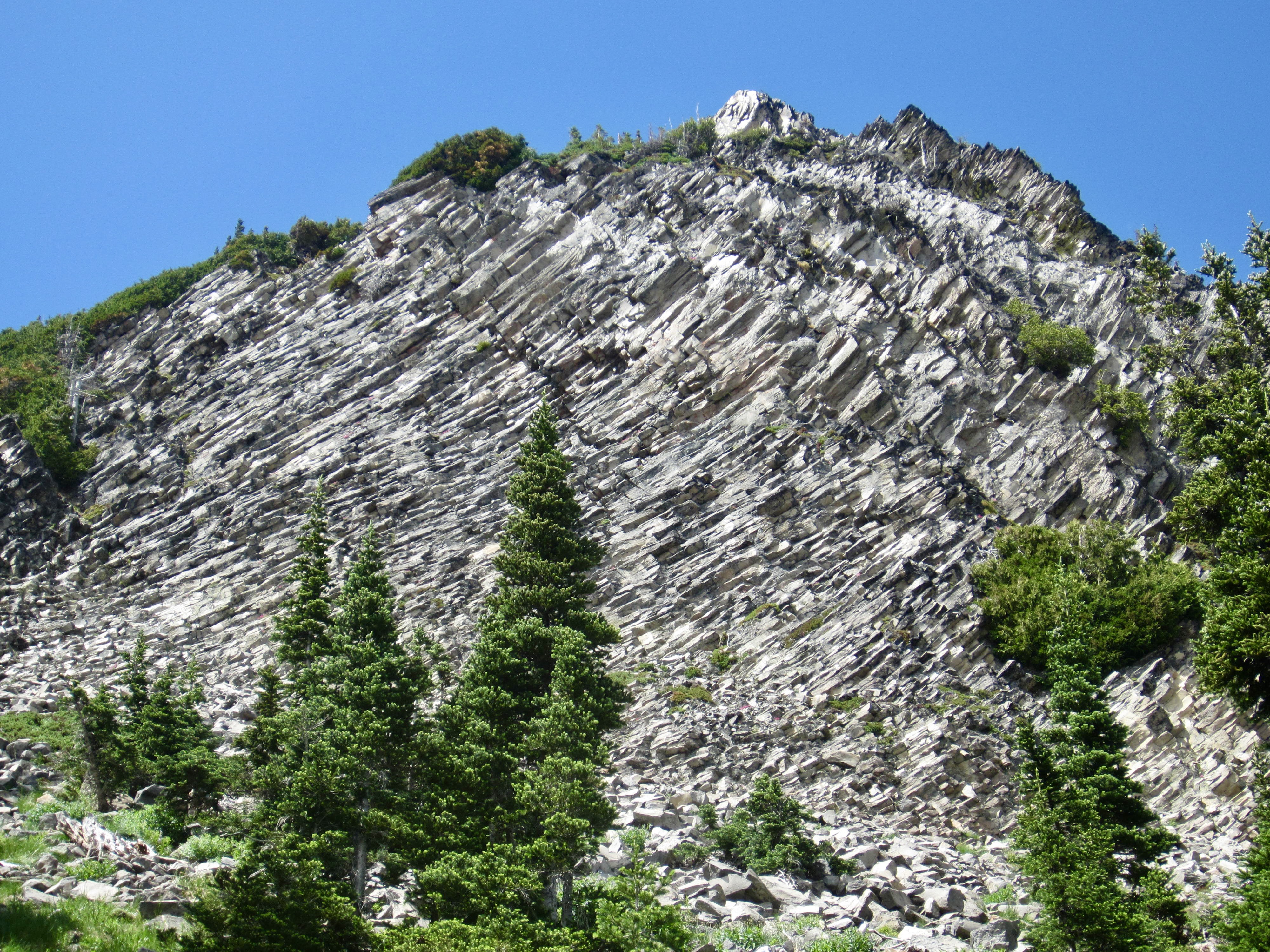 At an elevation of 6400 feet, just before descending a long series of switchbacks, we left the trail and began traversing south toward Glacier Basin. Eileen and I had scoped out this 1-mile traverse route last month, and it appeared to be a good way to get from Burroughs Mountain to Upper Glacier Basin without losing and regaining a lot of elevation. Our high traverse initially took us over a series of scenic grass slopes and benches, passing beneath a tall buttress that exhibited sweeping curves of columnar andesite.