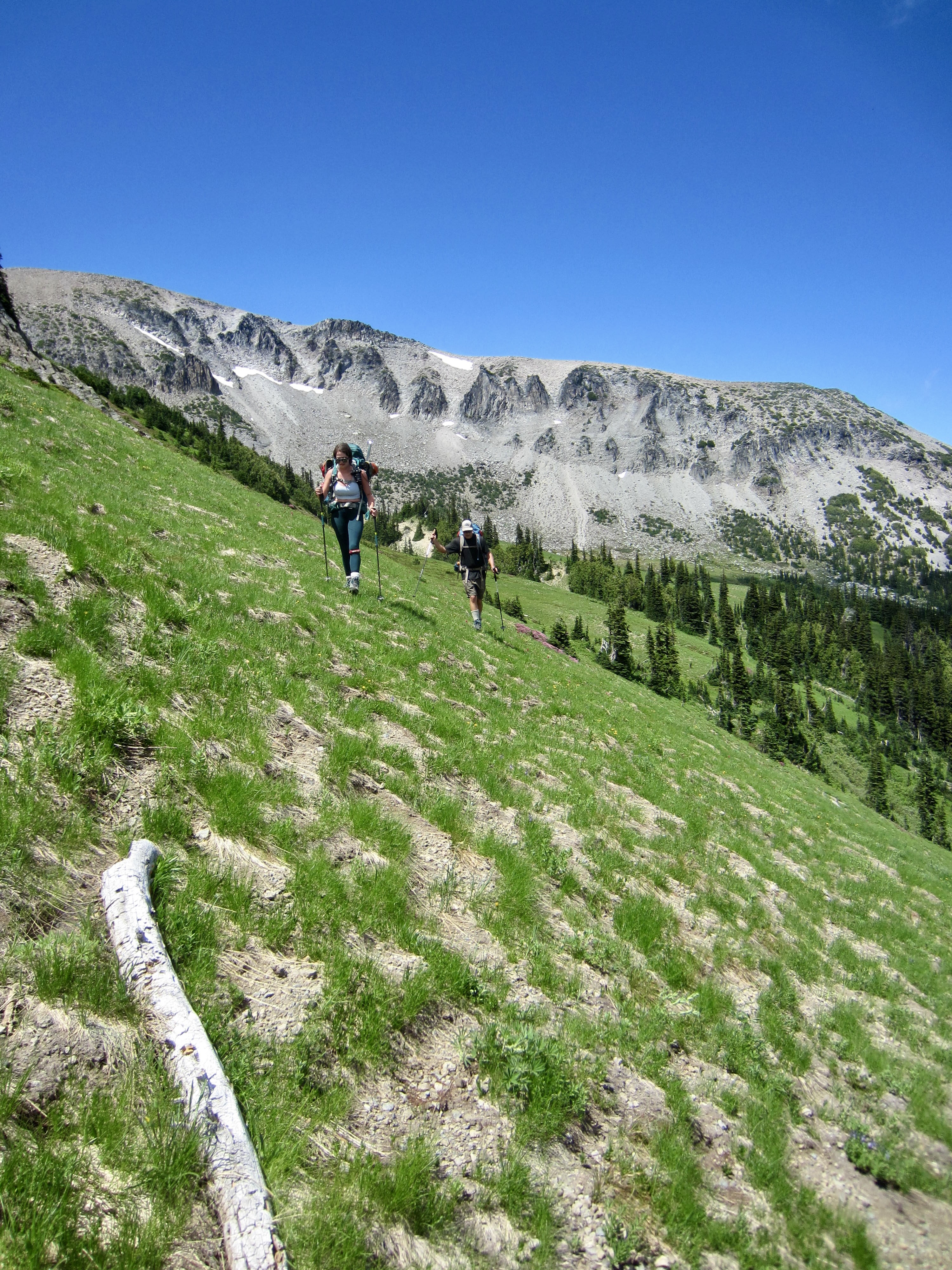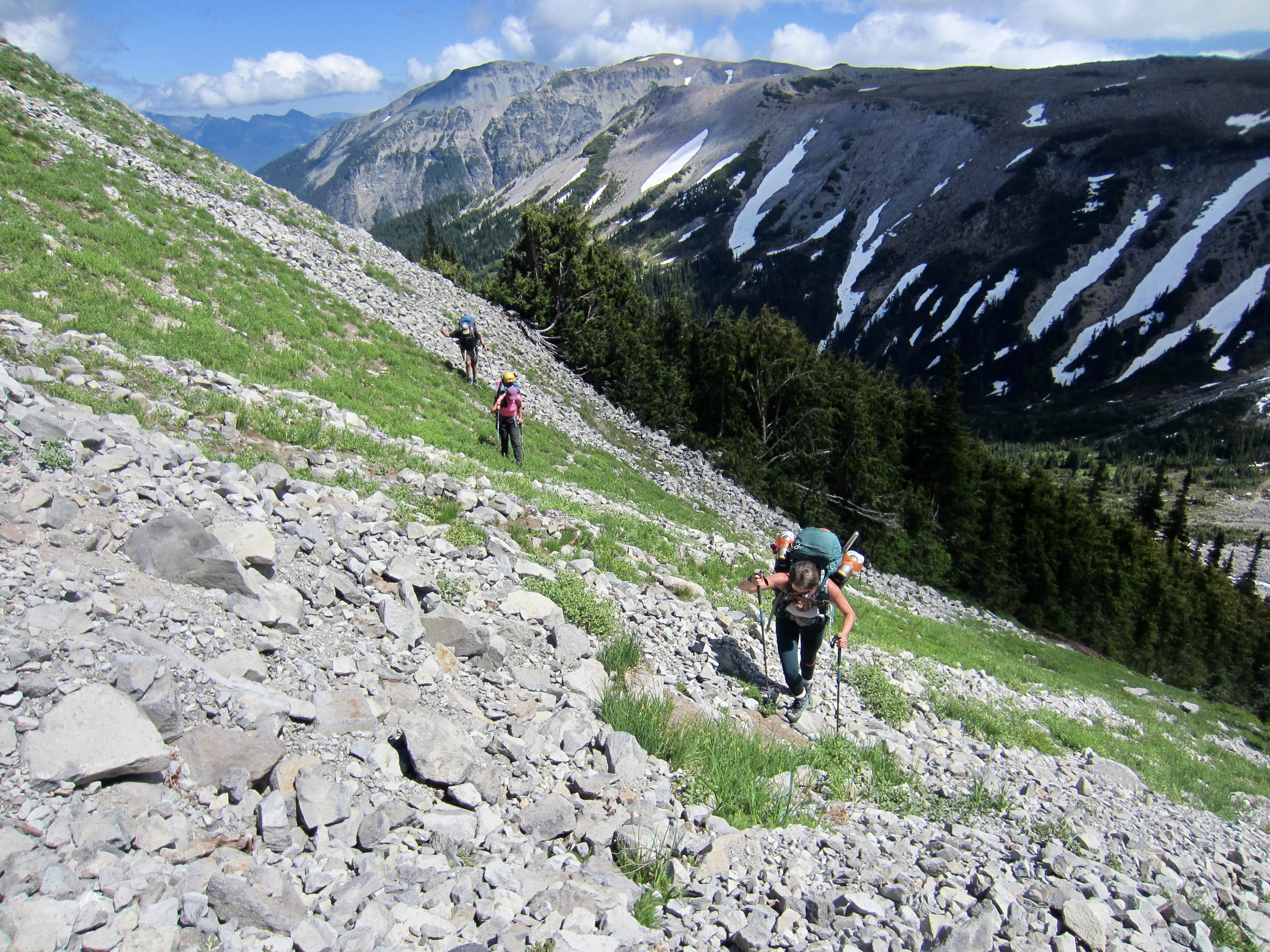 It rained on and off throughout the night, but we awoke at 7:00am to clearing skies and had no more precipitation during the rest of our trip. We broke camp and headed back up the Burroughs Mountain Trail, continuing over Second Burroughs Mountain and down toward Inter Fork Valley.