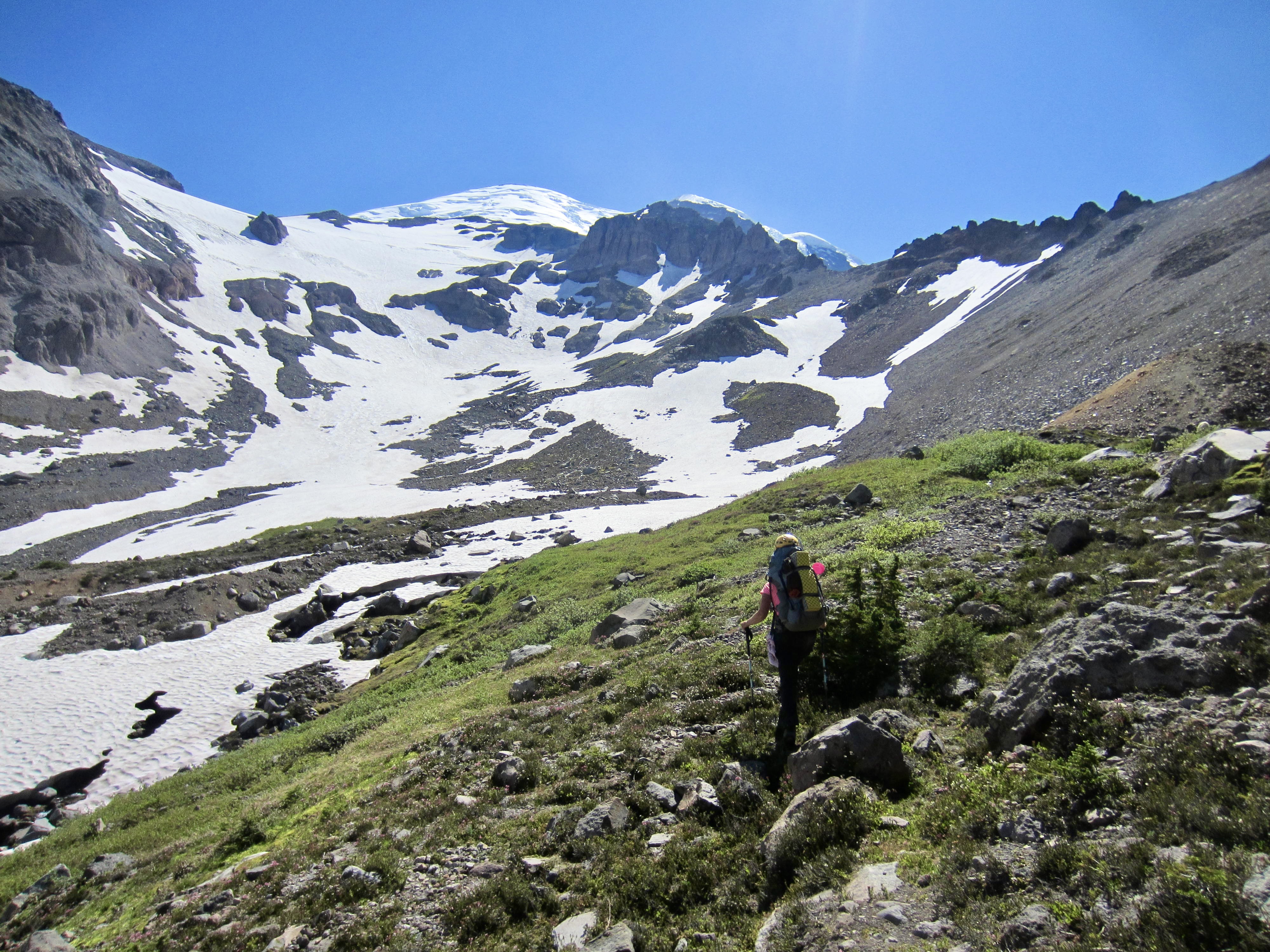 Today was slated to be relatively short and easy, so we slept late and did not get packed up until a bit after noon. From camp, we hiked up the ridge crest 100 yards, contoured over to the left (east) side, and then booted down a muddy slope to reach the Emmons Glacier.