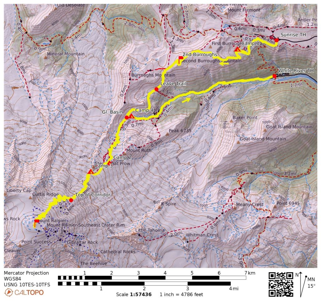 Way Points: Shadow Lake & Sunrise Camp & Emmons Overlook & Second Burroughs Mountain summit & Burroughs Mountain Saddle & Upper Glacier Basin & Inter Glacier & Camp Curtis & Lower Emmons Glacier & Camp Schurman; return via Upper Glacier Basin & Lower Glacier Basin & Inter Fork Valley (trail hike & off-trail hike & snow hike & snow climb)