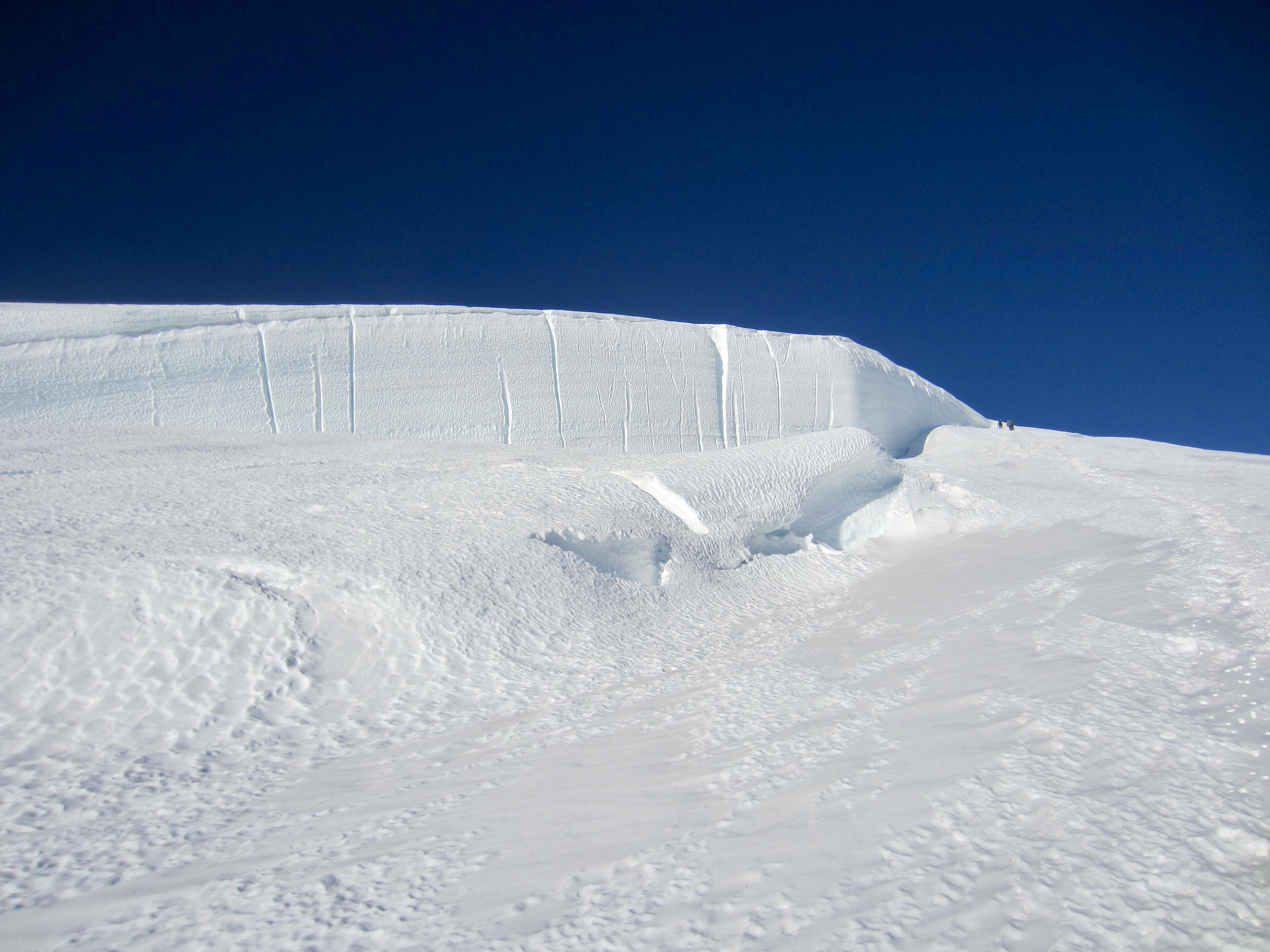 After getting around the headwall, we began ascending the convex summit dome. The gradient eases off here, but the icy crust was even harder that ever and required careful footwork.