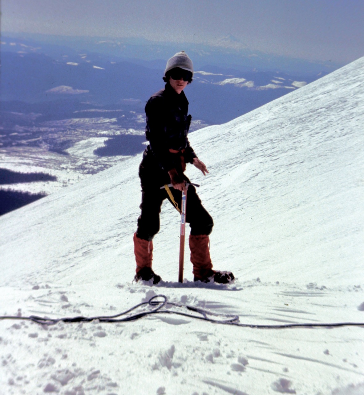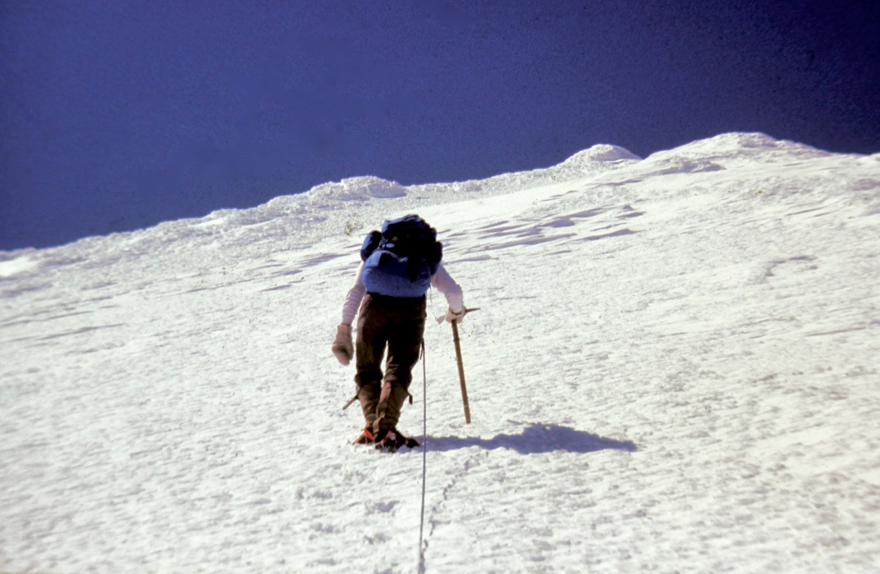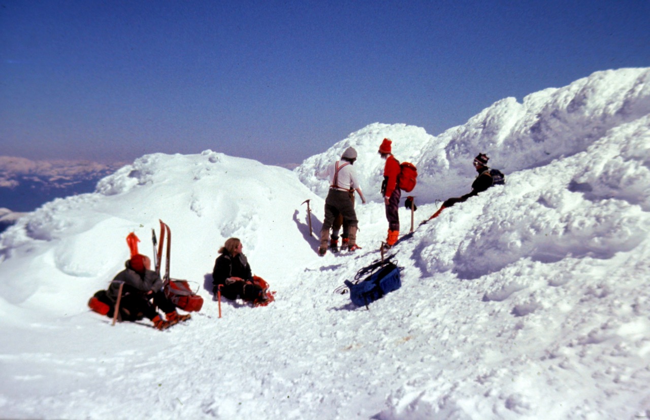 On a gorgeous bluebird morning during Spring Break of 1975, I climbed Mt. St. Helens with a large group from Wenatchee High School. The climb was led by Bill Asplund—a WHS teacher, Alpine Club coordinator, veteran mountaineer, and enthusiastic mentor. Our arsenal of equipment and clothing included steel crampons, wooden-shaft ice axes, cotton-based “60/40” parkas, wool knickers, and fuzzy balaclavas.