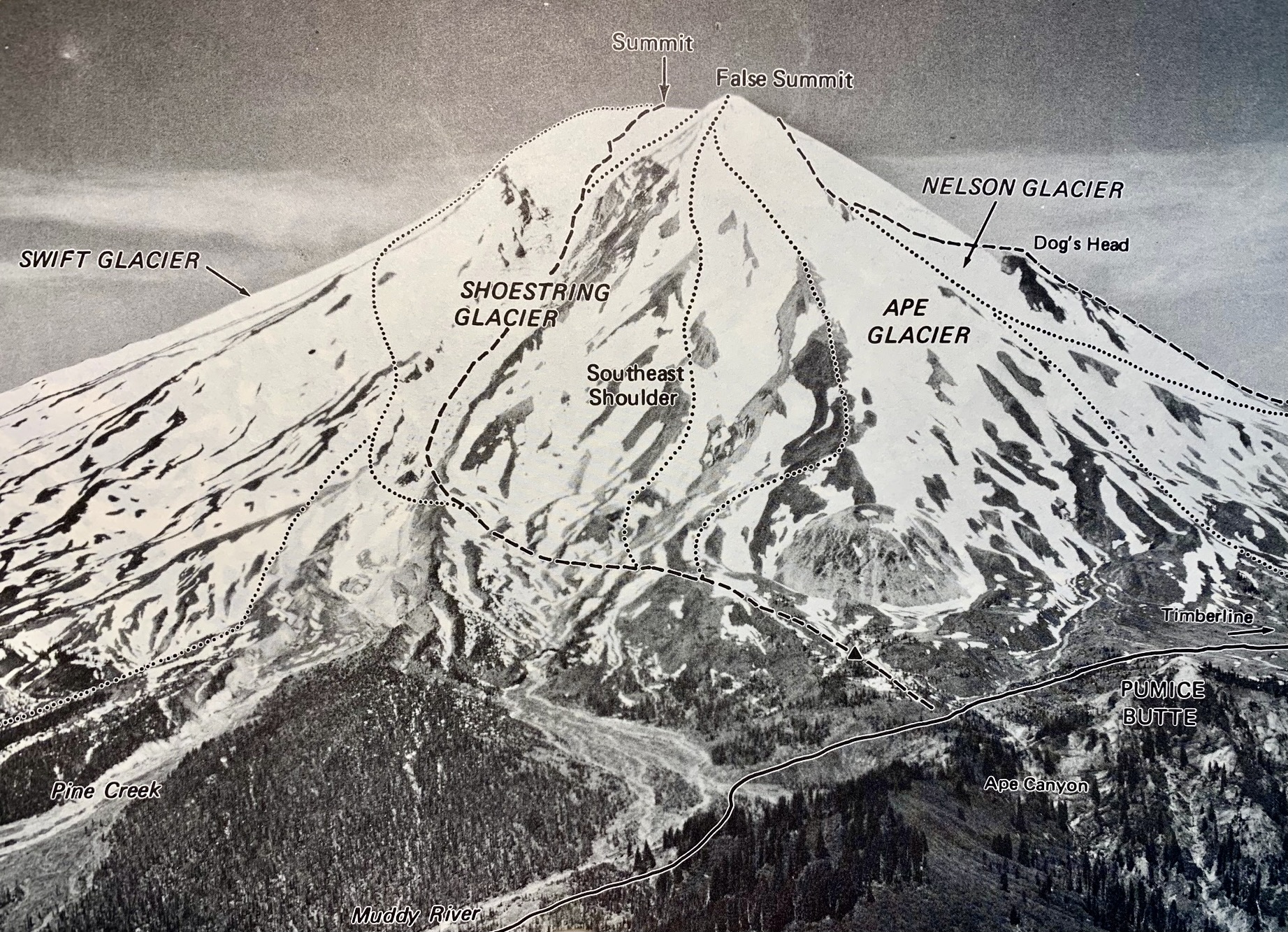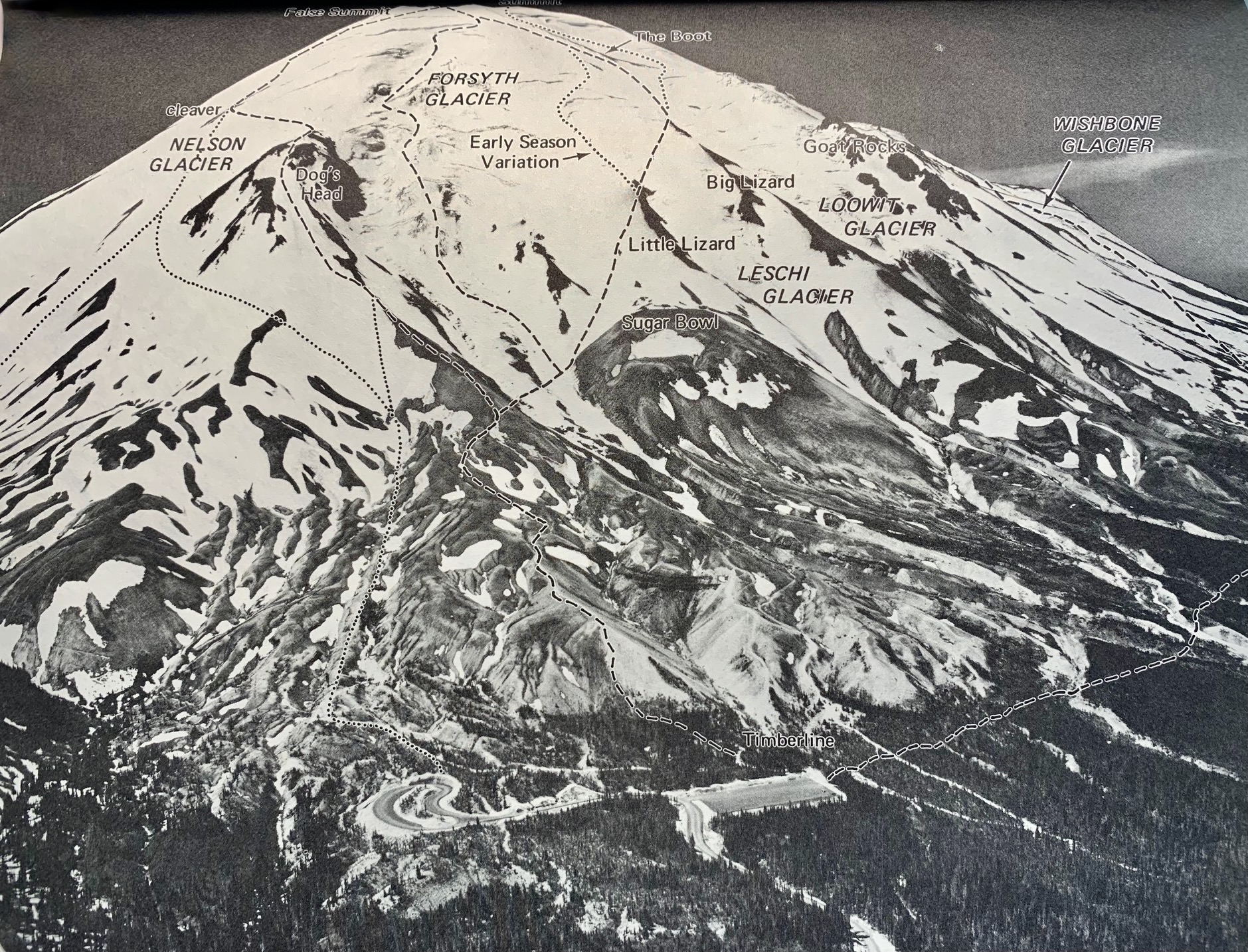Starting from the plowed loop road in Timberline Campground, we cramponed up crusty snow to a distinctive rock outcrop called The Dog’s Head. This lower snowfield was not crevassed, so it was not necessary to rope up.