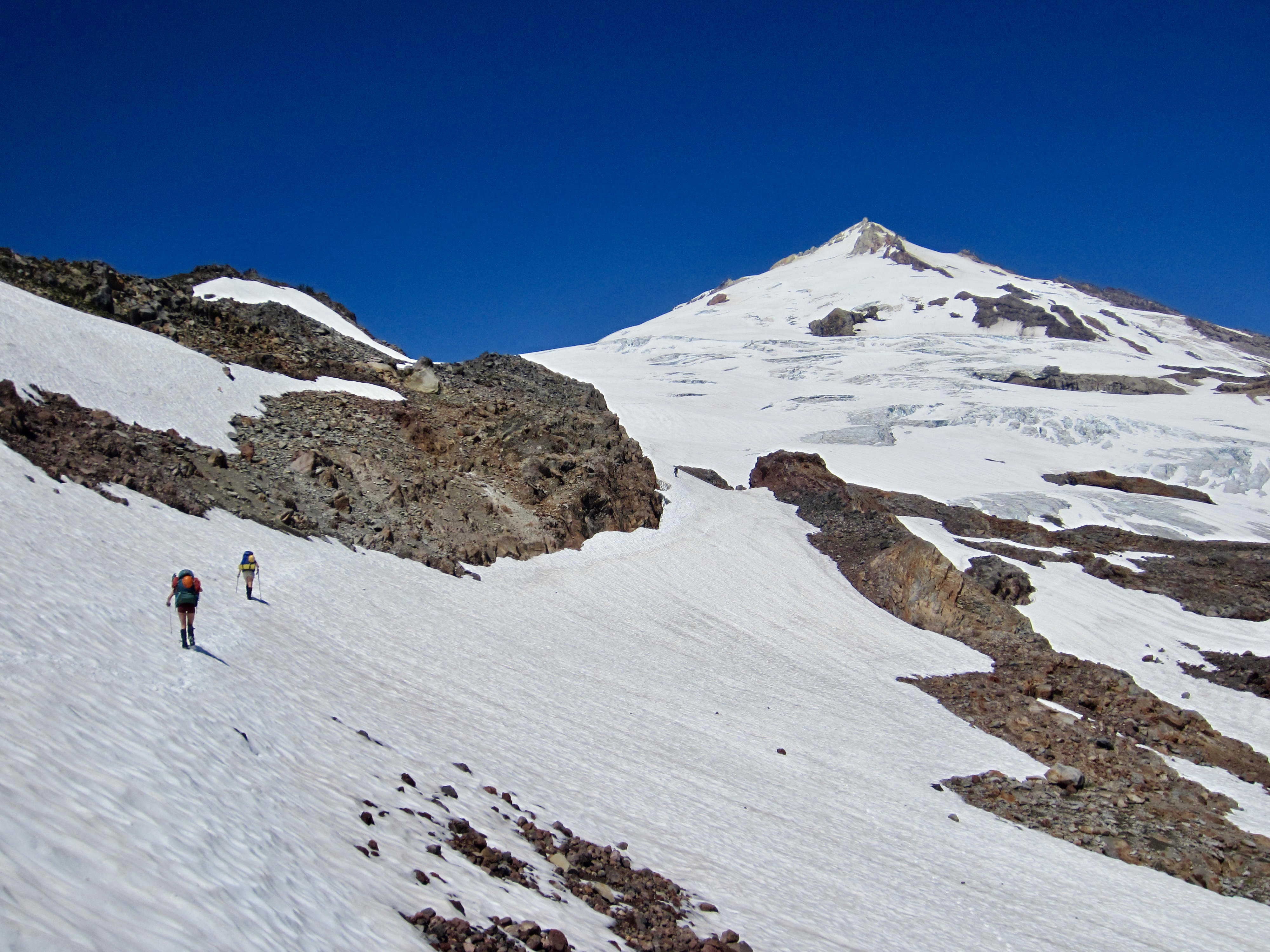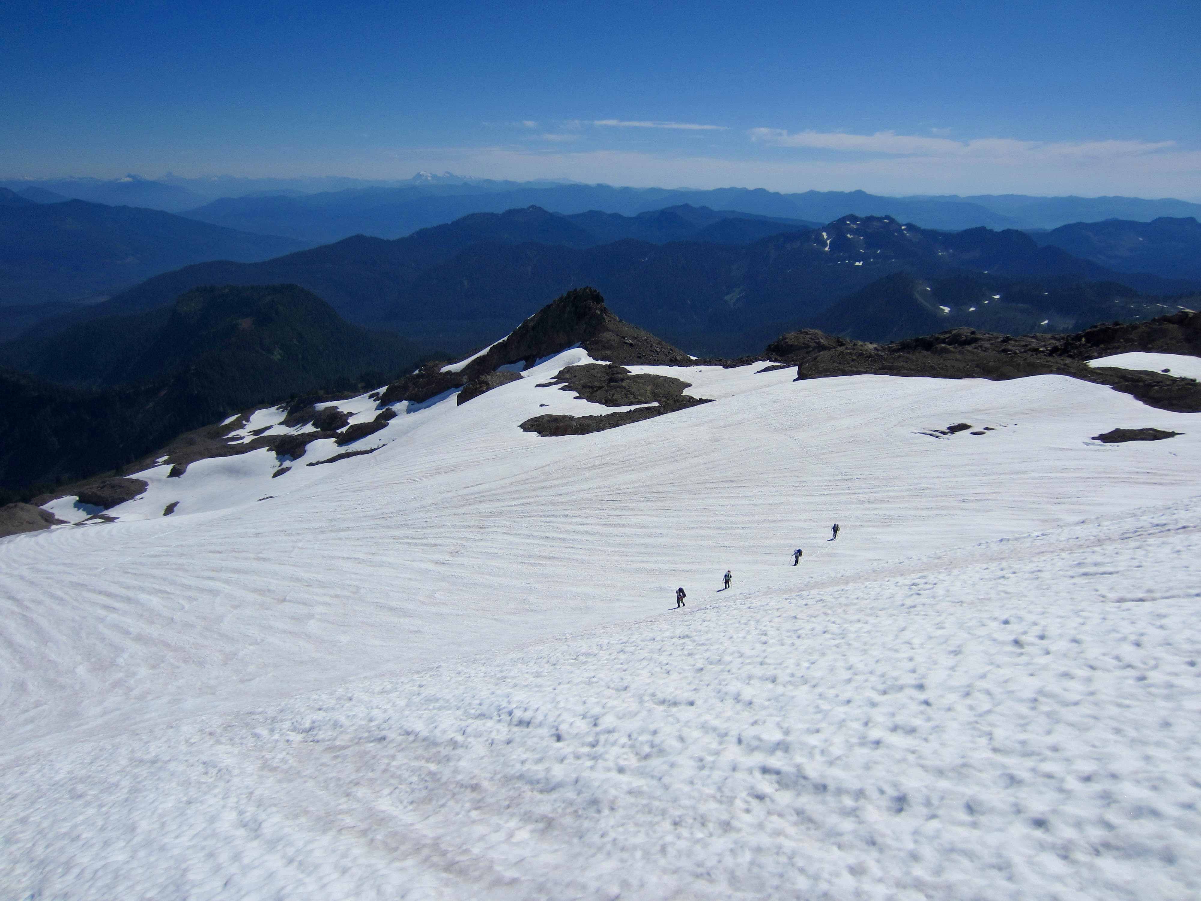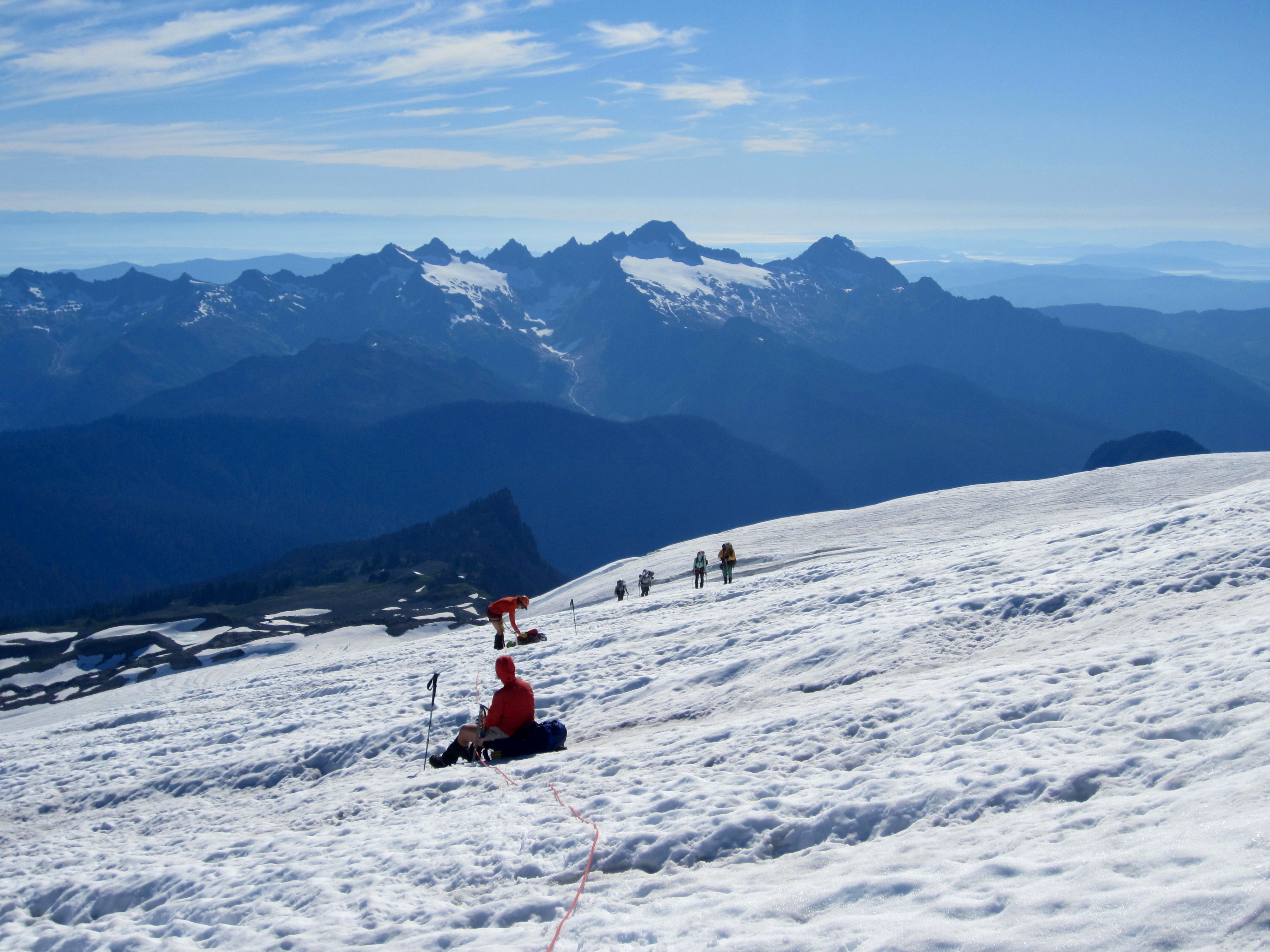 Views increased as the path gained elevation and eventually ended at a snowfield below Crag View. We donned crampons and continued up to a 6500-foot saddle at the base of the Squak Glacier.