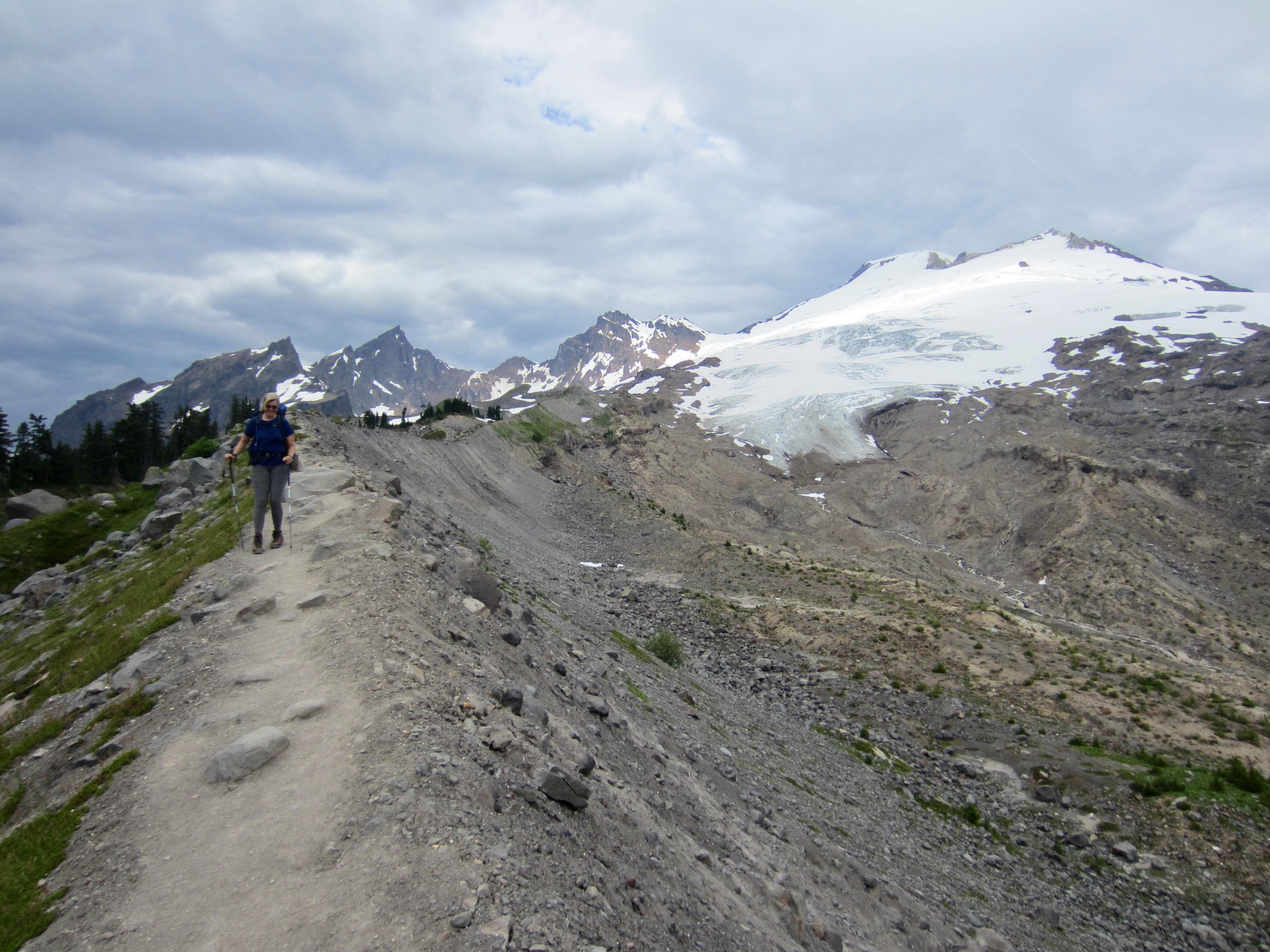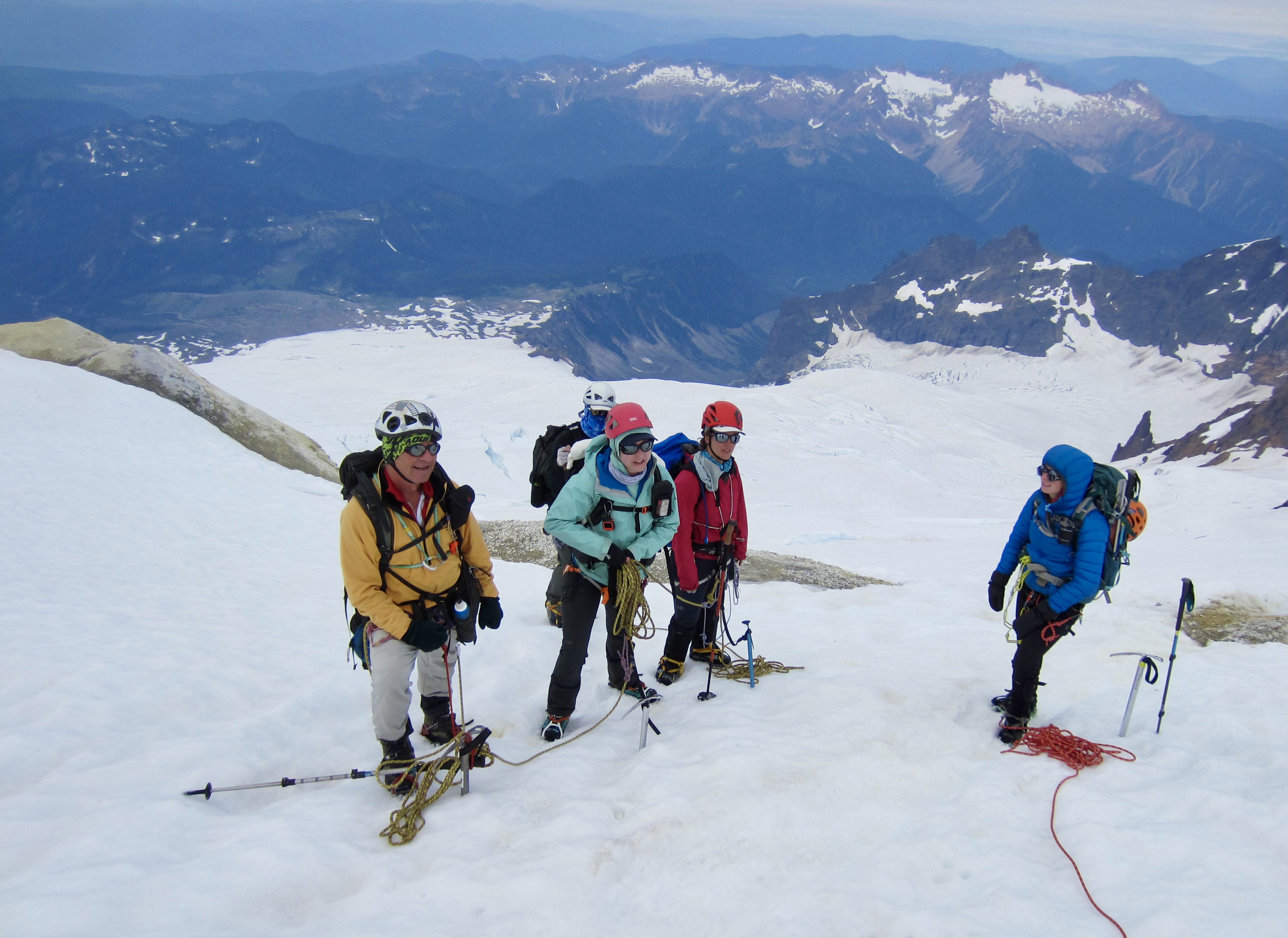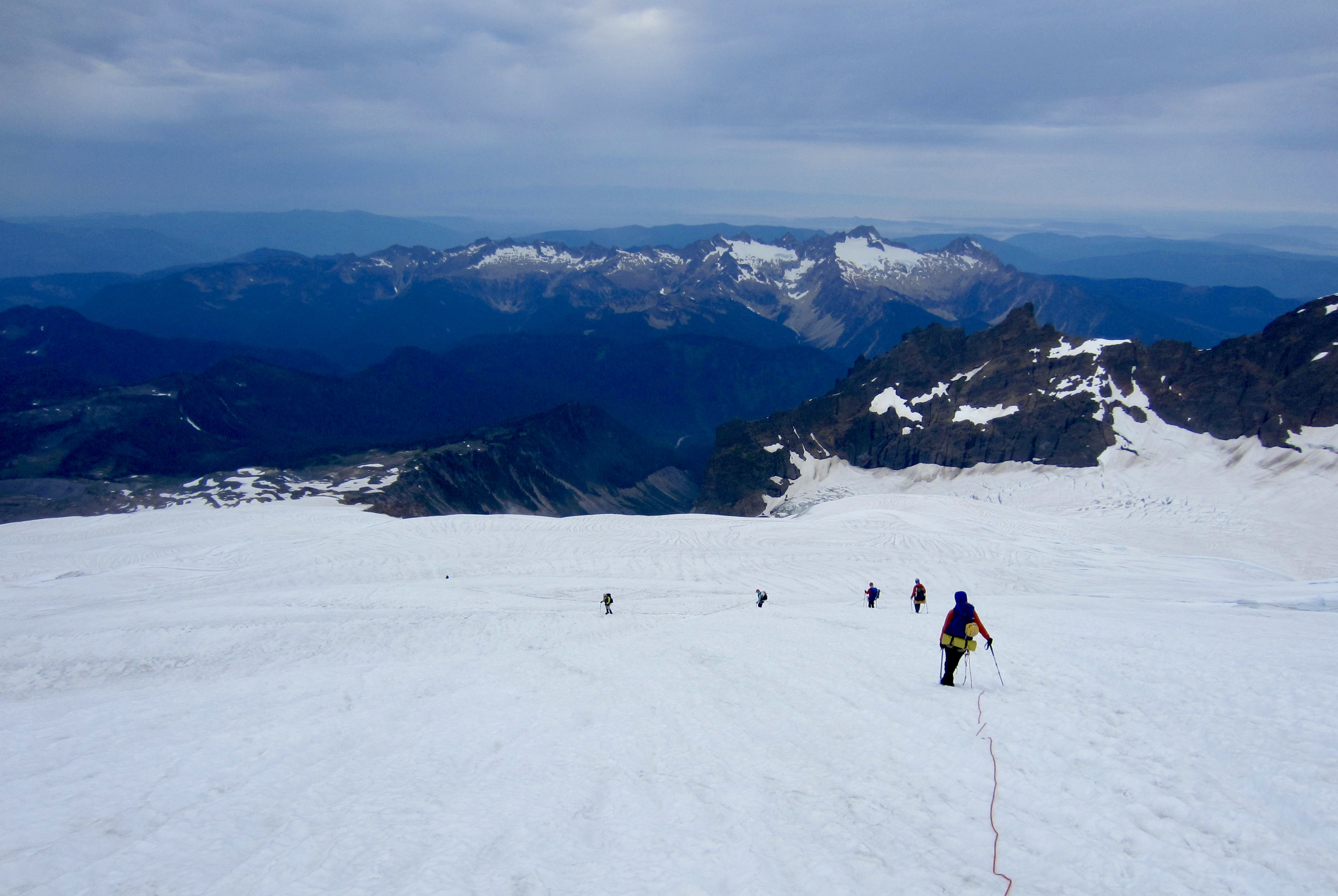 Views increased as the path gained elevation and eventually ended at a snowfield below Crag View. We donned crampons and continued up to a 6500-foot saddle at the base of the Squak Glacier.