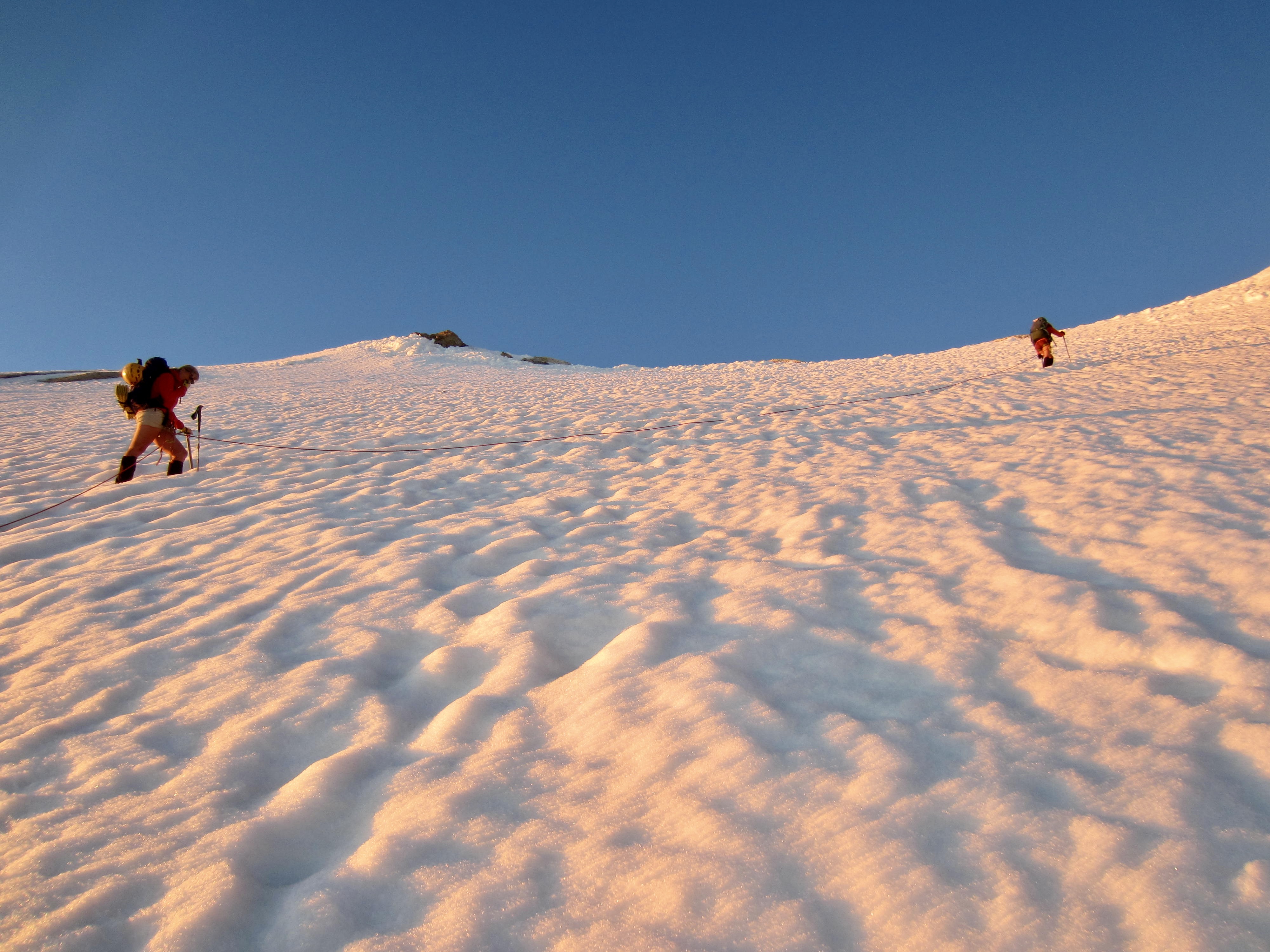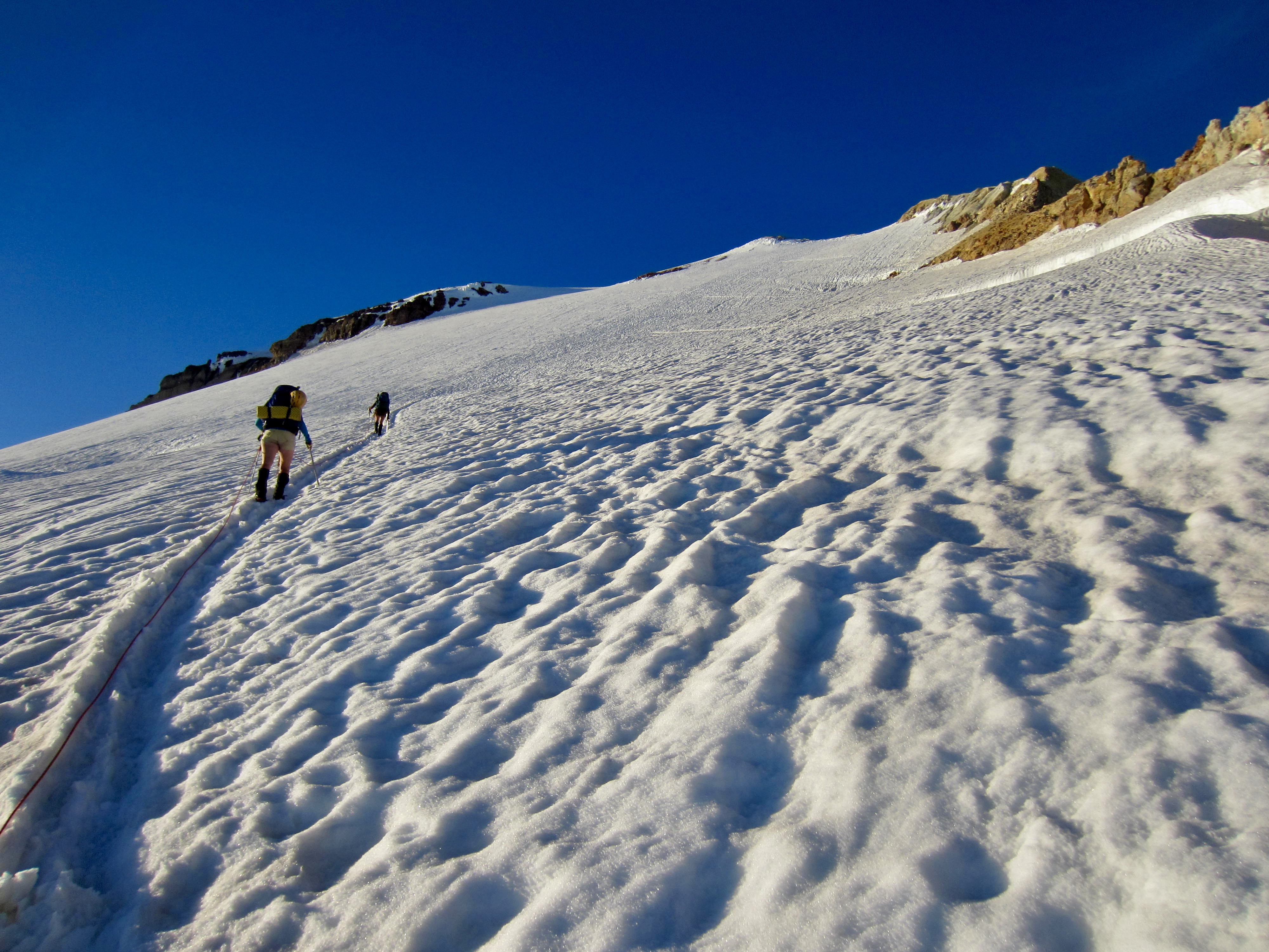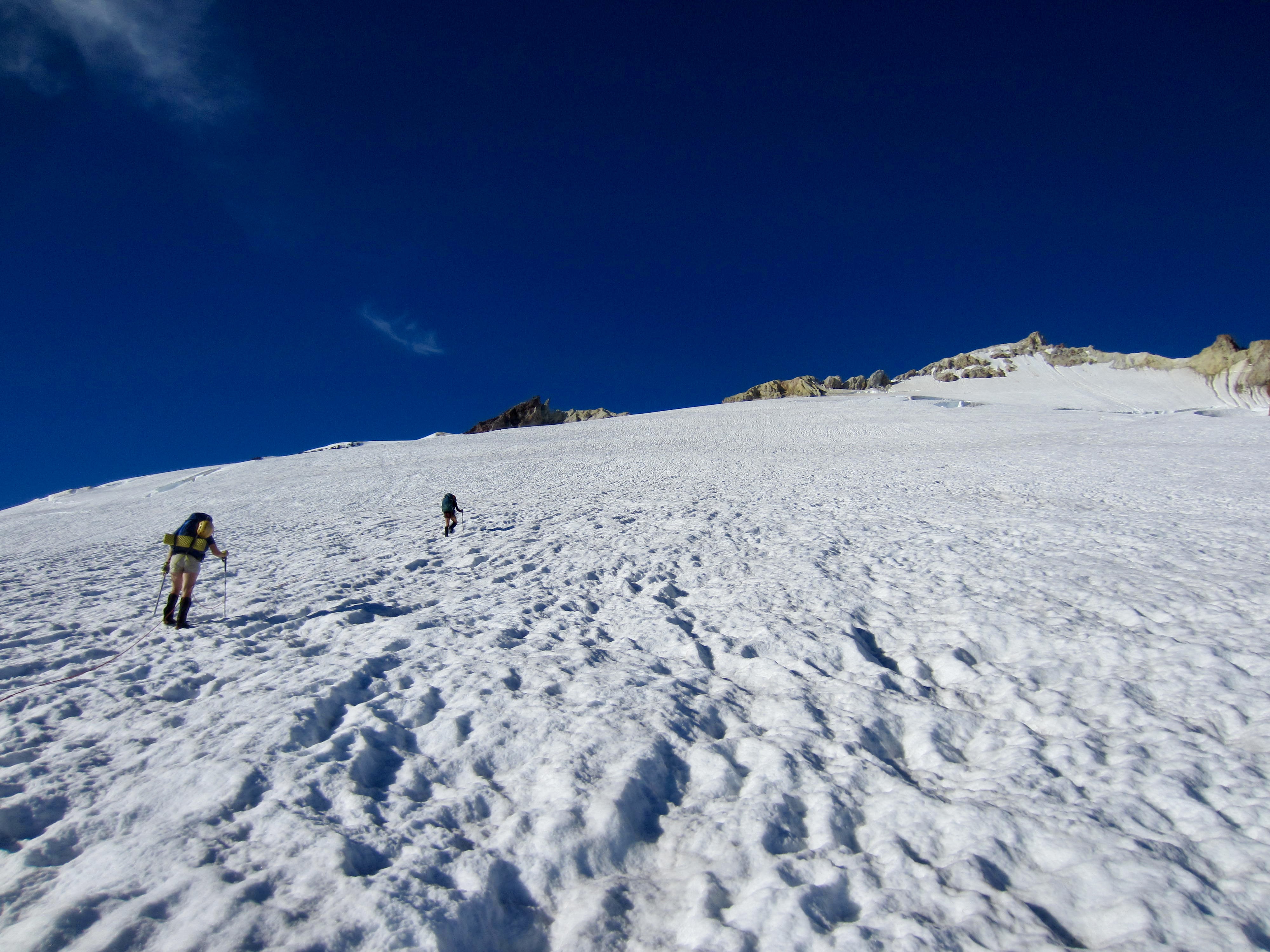 Overall, snow conditions were very good and crevasse navigation was relatively straightforward. However, the beating sun and calm air made for an uncomfortably hot ascent.