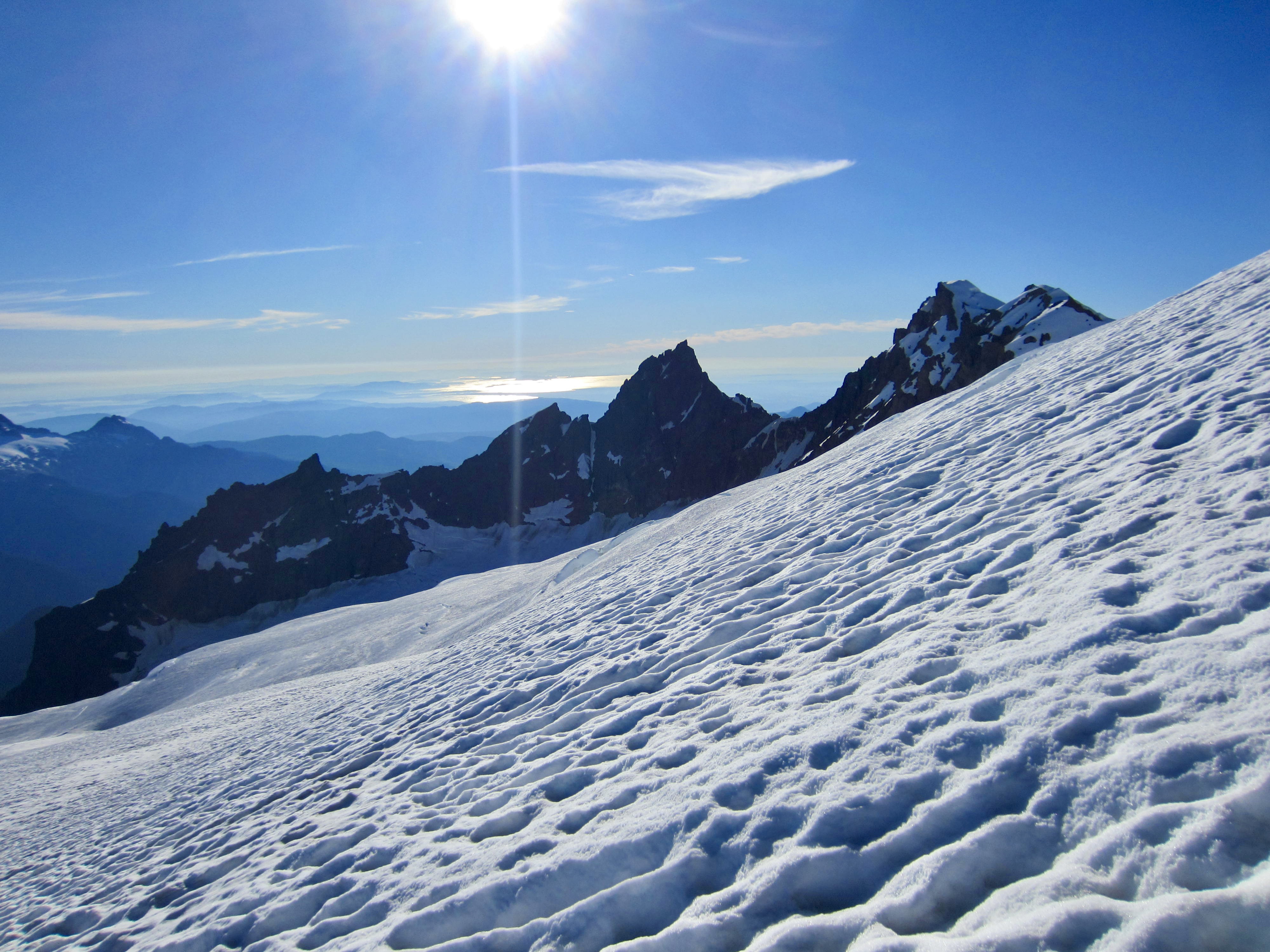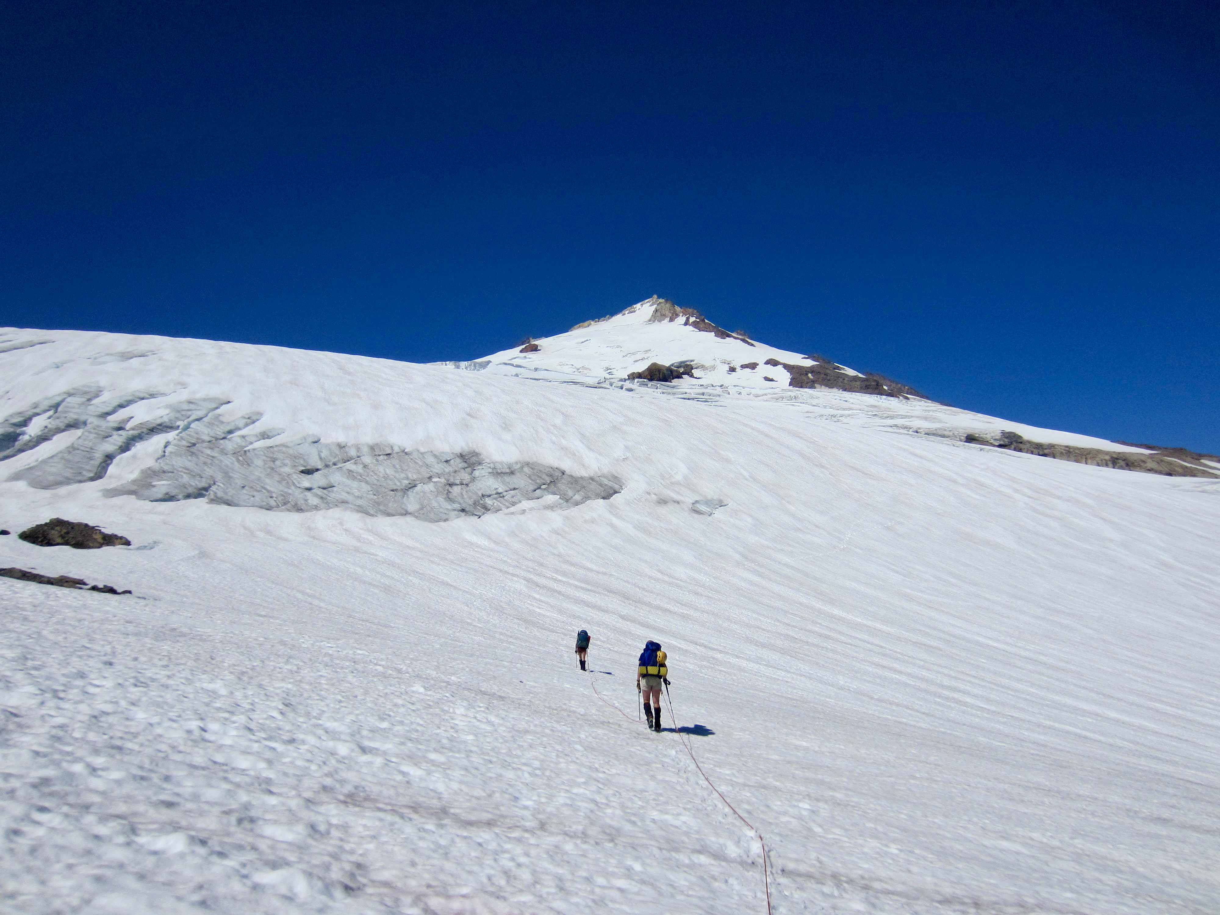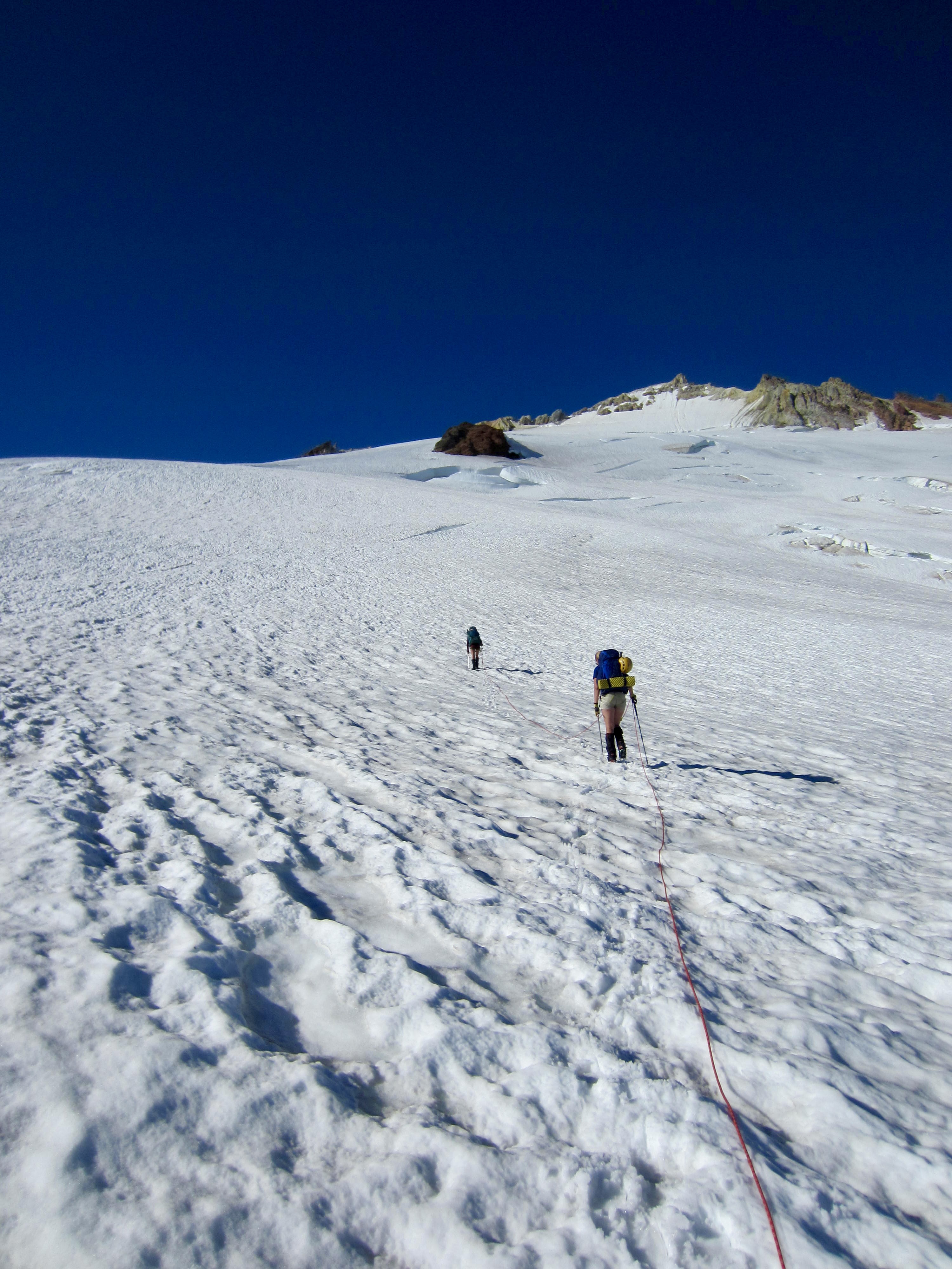 Overall, snow conditions were very good and crevasse navigation was relatively straightforward. However, the beating sun and calm air made for an uncomfortably hot ascent.