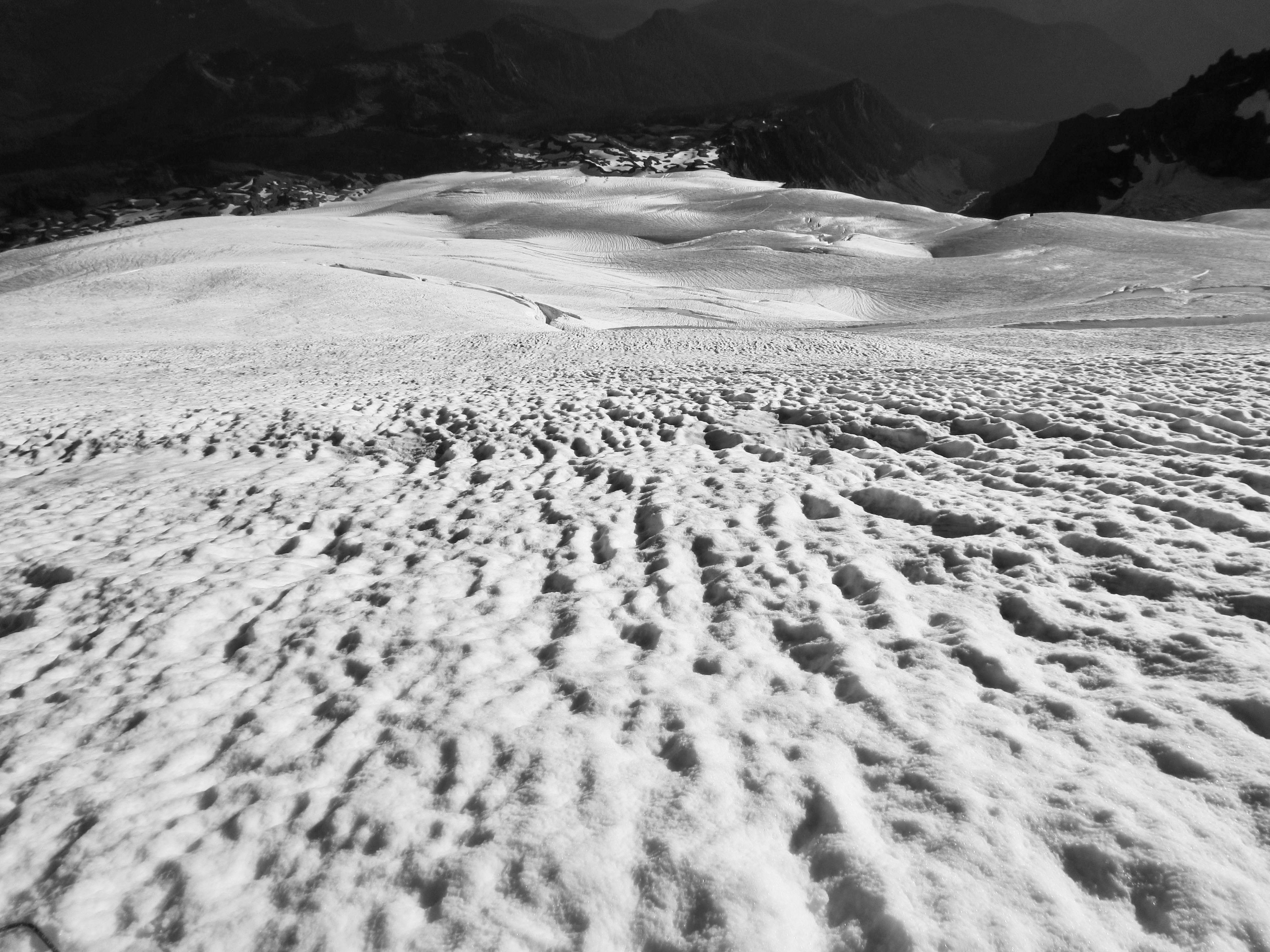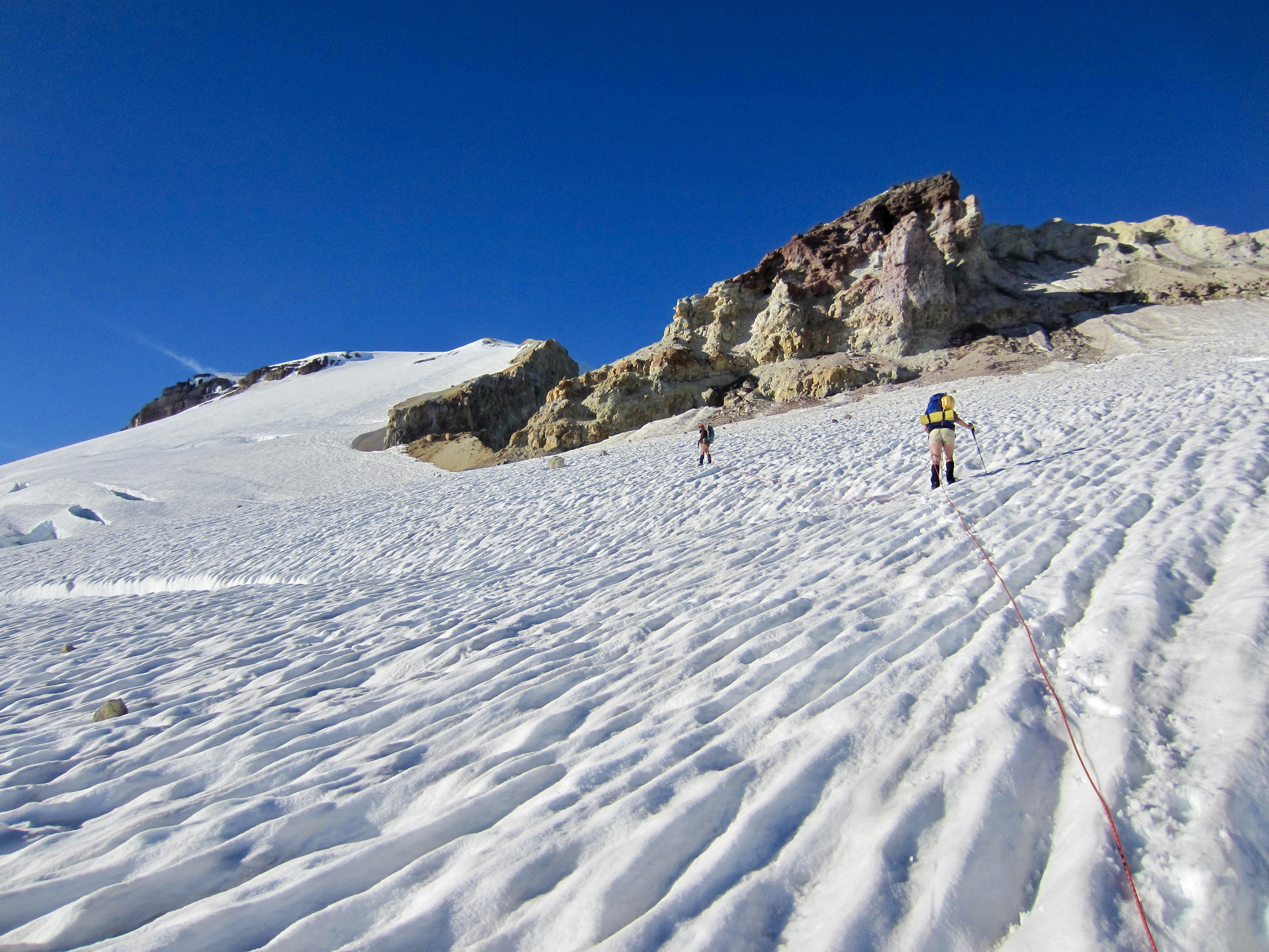 For our glacier ascent, Brooke, Eileen, and I formed one rope team, while Doug, Elizabeth, Ellen, and Erik formed another rope team. Brooke led up the glacier on a due-north course, weaving through scattered crevasses.