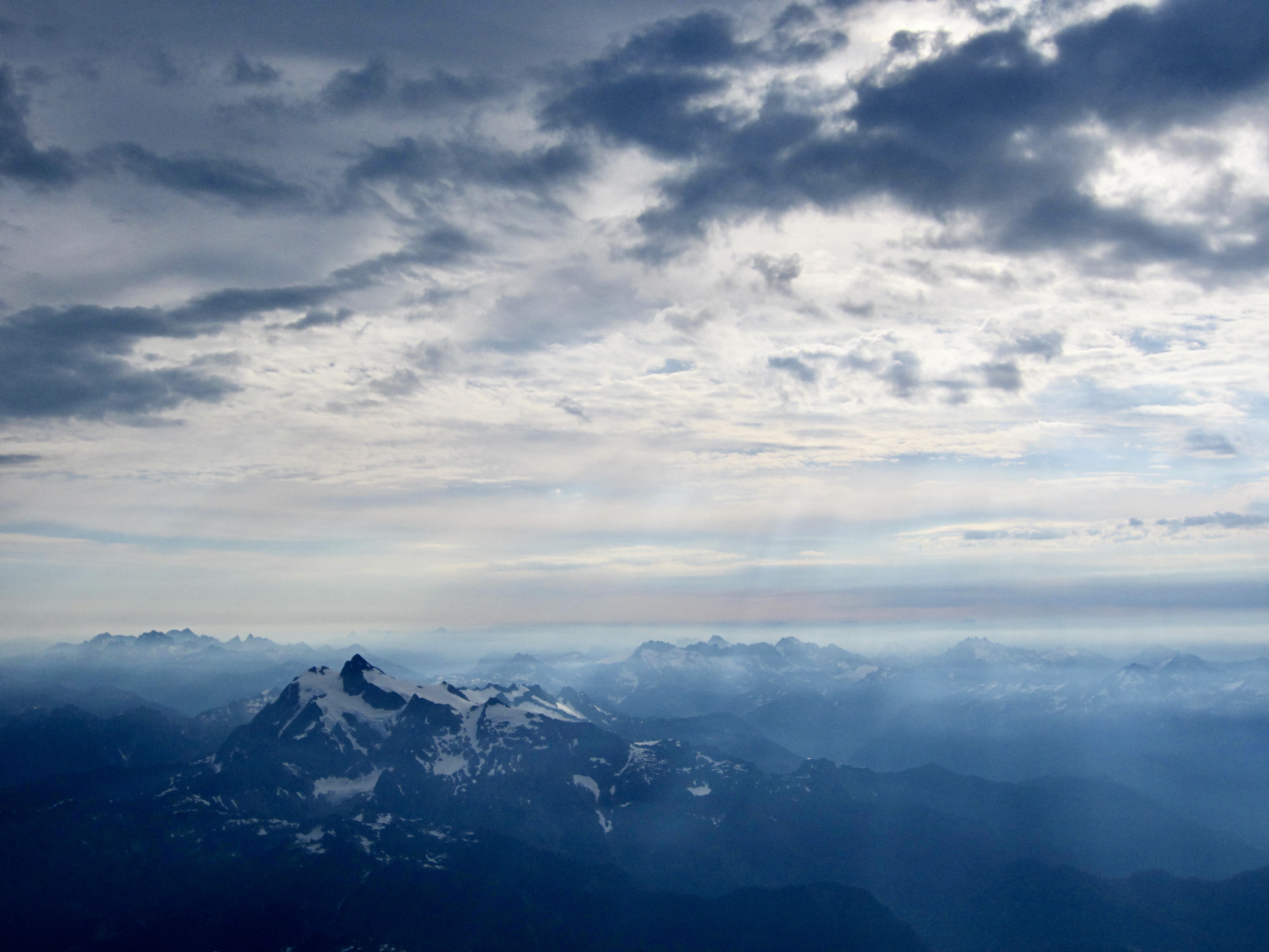 This was a very satisfying summit for Eileen and Brooke, who had been coveting Mt. Baker for several years (Brooke) or several decades (Eileen). We were surrounded by building clouds, which threatened us with possible rain but added extra texture to the scenery.