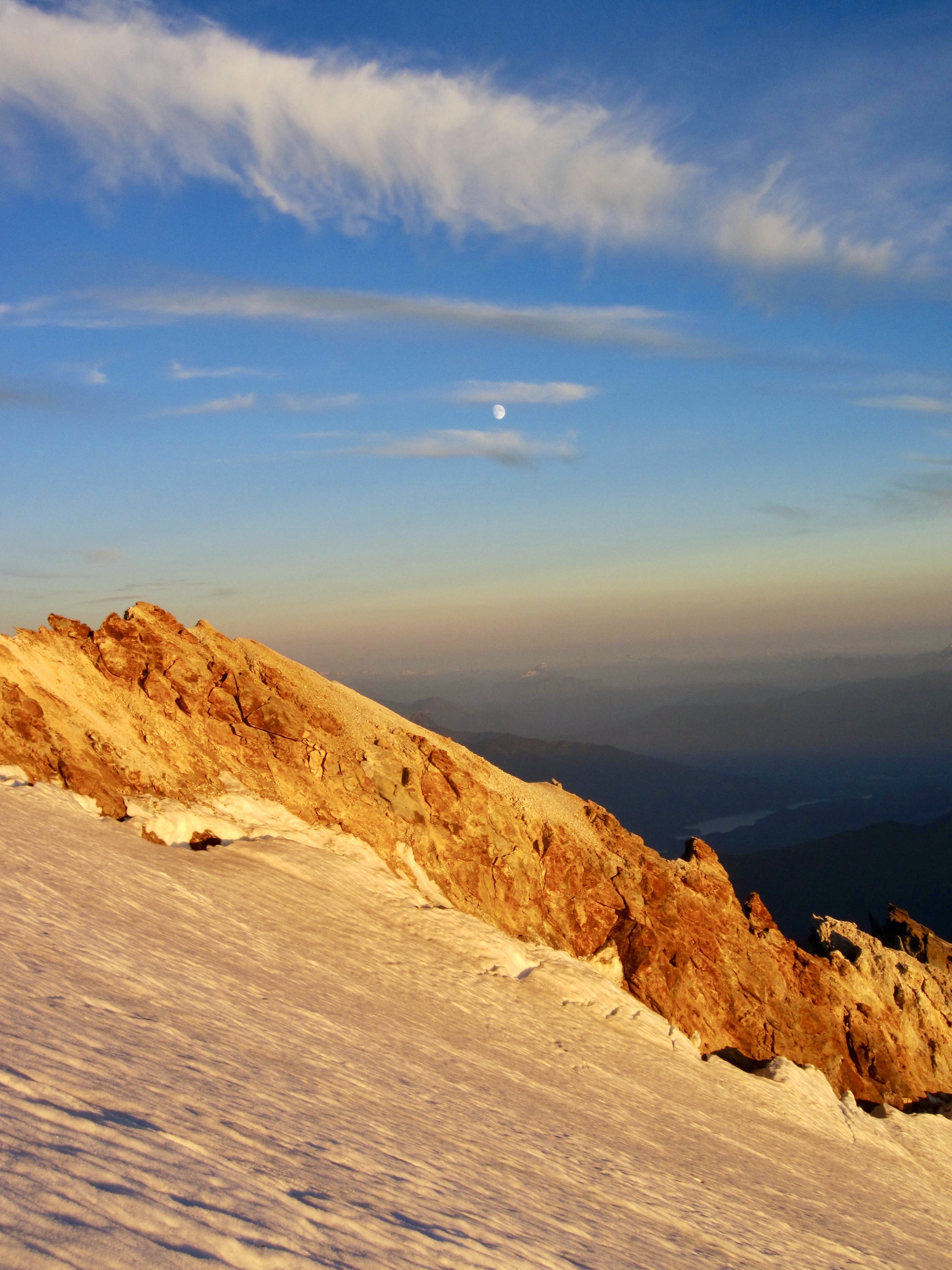 The sun had dipped below the horizon by the time we reached the top of the Roman Wall and stepped onto the summit plateau. It was now a race to locate a suitable campsite before dark. We hurried across the plateau and found a flat area between the summit cone and snow dome at 9:00pm (12.3 hours + 7400 feet from TH). In the last minutes of twilight, with a stiff wind kicking up, we pitched our tent and piled in.