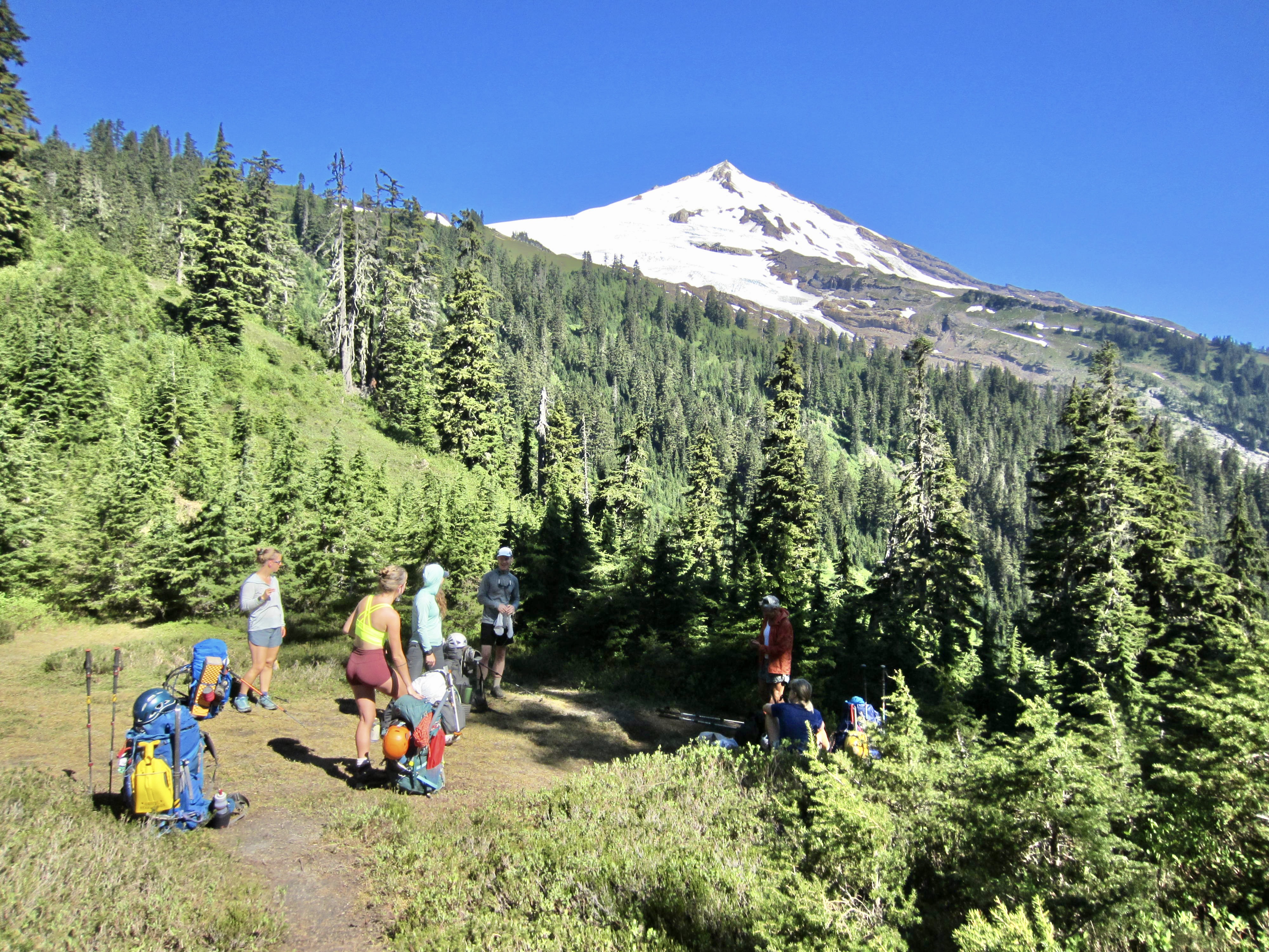 Starting at the Schrieber’s Meadow Trailhead on a warm, sunny Monday morning, our group of seven headed up the right-hand fork of the Scott Paul Trail. By the time everyone reached a 4600-foot ridge saddle, it was hot and buggy. We then branched off on a well-trodden climber’s path that went steeply upward through open meadows.