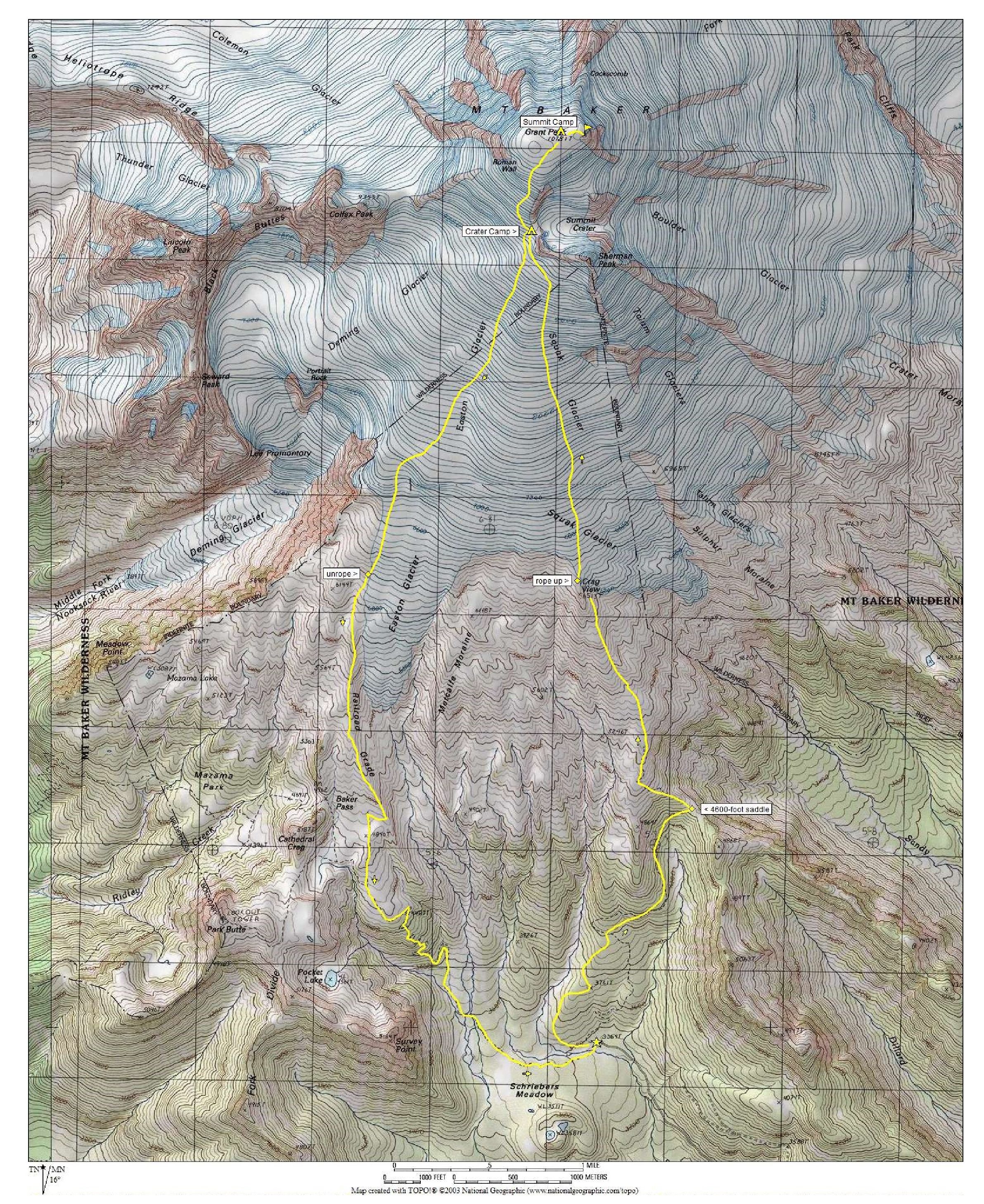 Loop Way Points: 4600-foot saddle & Crag View saddle (trail hike & snow hike); west crater saddle & Mt. Baker summit plateau & west crater saddle & Easton Ridge (snow climb); Railroad Grade & Rocky Creek crossing & Schriebers Meadow (trail hike)
