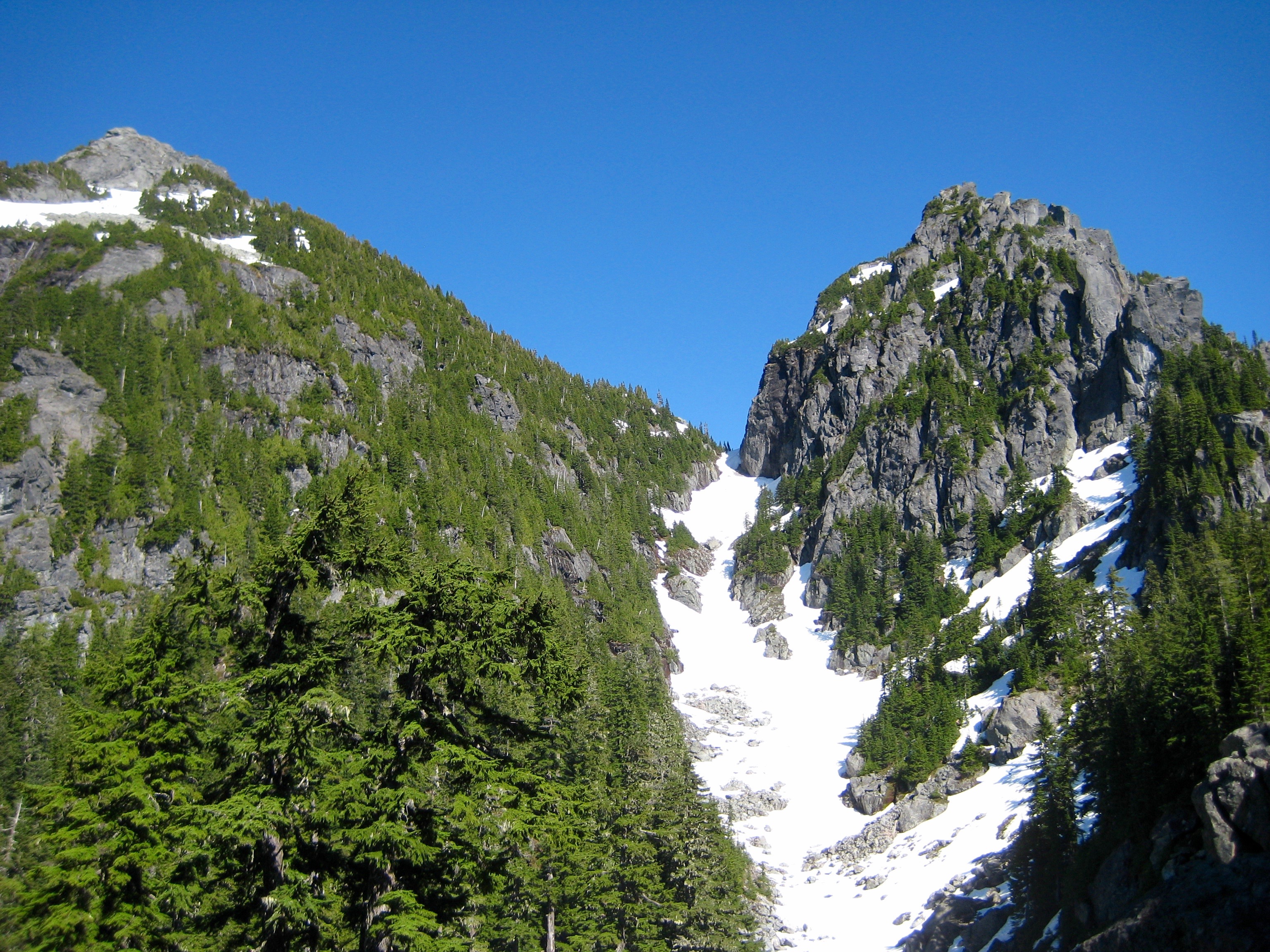 From Baring Col between the main and south peaks, we climbed steep snow, then scrambled up through trees and talus on the south ridge. Views were gained only in the last several hundred feet below the summit.