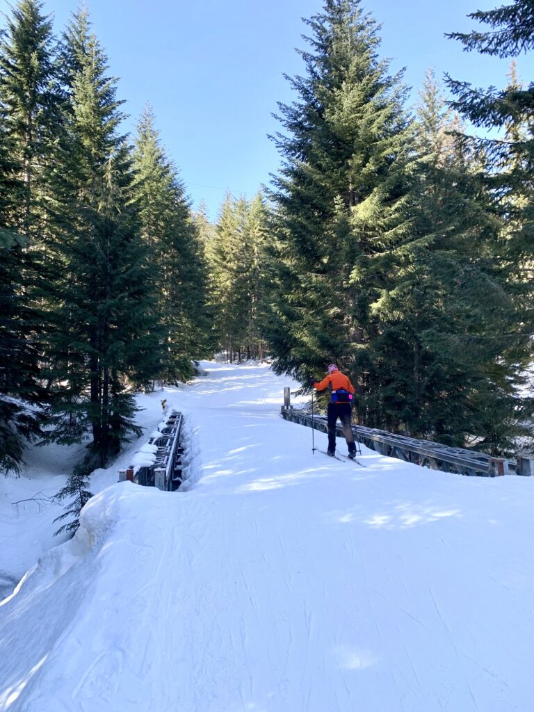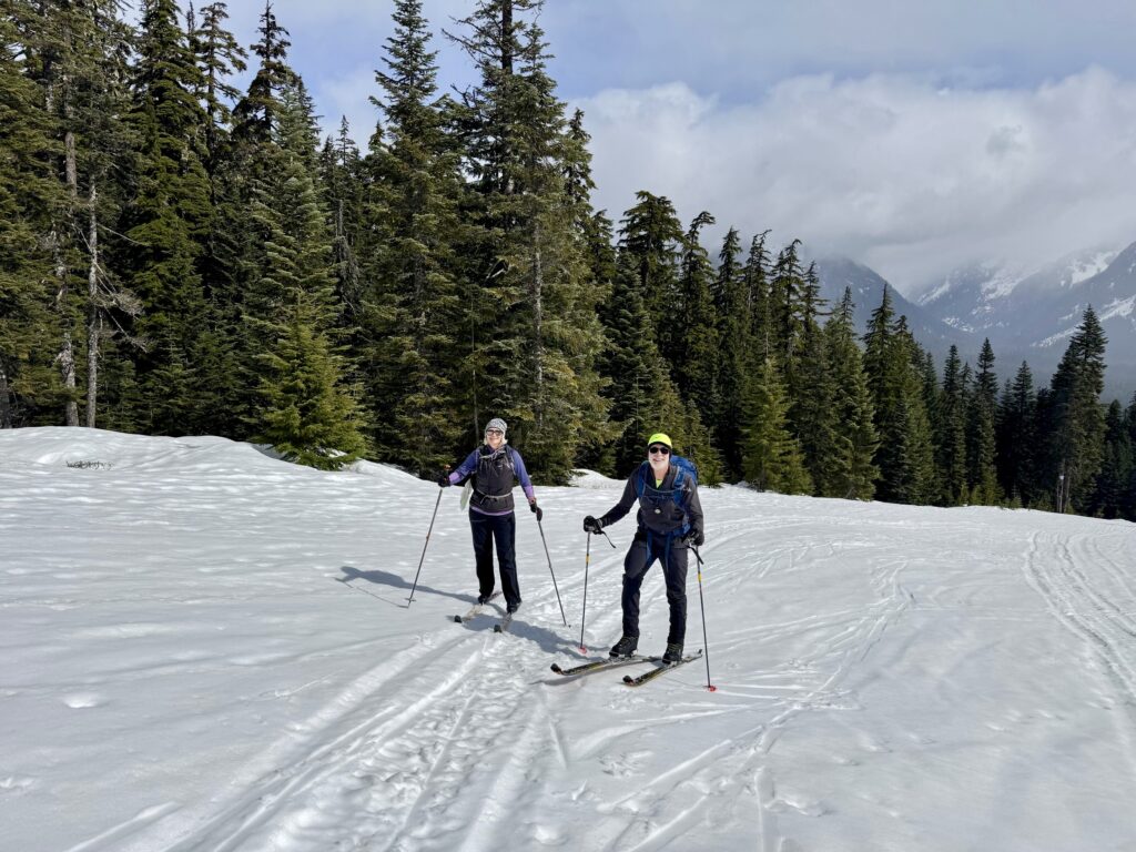 For the full loop, my preferred all-purpose ski has a full metal edge, a fishscale base, and a width between 60mm and 65mm. This cross-country/backcountry (XC/BC) hybrid nordic ski will fit in the grooves of a groomed ski track but is also capable of handling everything from hard crust to deep powder. I mate these skis with NNN-BC boots and bindings, which provide more control and robustness. In addition, I carry short “kicker skins” for skiing uphill on icy snow. I also use adjustable ski poles, which can be shortened for the climbs and lengthened for the flats and descents.