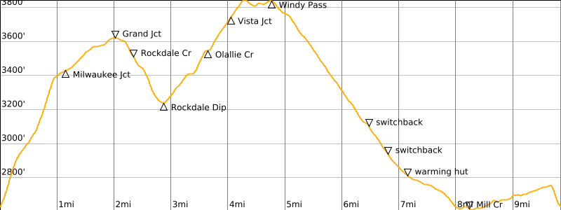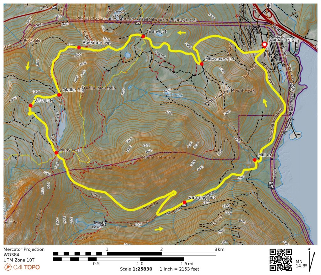Way Points: Creek Run ski trail junction & Milwaukee Junction & Grand Junction & Rockdale Creek culvert & Rockdale Dip & Olallie Creek culvert & Vista Junction & Windy Pass & Jim Brooks Warming Hut & Mill Creek Bridge & Hyak Ski Area (ski tour via Creek Run Trail—Milwaukee Ridge Trail—Sunrise Trail—Ripsaw Trail—Cold Creek Trail)